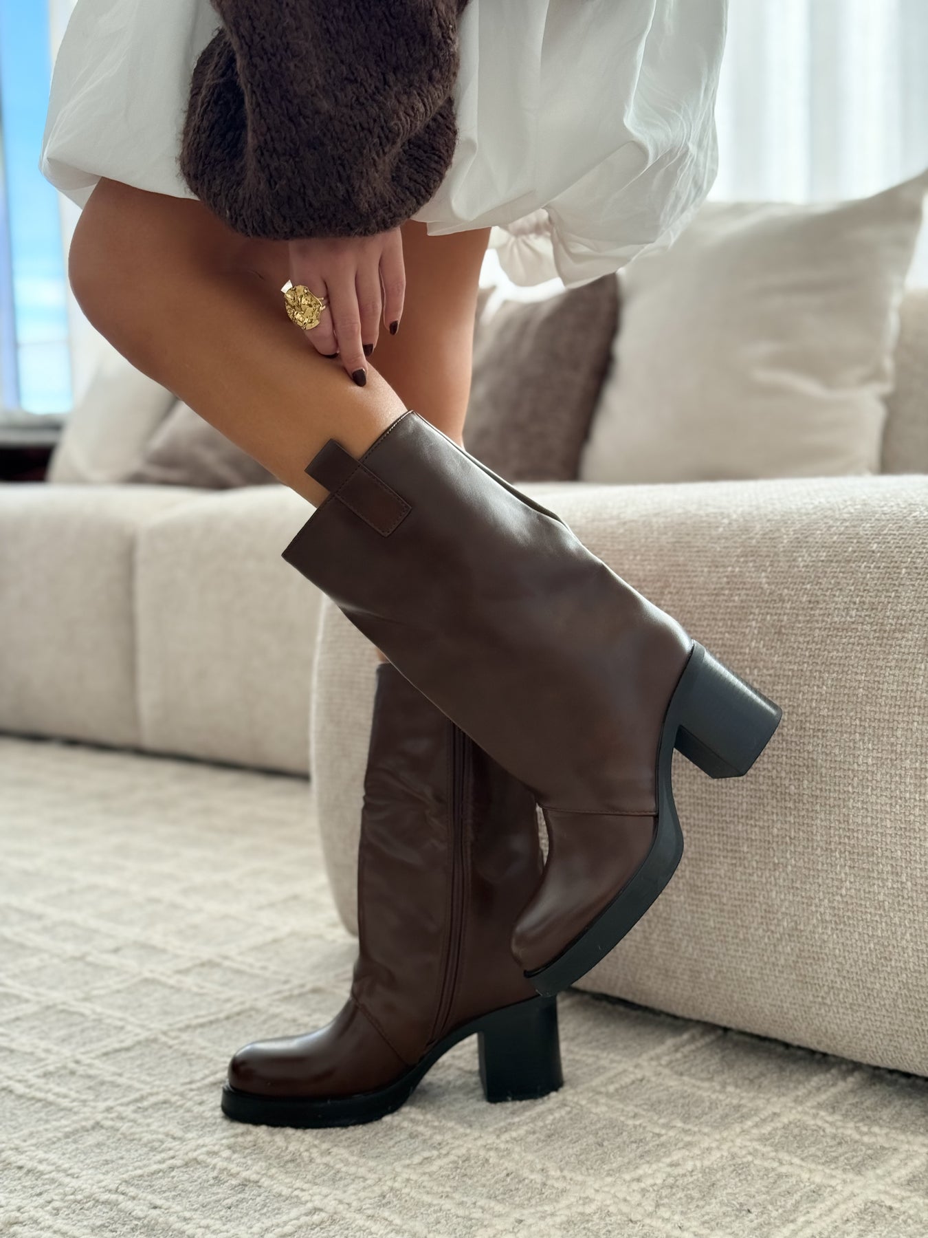 Les bottes Milly marron séduisent par leur allure intemporelle et leur ligne chic à l’esprit seventies. Leur cuir synthétique lisse au fini légèrement satiné sublime la jambe, tandis que le talon bloc de 8 cm apporte une élégance naturelle sans compromettre le confort.
