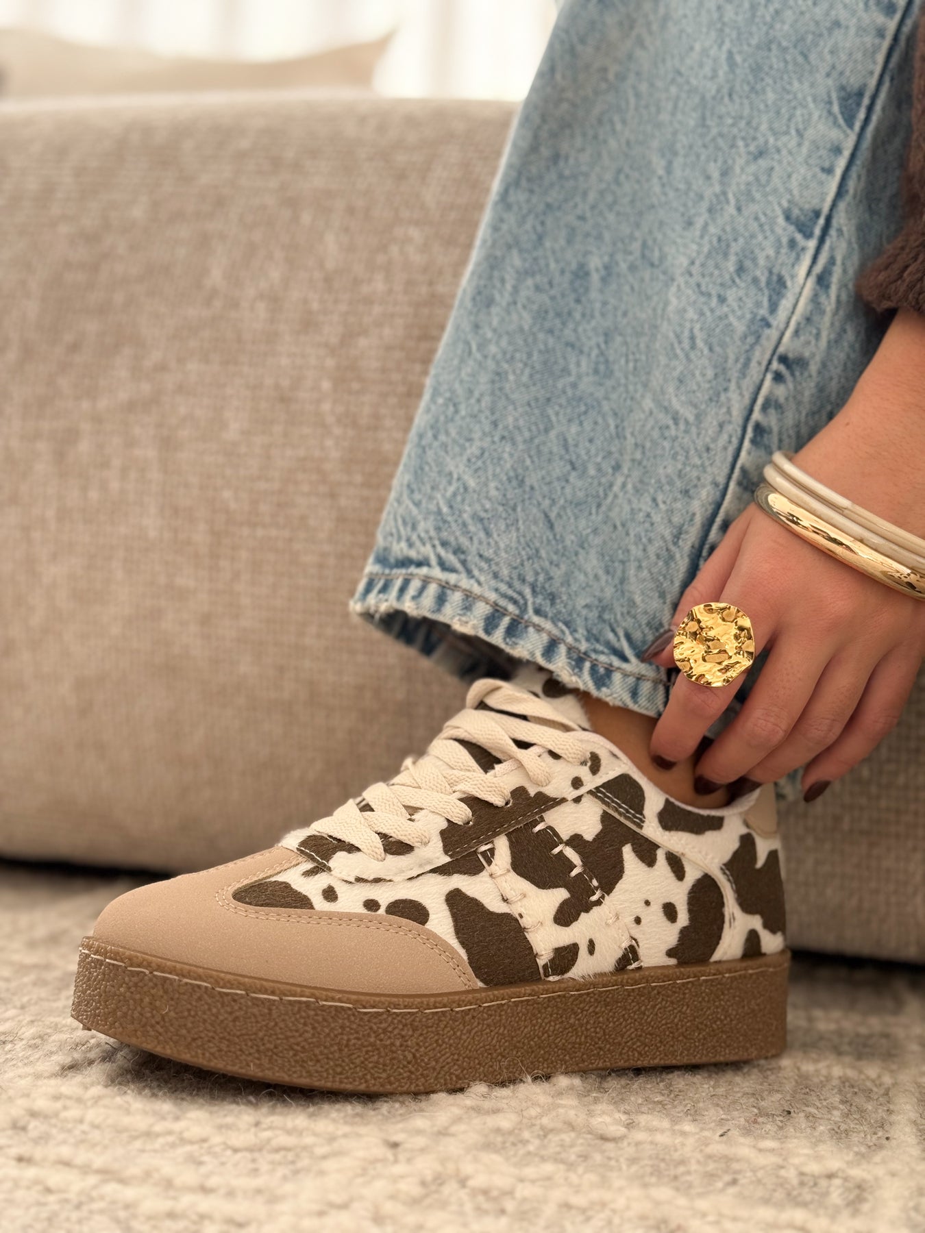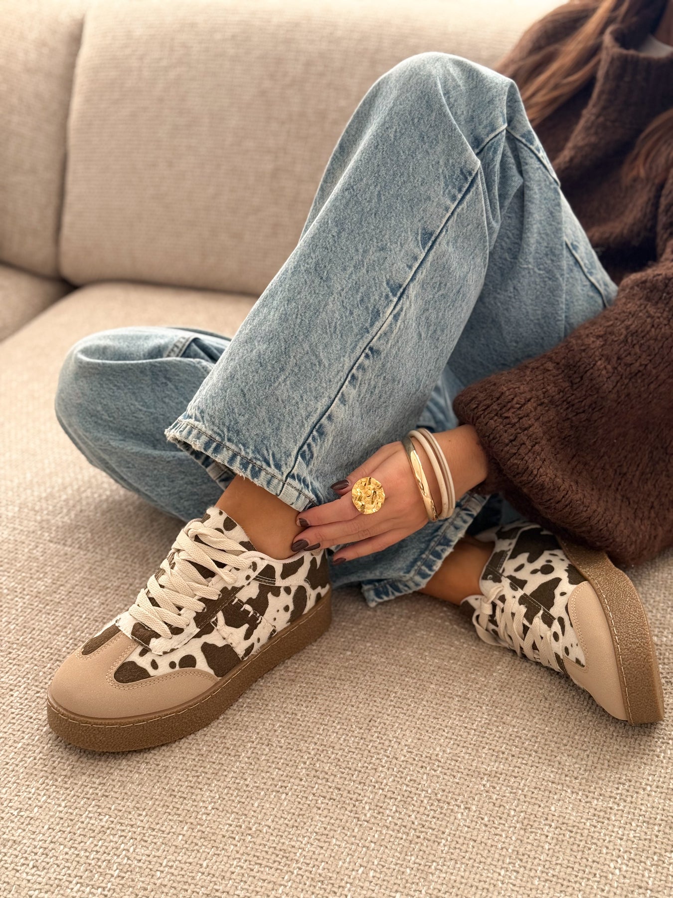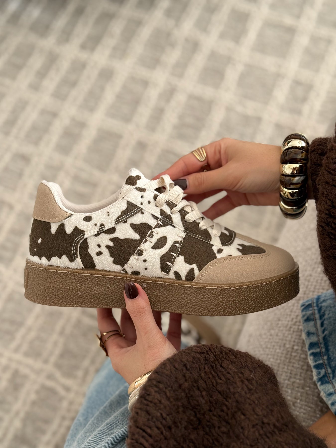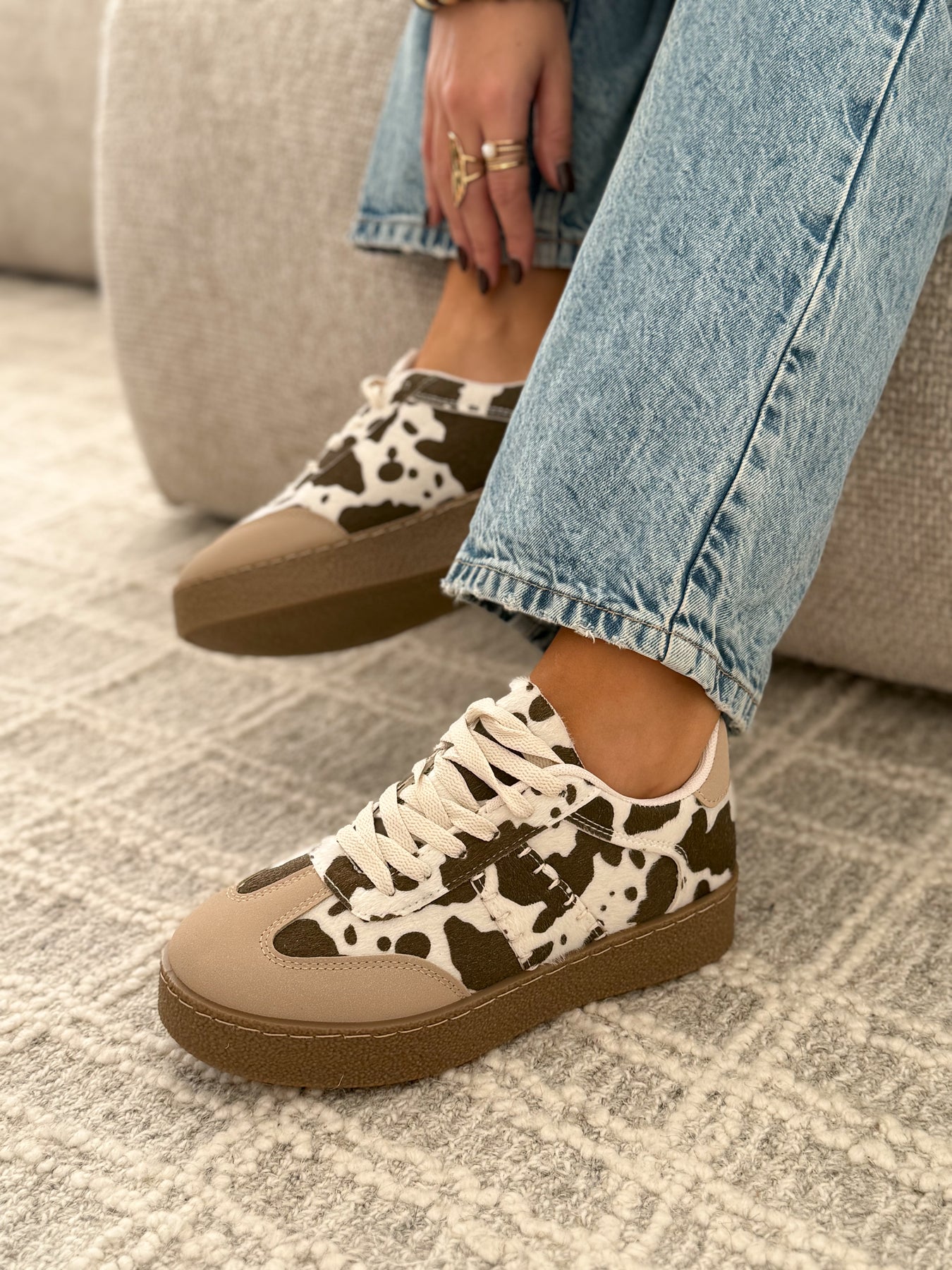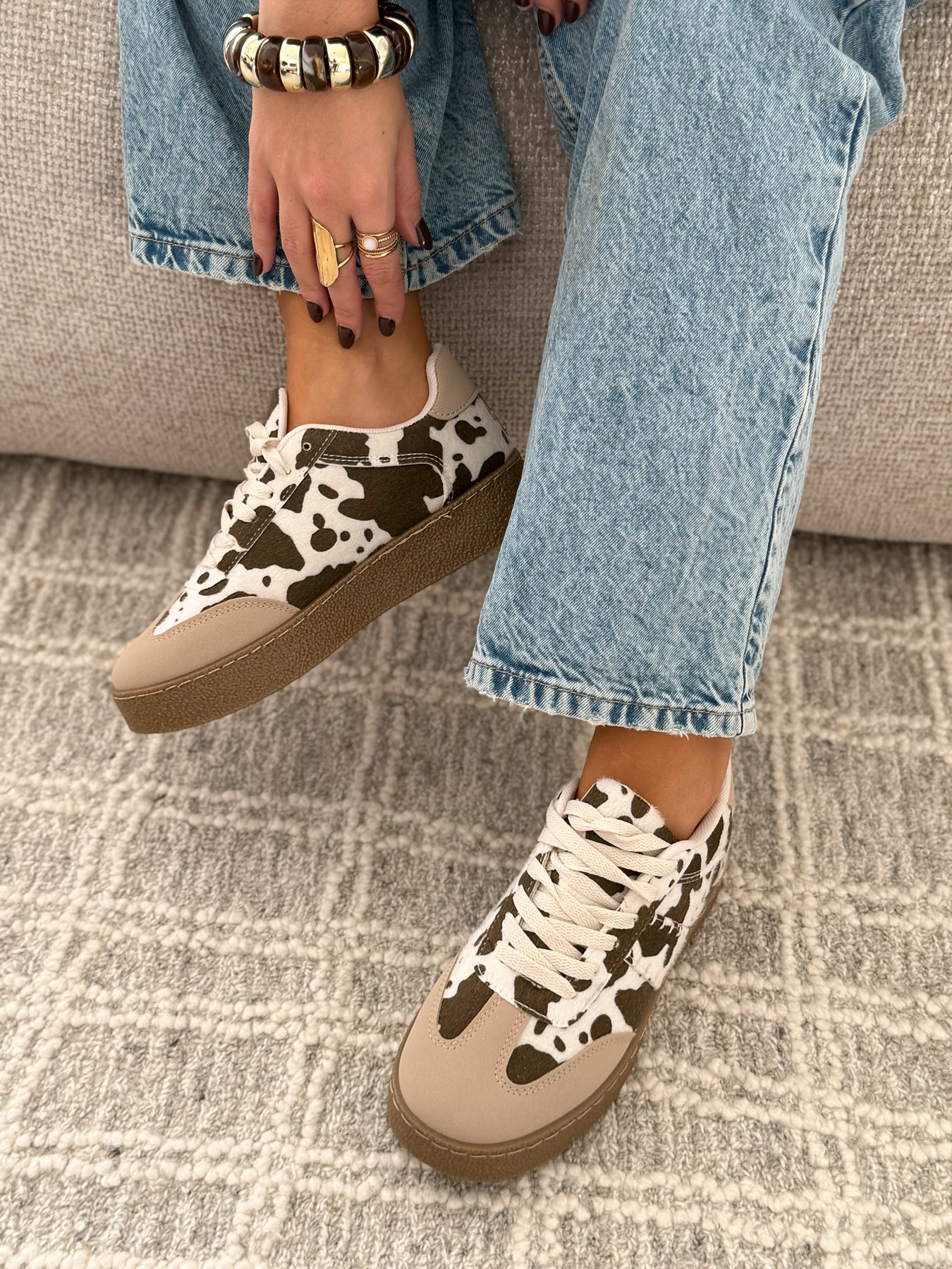 - Détails du modèle : Sneakers basses à lacets, imprimé animalier vachette, empiècements beiges sur le bout et le talon, semelle texturée ton sur ton