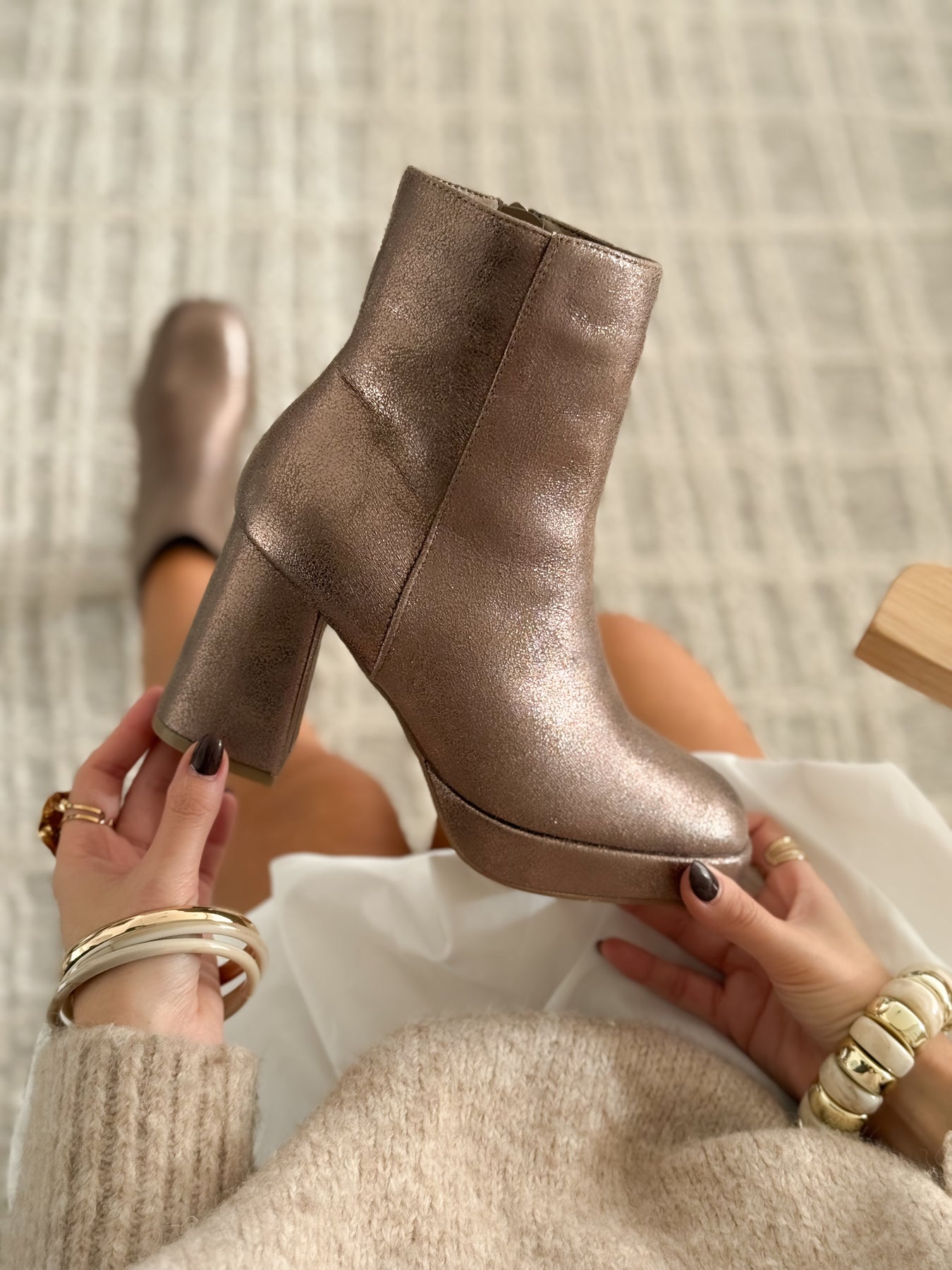 Chic et pleines de caractère, les bottines Salema bronze font briller la silhouette. Leur talon bloc de 9 cm élance la jambe tout en restant confortable grâce à leur plateforme à l’avant. Leur teinte bronze rosé légèrement métallisée capte la lumière à chaque pas et s’accorde aussi bien avec une tenue habillée qu’un jean brut. Faciles à enfiler grâce à leur zip latéral, elles ajoutent instantanément une touche mode à n’importe quel look.