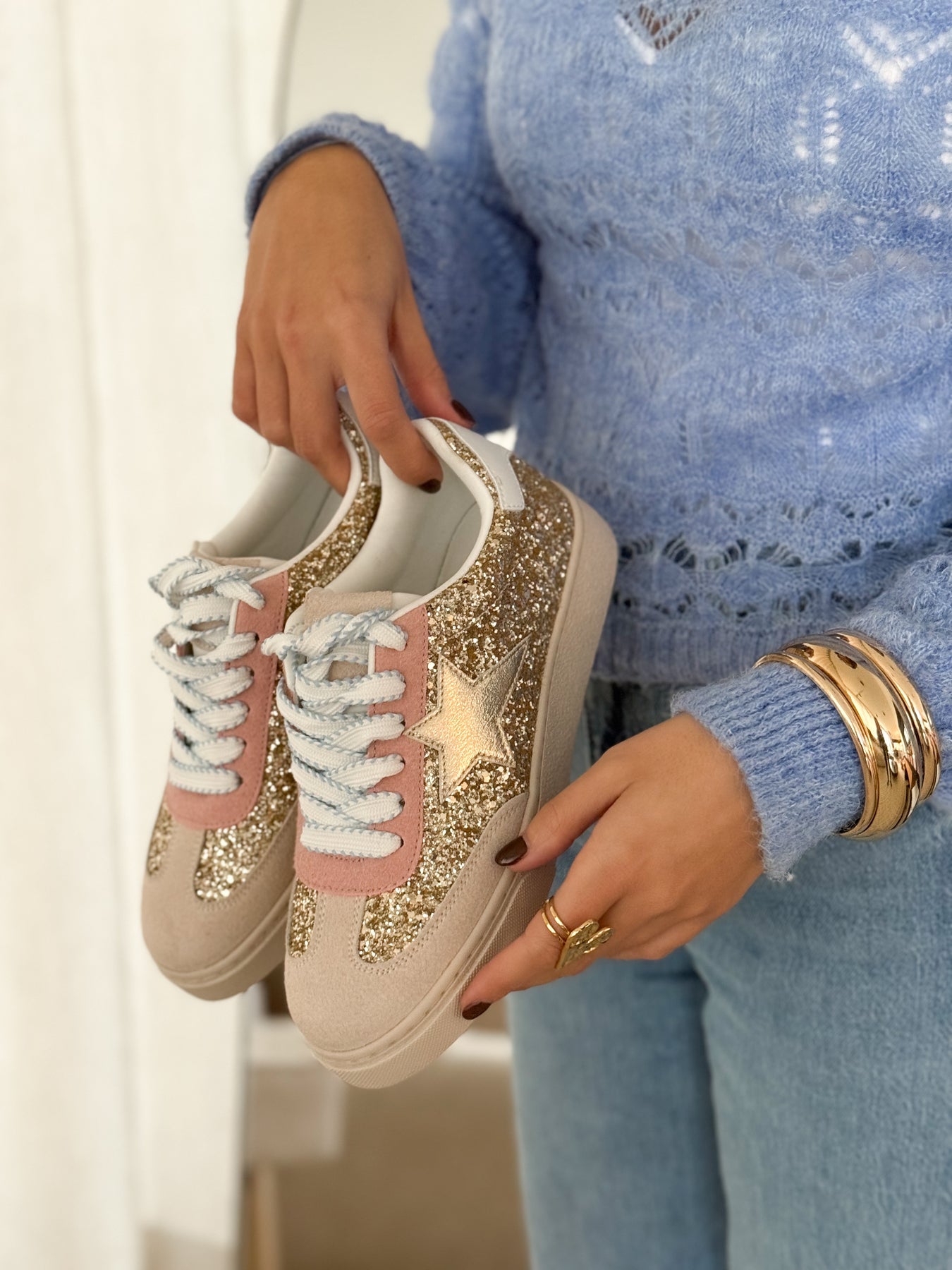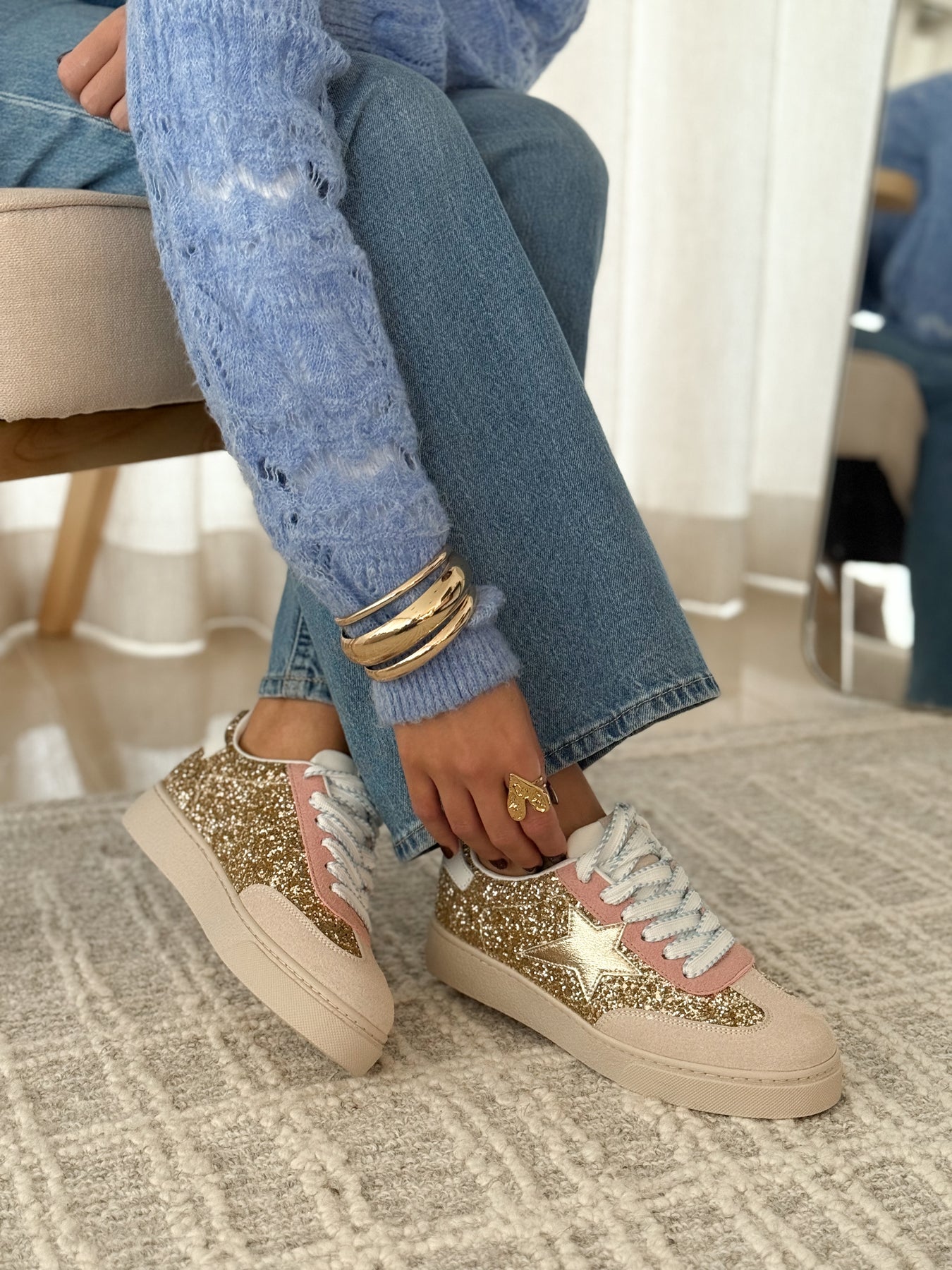 Les baskets Betty illuminent vos tenues avec élégance grâce à leurs paillettes dorées et leur étoile scintillante. Leur base beige douce, rehaussée de touches rose poudré, en fait un modèle à la fois chic et facile à porter au quotidien. Confortables et tendance, elles apportent juste ce qu’il faut de brillance pour sublimer un jean, un pantalon fluide ou une tenue plus féminine avec beaucoup de style.
