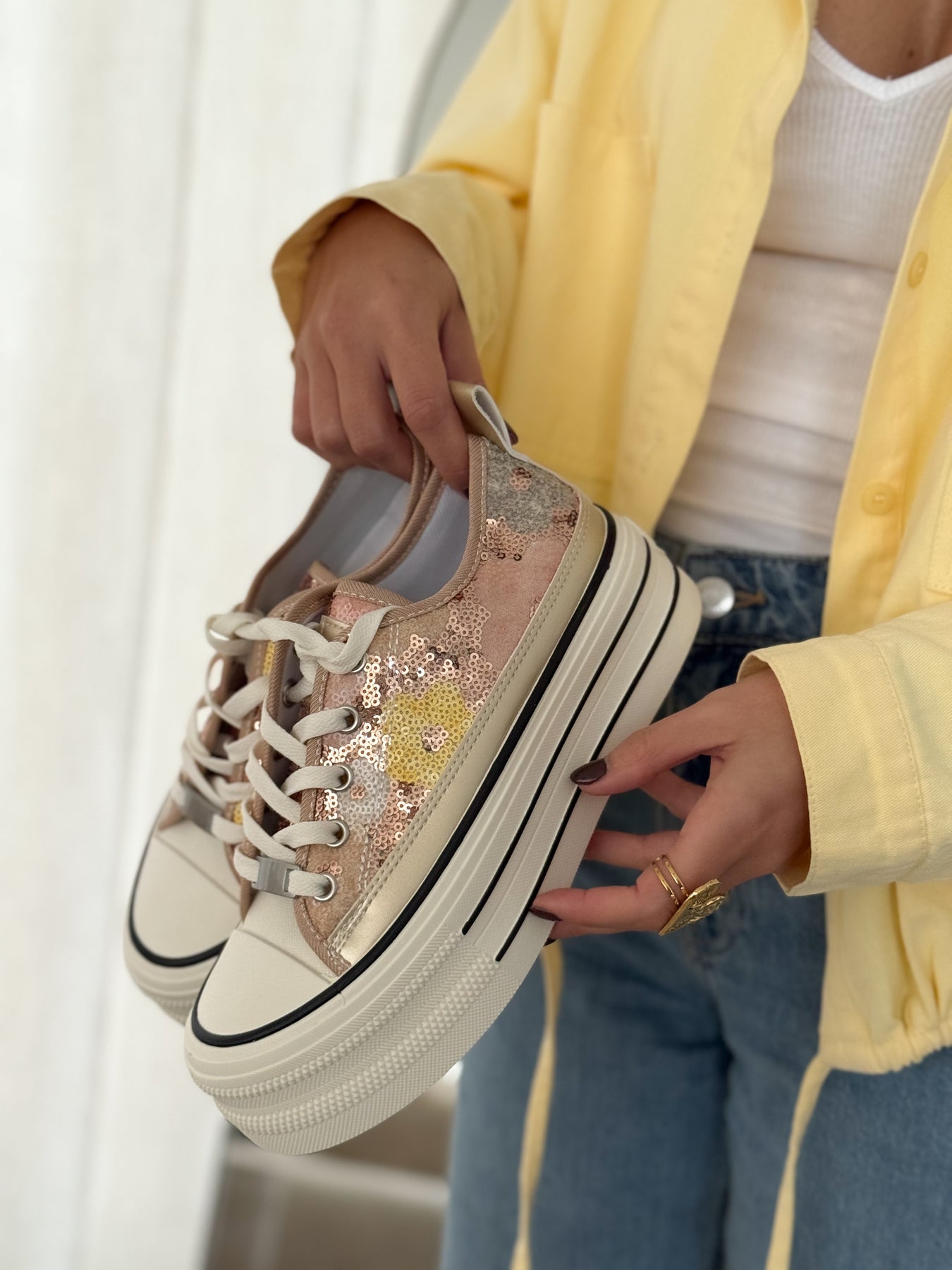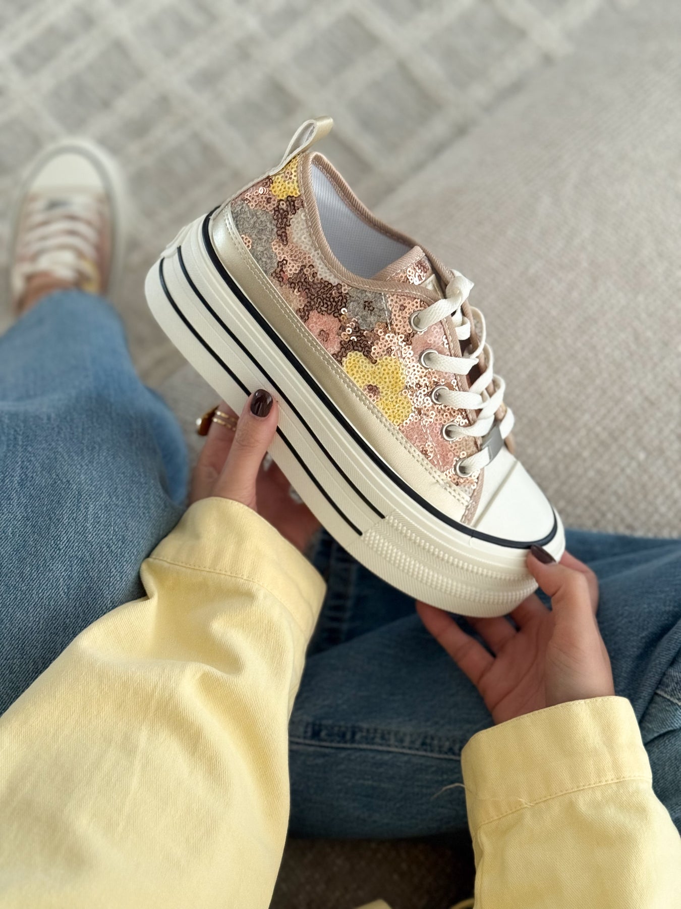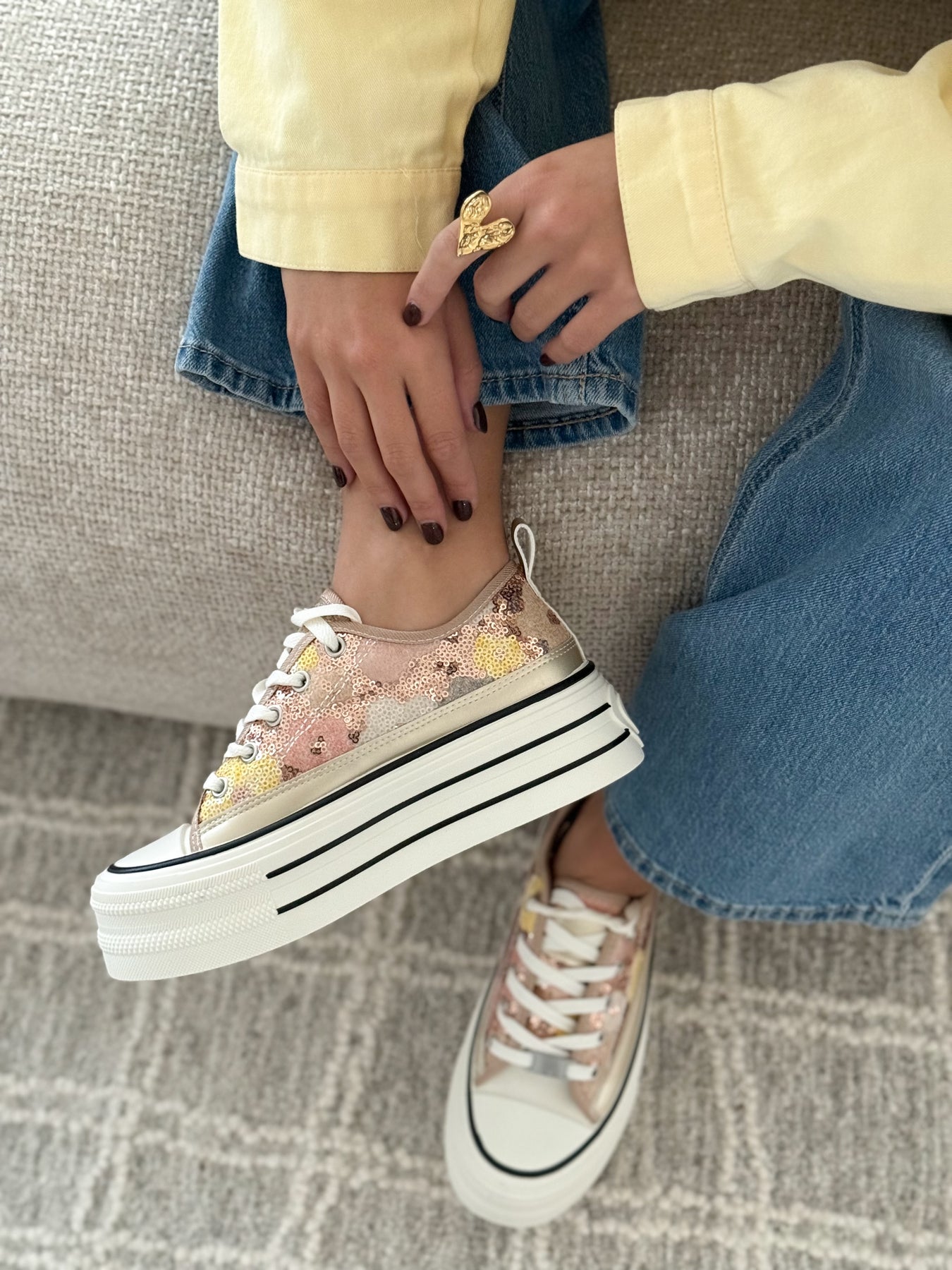 - Détails du modèle : baskets basses à plateforme épaisse, sequins irisés aux nuances pastel, semelle blanche à doubles liserés noirs, lacets écrus, silhouette casual et lumineuse