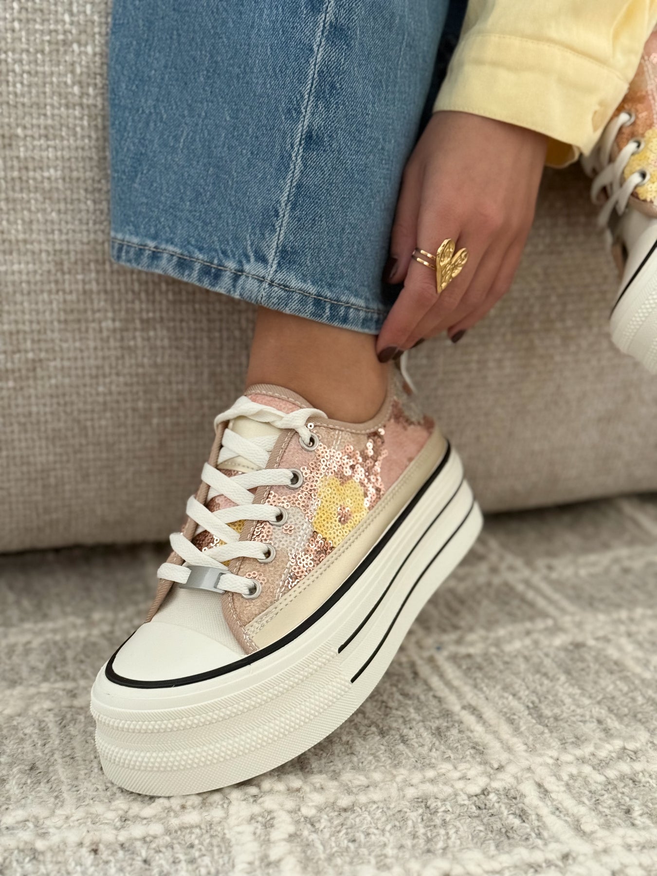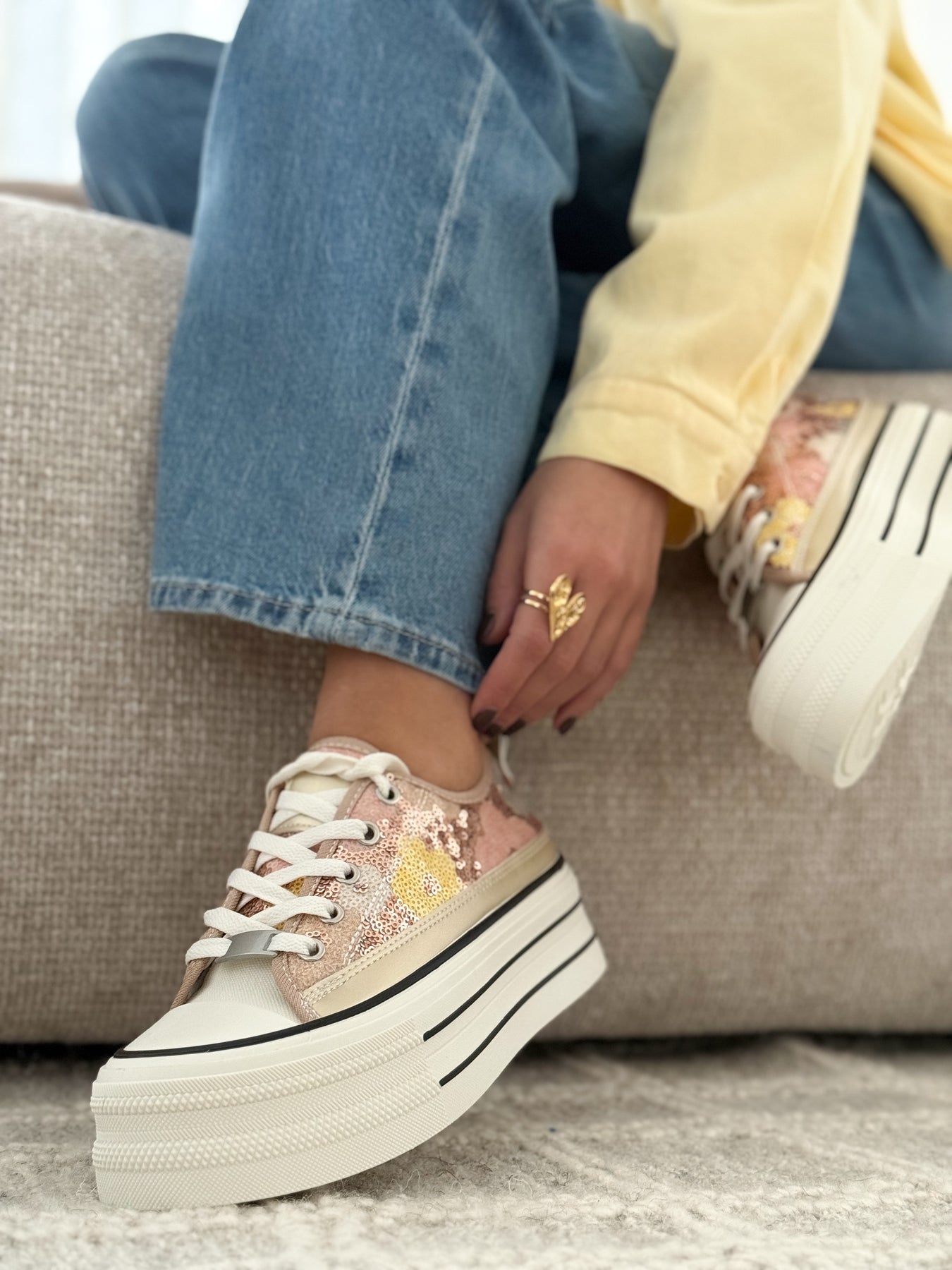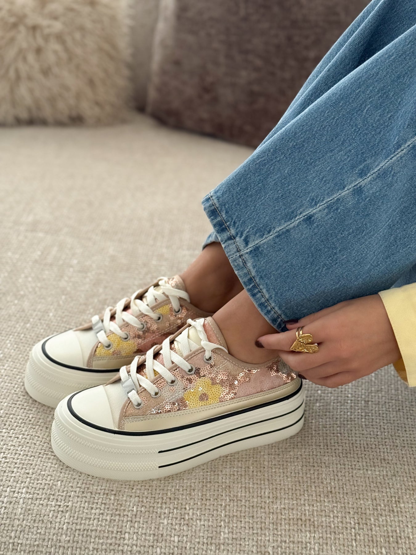 - Détails du modèle : baskets basses à plateforme épaisse, sequins irisés aux nuances pastel, semelle blanche à doubles liserés noirs, lacets écrus, silhouette casual et lumineuse