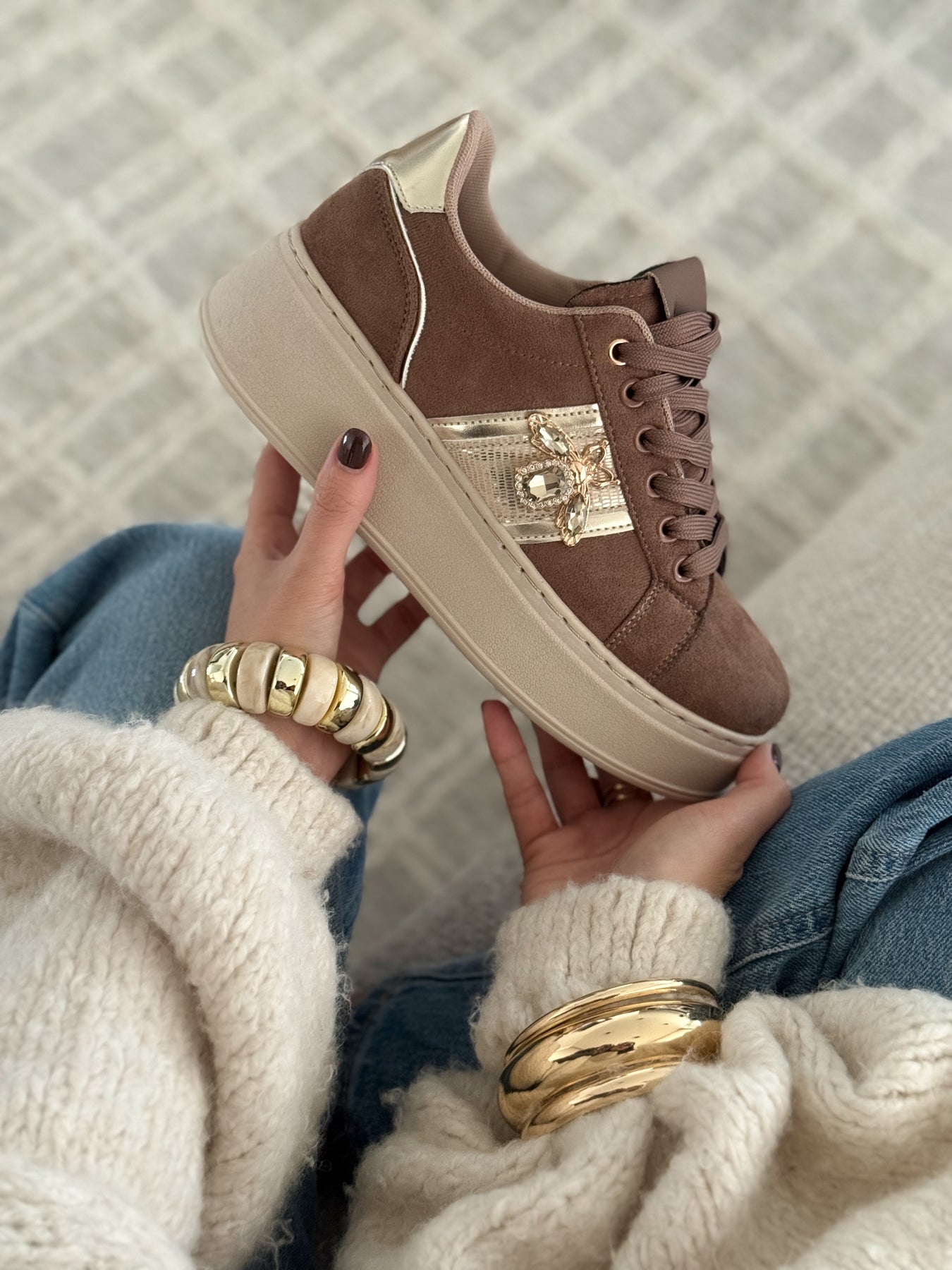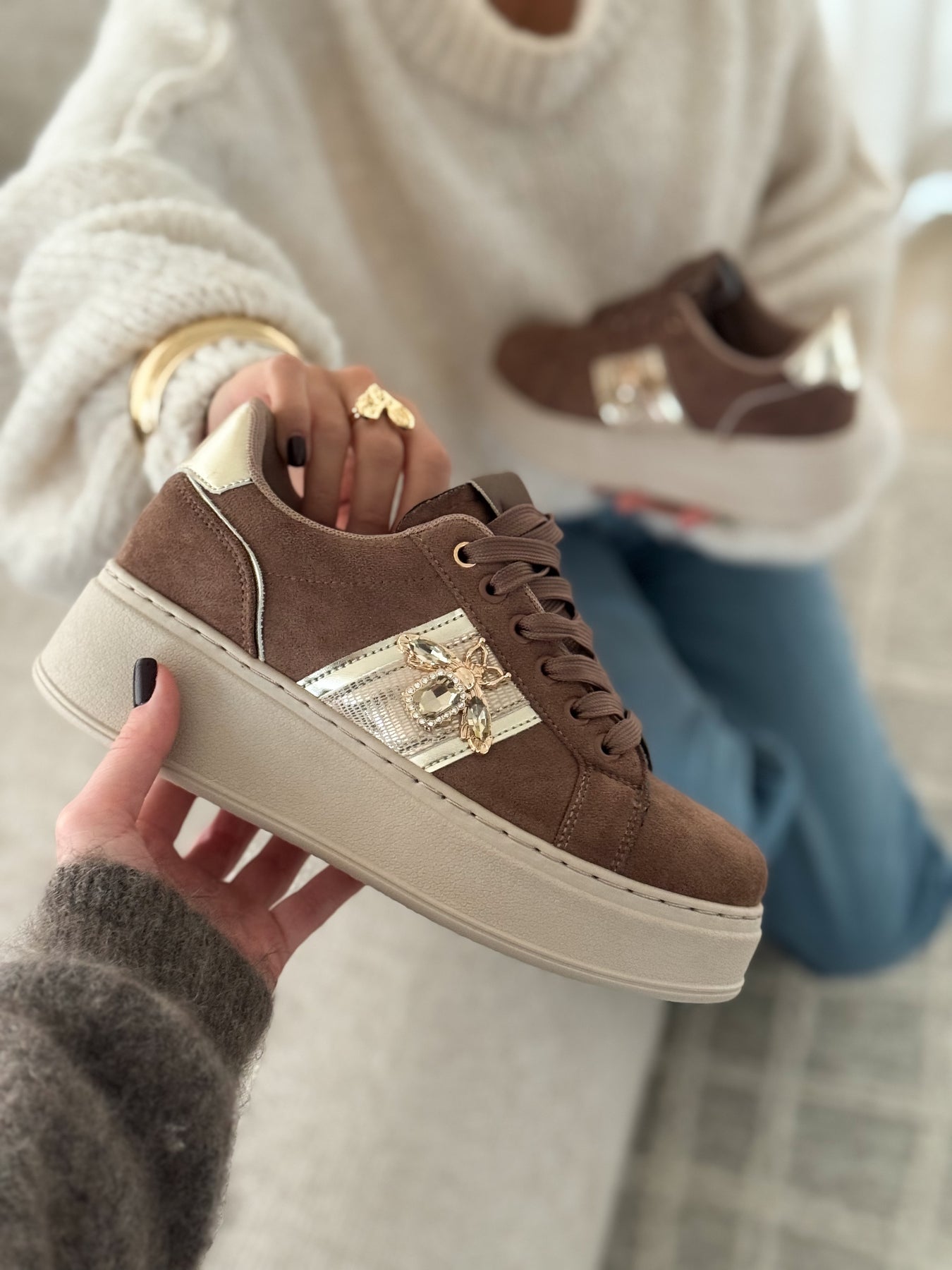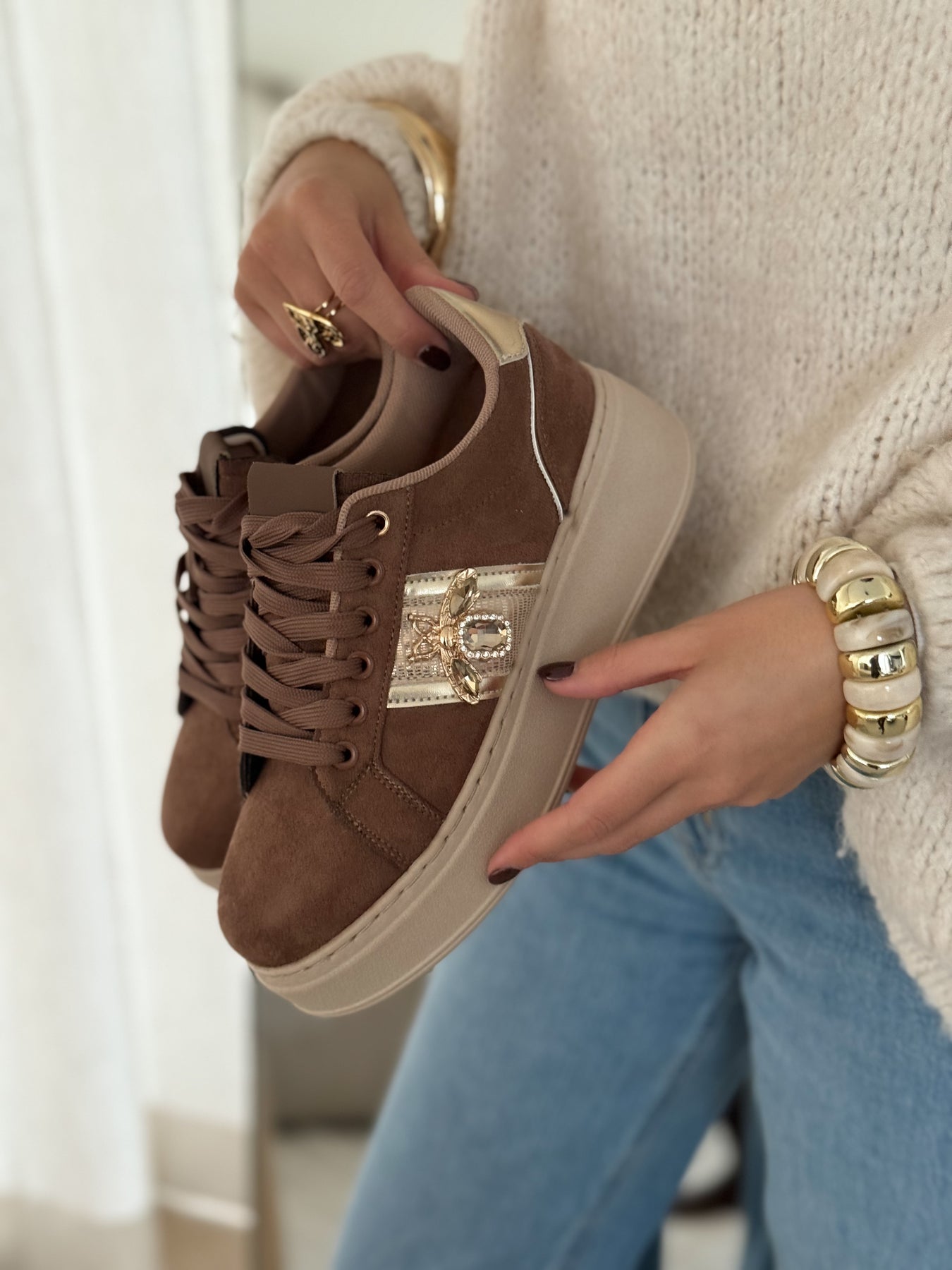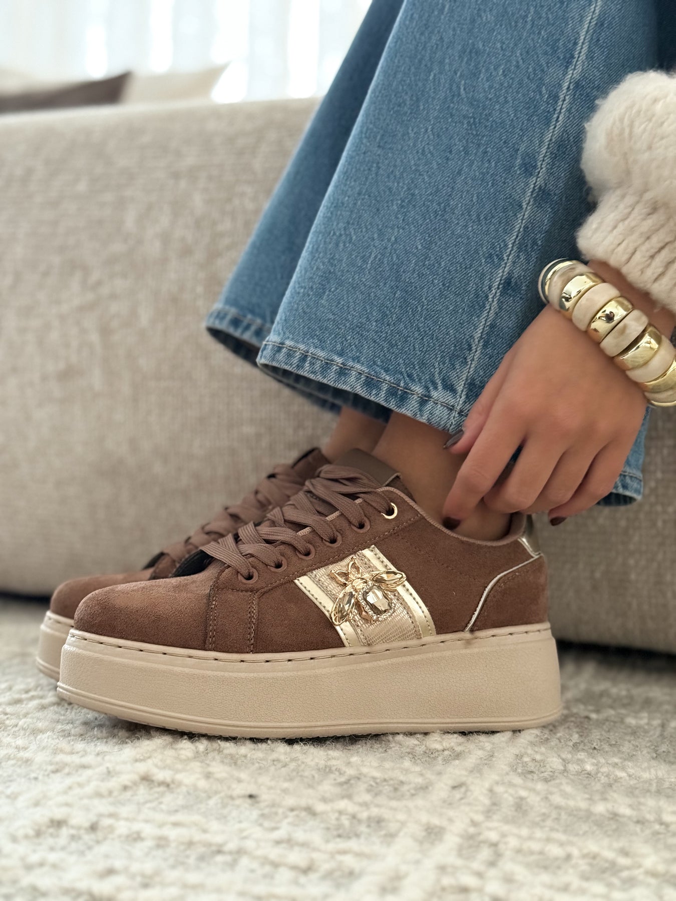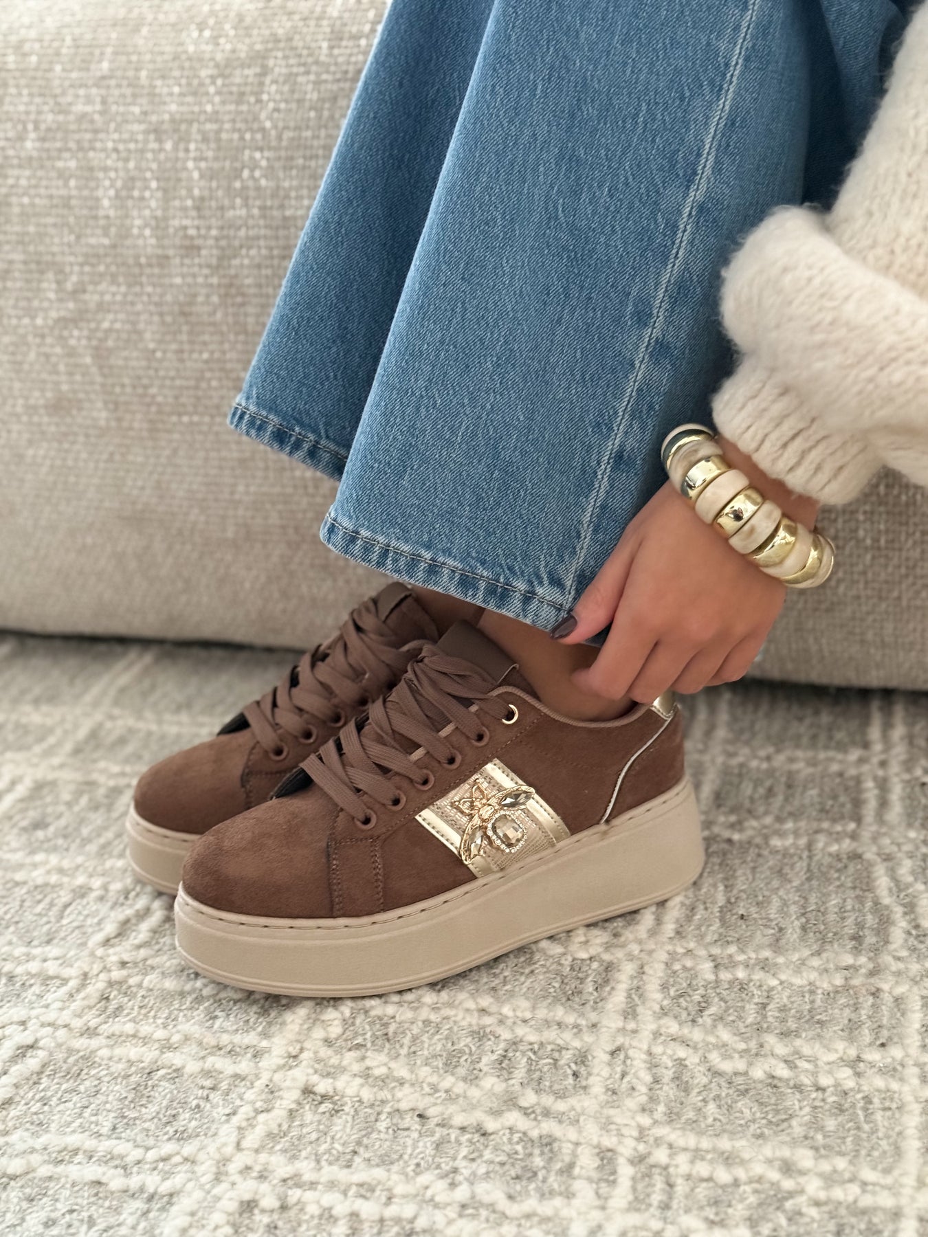 Les baskets Tahoa apportent une touche chic et lumineuse à vos looks du quotidien. Leur teinte marron douce et facile à assortir est sublimée par une bande dorée élégante et un bijou délicat qui capte subtilement la lumière. La semelle plateforme assure un confort optimal tout en allongeant la silhouette. Un modèle parfait pour celles qui aiment les baskets avec une vraie signature mode.