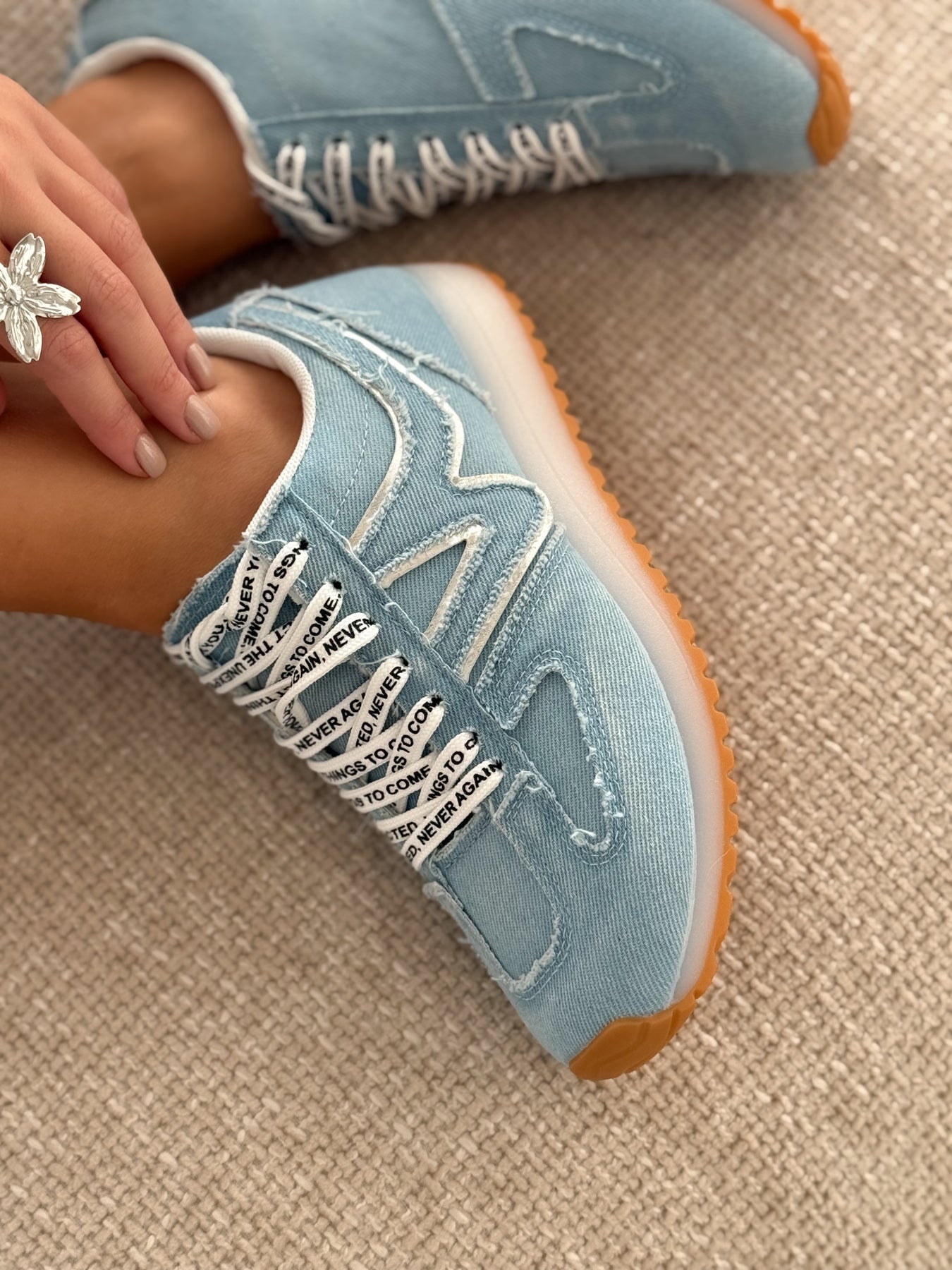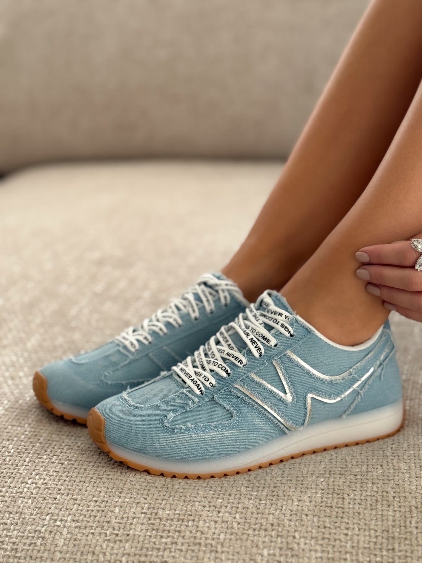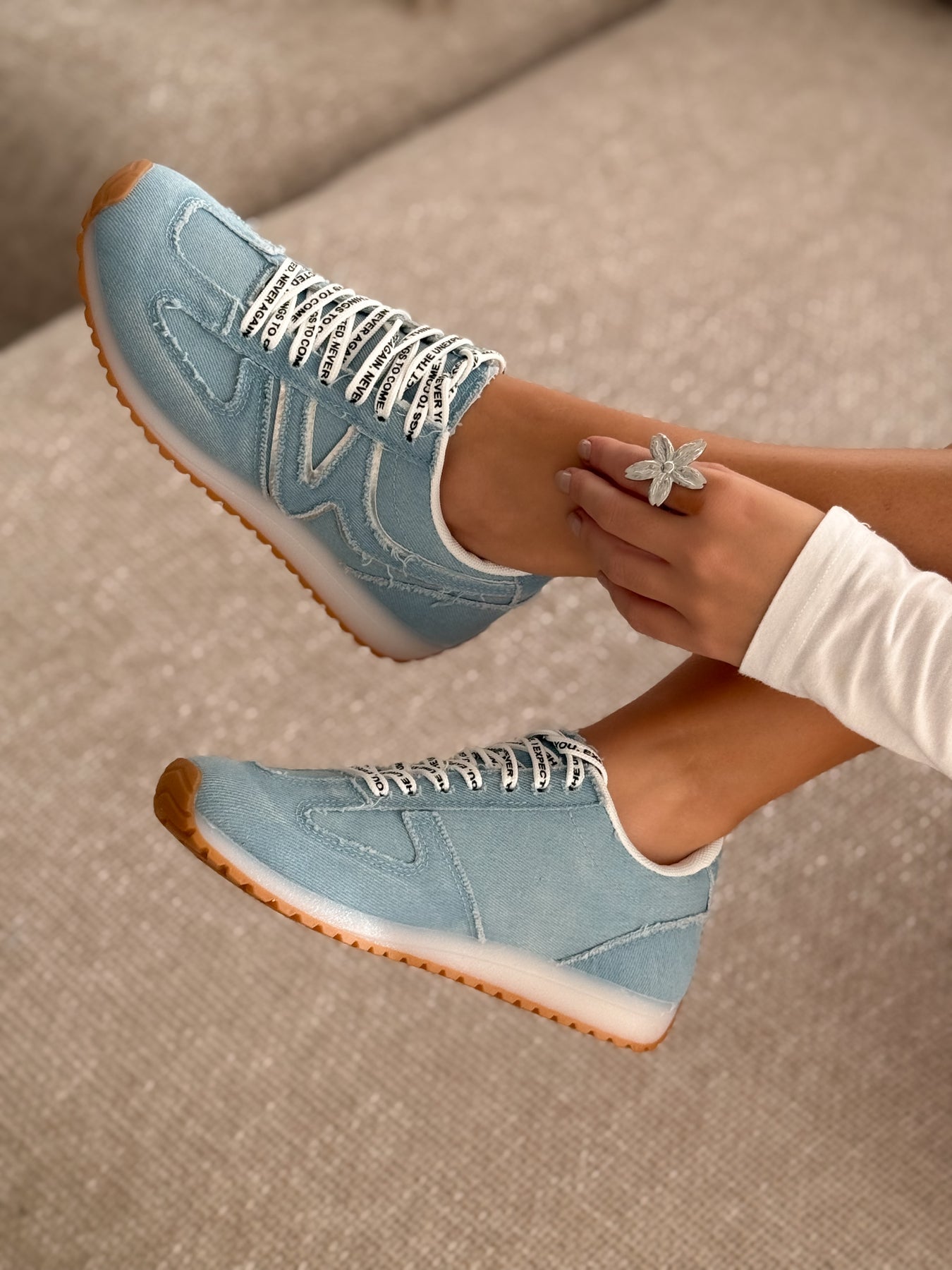 - Détails du modèle : Empeigne entièrement denim bleu clair, surpiqûres apparentes, lacets blancs imprimés, logo ondulé ton sur ton, semelle caramel antidérapante, effet casual rétro très tendance