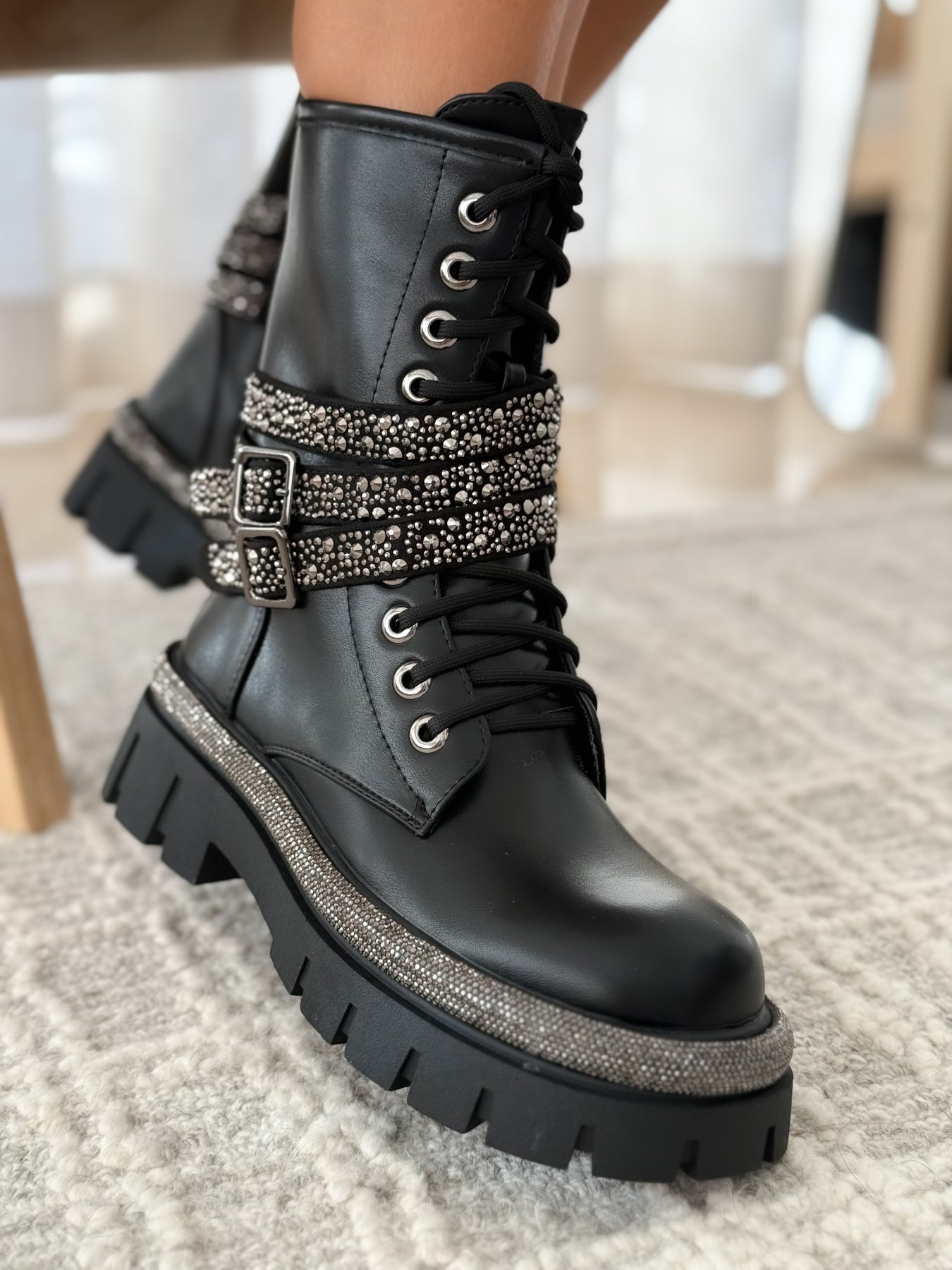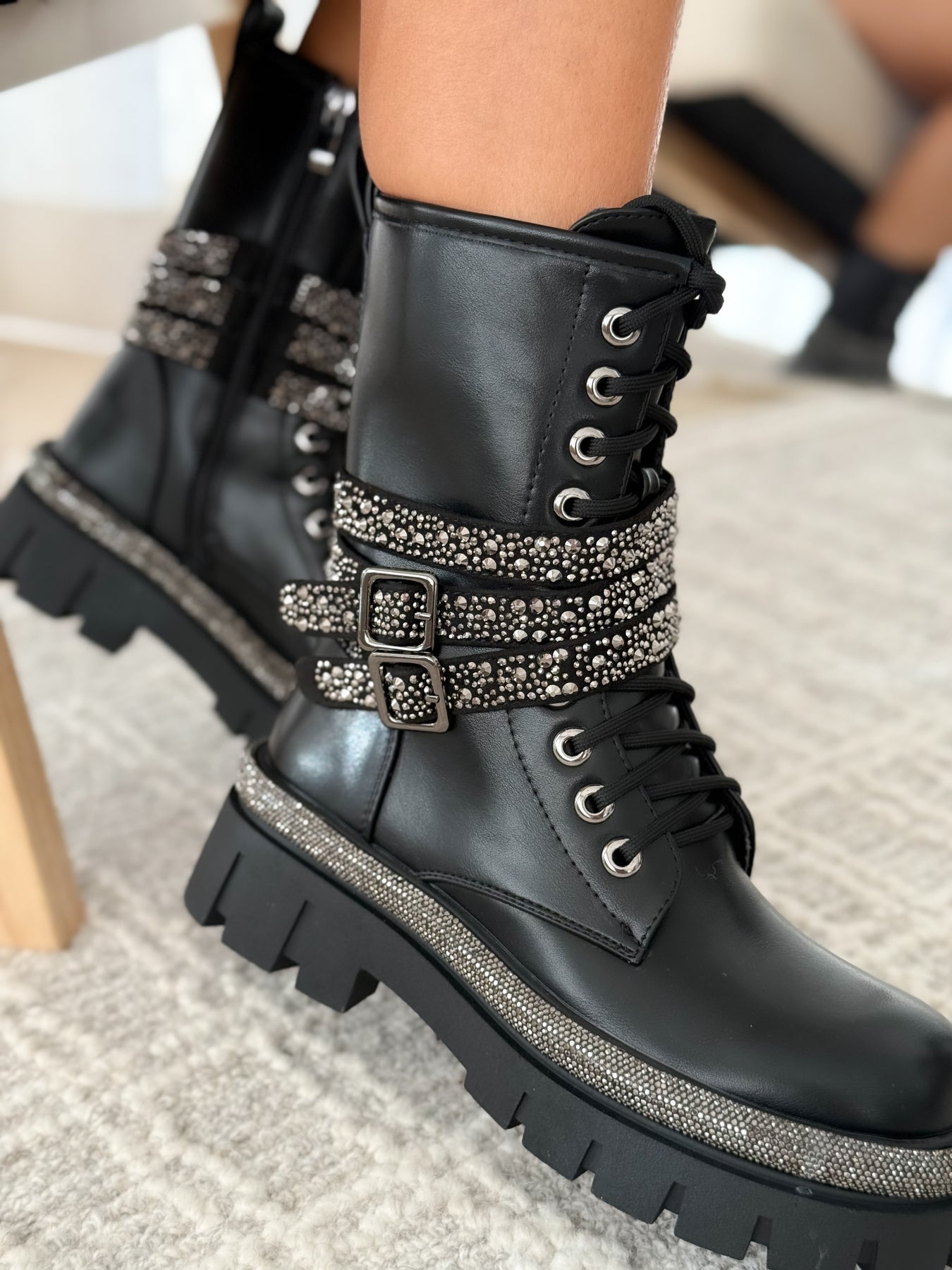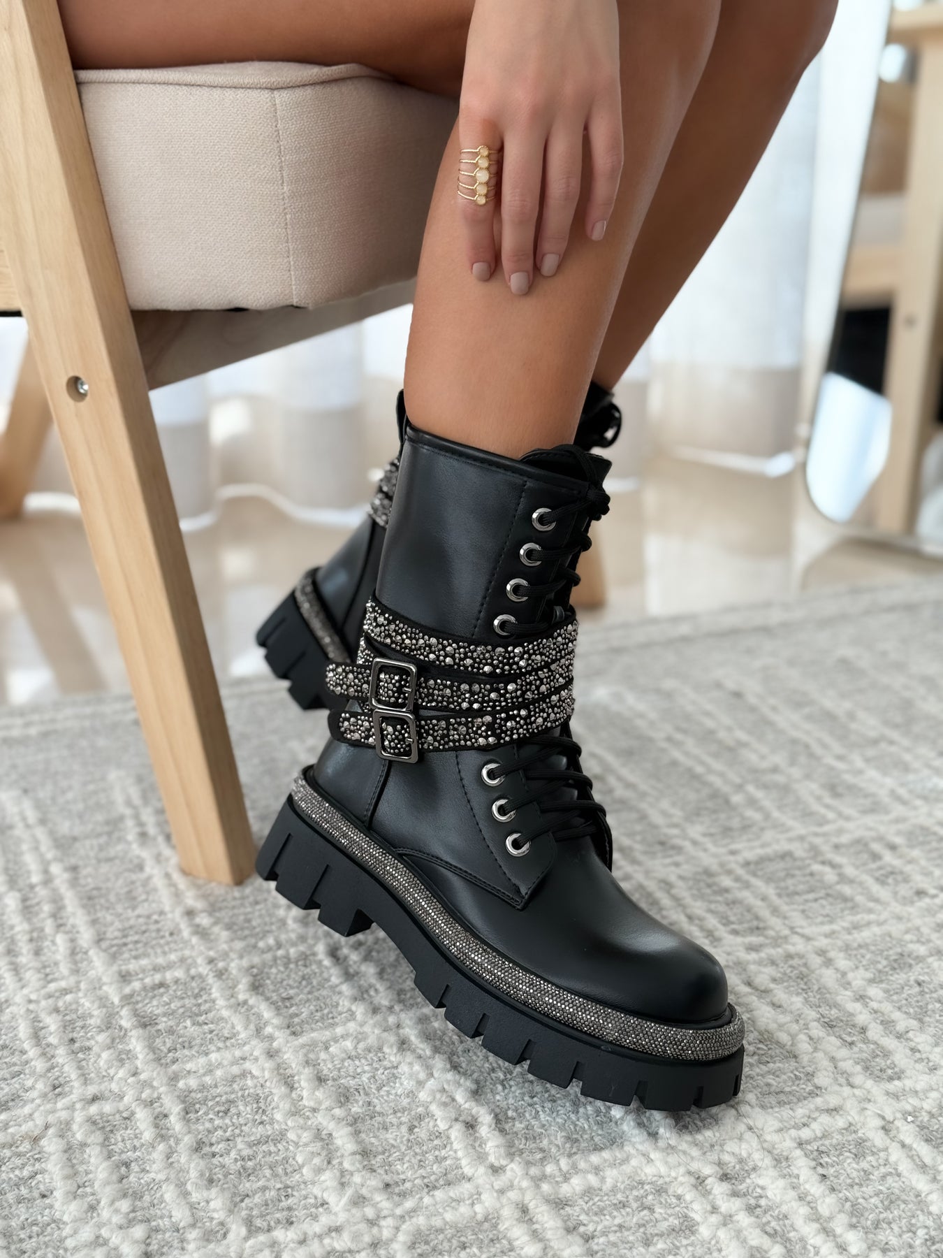 Les bottes OSNIA imposent une allure résolument tendance : une silhouette biker assumée, puissante et féminine. Leur tige mi-haute en simili cuir mat et leurs brides richement ornées de détails argentés créent un contraste moderne qui capte instantanément le regard.