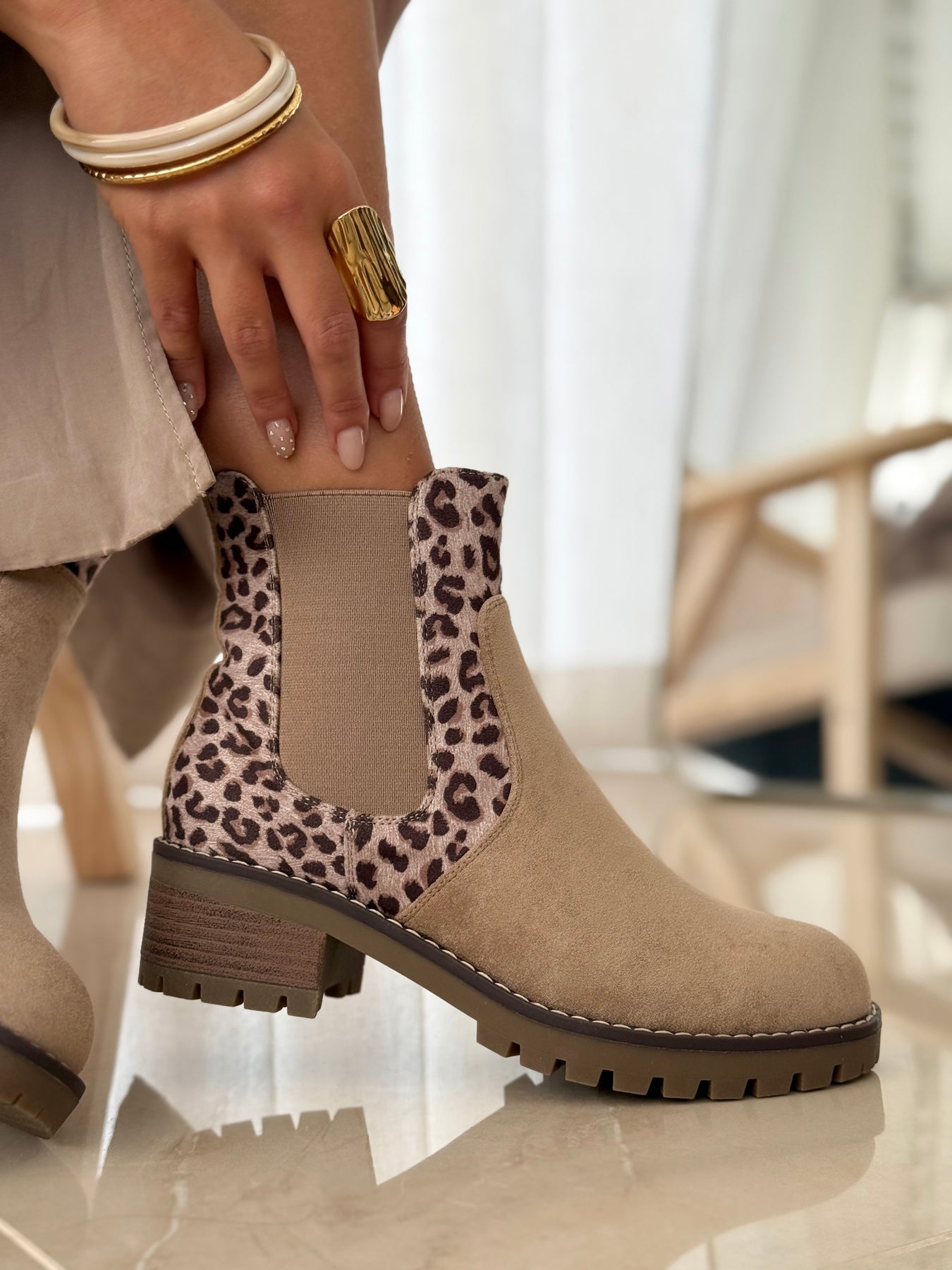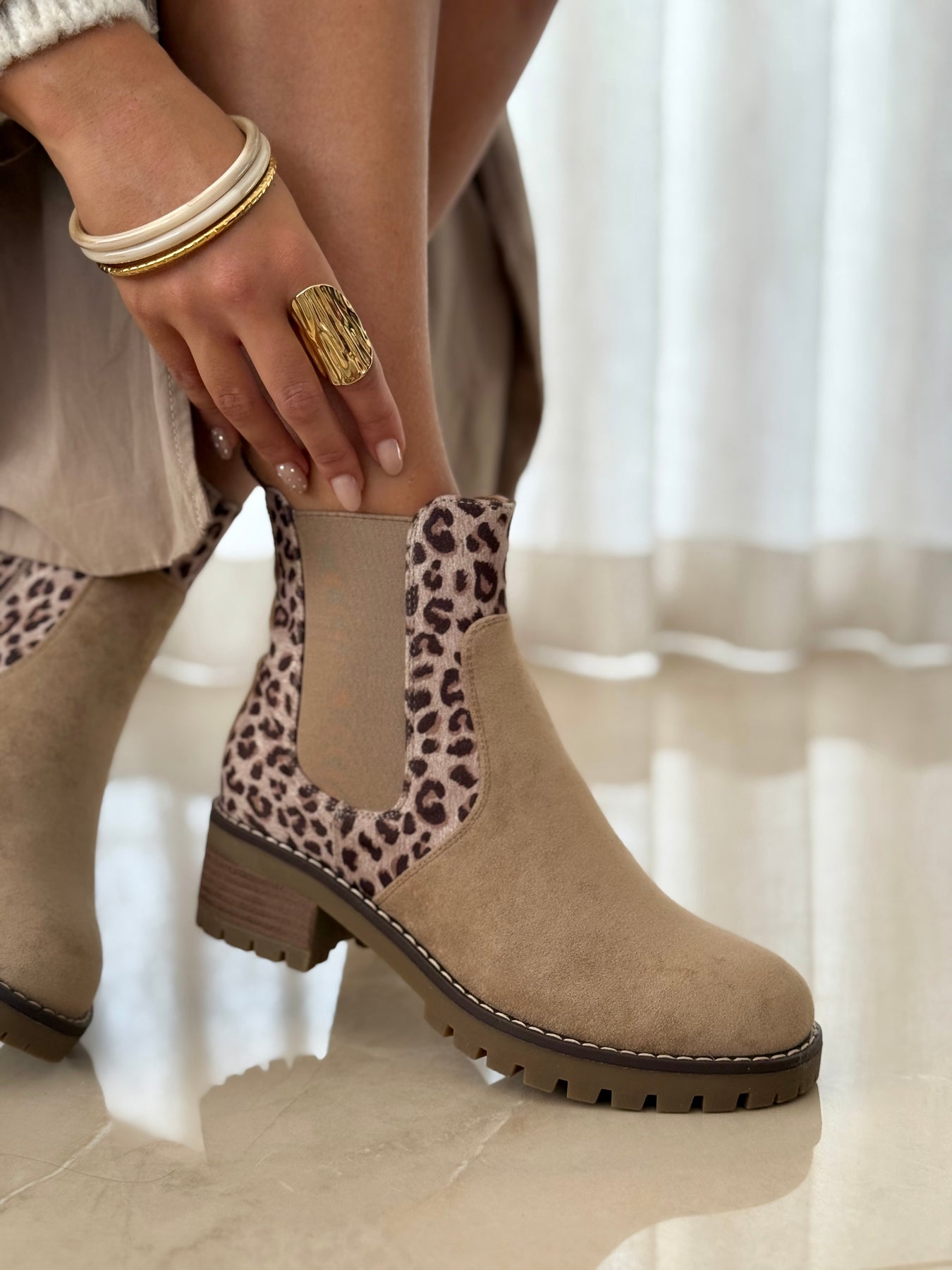 Les boots Margot, ce sont les bottines classiques… revisitées avec du caractère ! En suédine beige sable toute douce, elles misent sur des empiècements latéraux à imprimé léopard subtilement irisé, qui leur donnent une vraie personnalité sans en faire trop. Leur semelle crantée et leur talon légèrement épais assurent une bonne stabilité, parfaite pour le quotidien. Faciles à enfiler grâce aux élastiques latéraux, elles se marient aussi bien avec une jupe midi qu’un jean roulé.