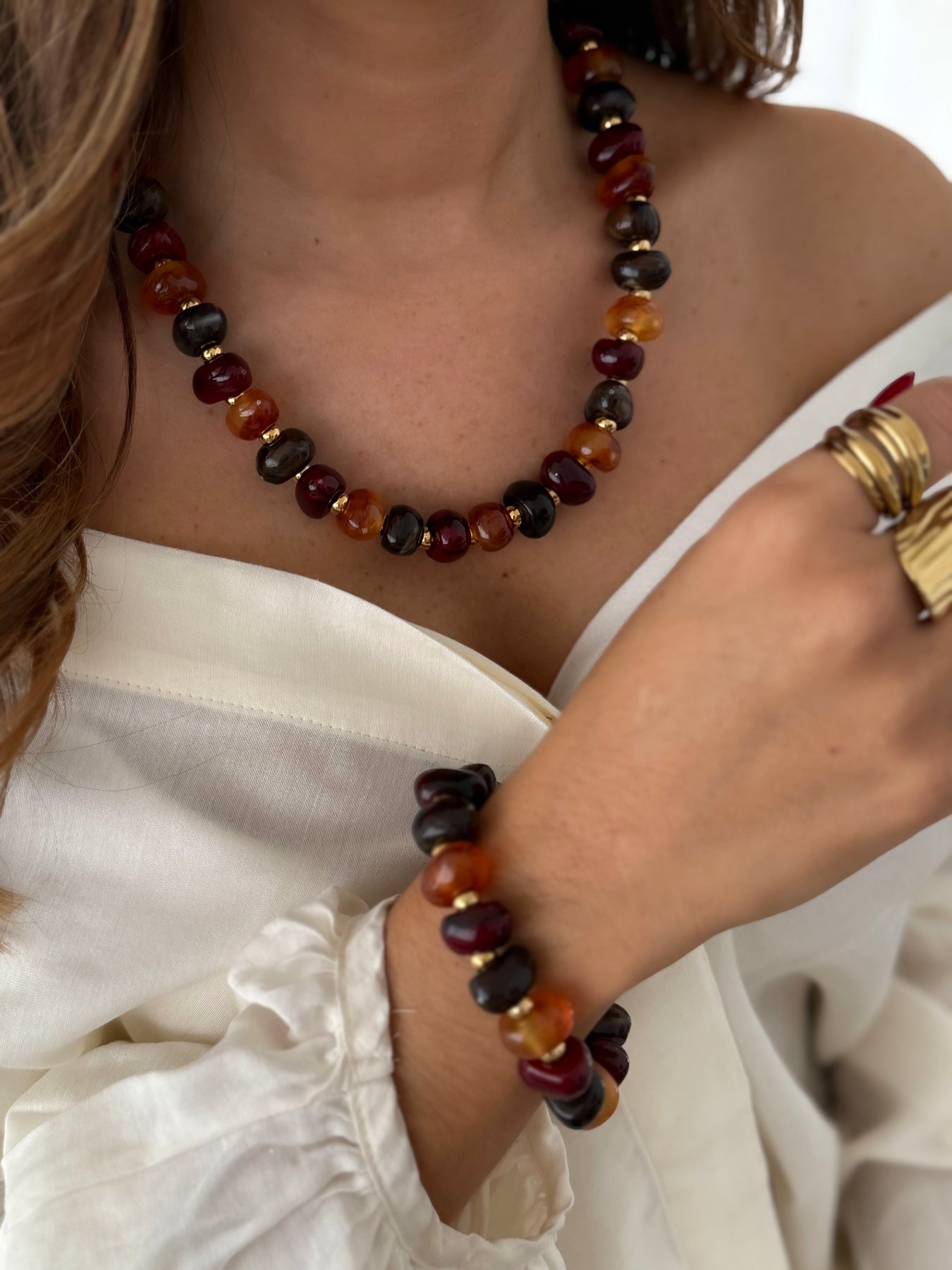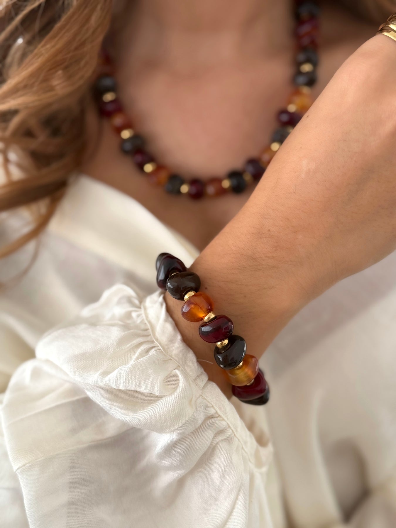Ce bracelet se compose de perles en résine aux nuances profondes : bordeaux, caramel et noir, relevées par de fines touches dorées. Ses couleurs chaudes apportent caractère et élégance, tandis que sa matière légère assure un confort au porté. À porter seul pour un look raffiné ou associé au collier assorti pour une parure harmonieuse.