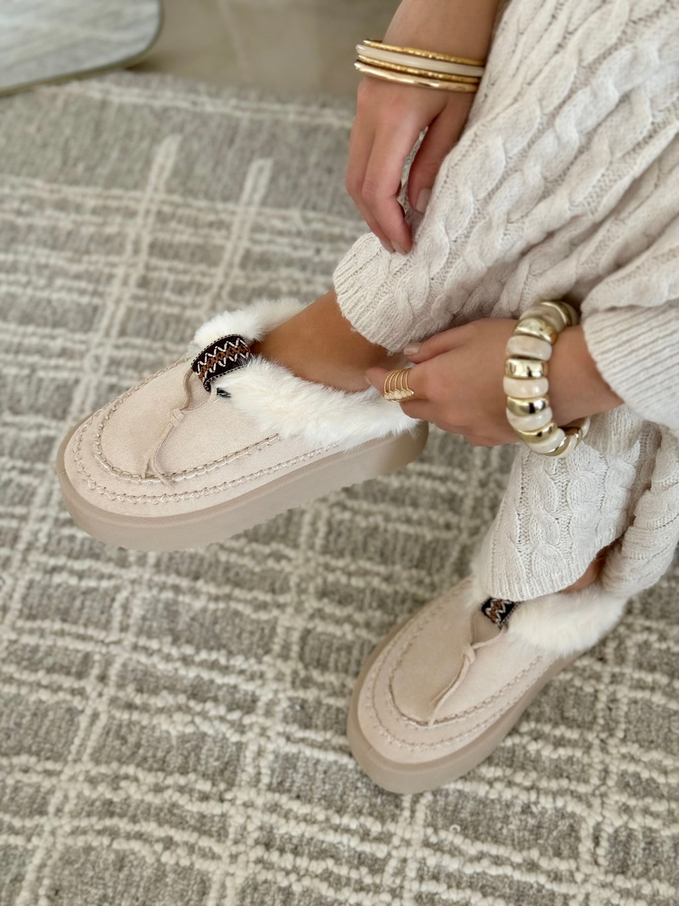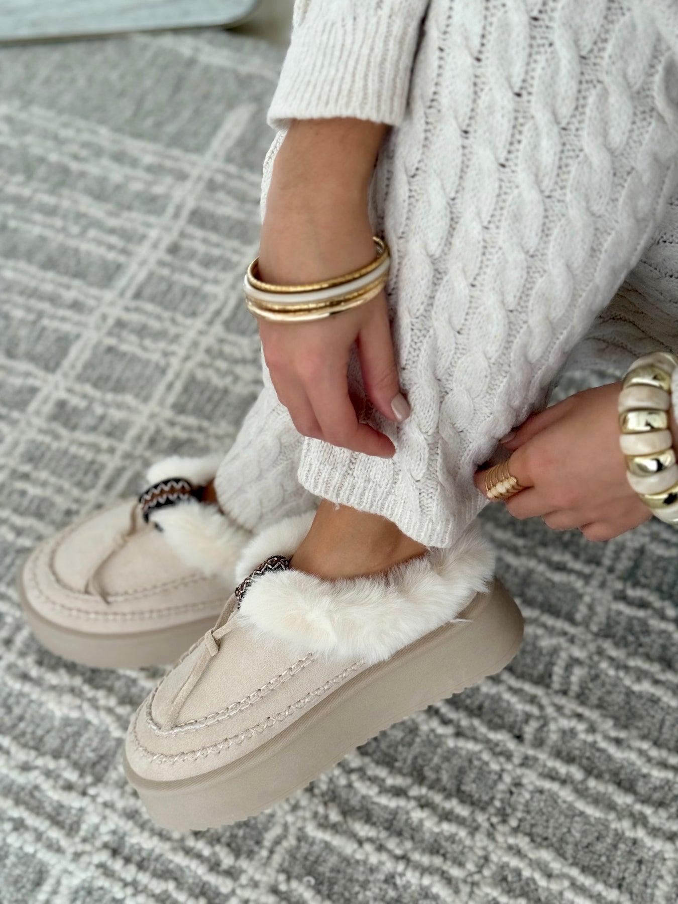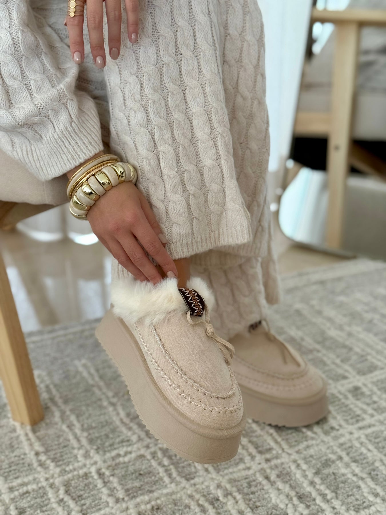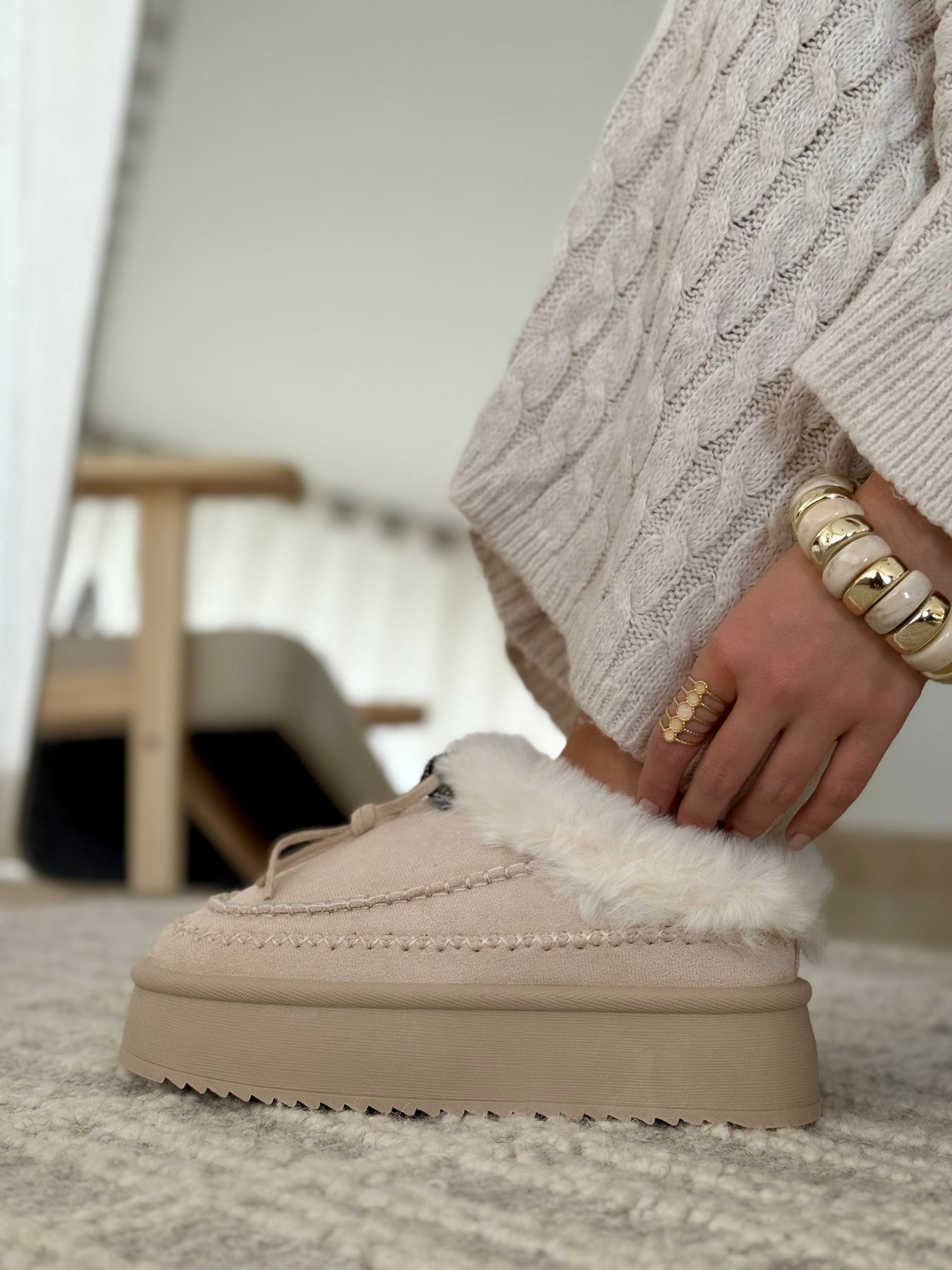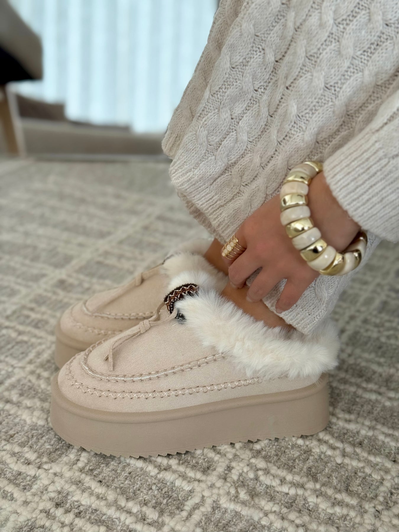 - Détails du modèle : Bordure fourrure blanche, dessus beige crème, plateforme ton sur ton, détail tressé décoratif, couture apparente beige