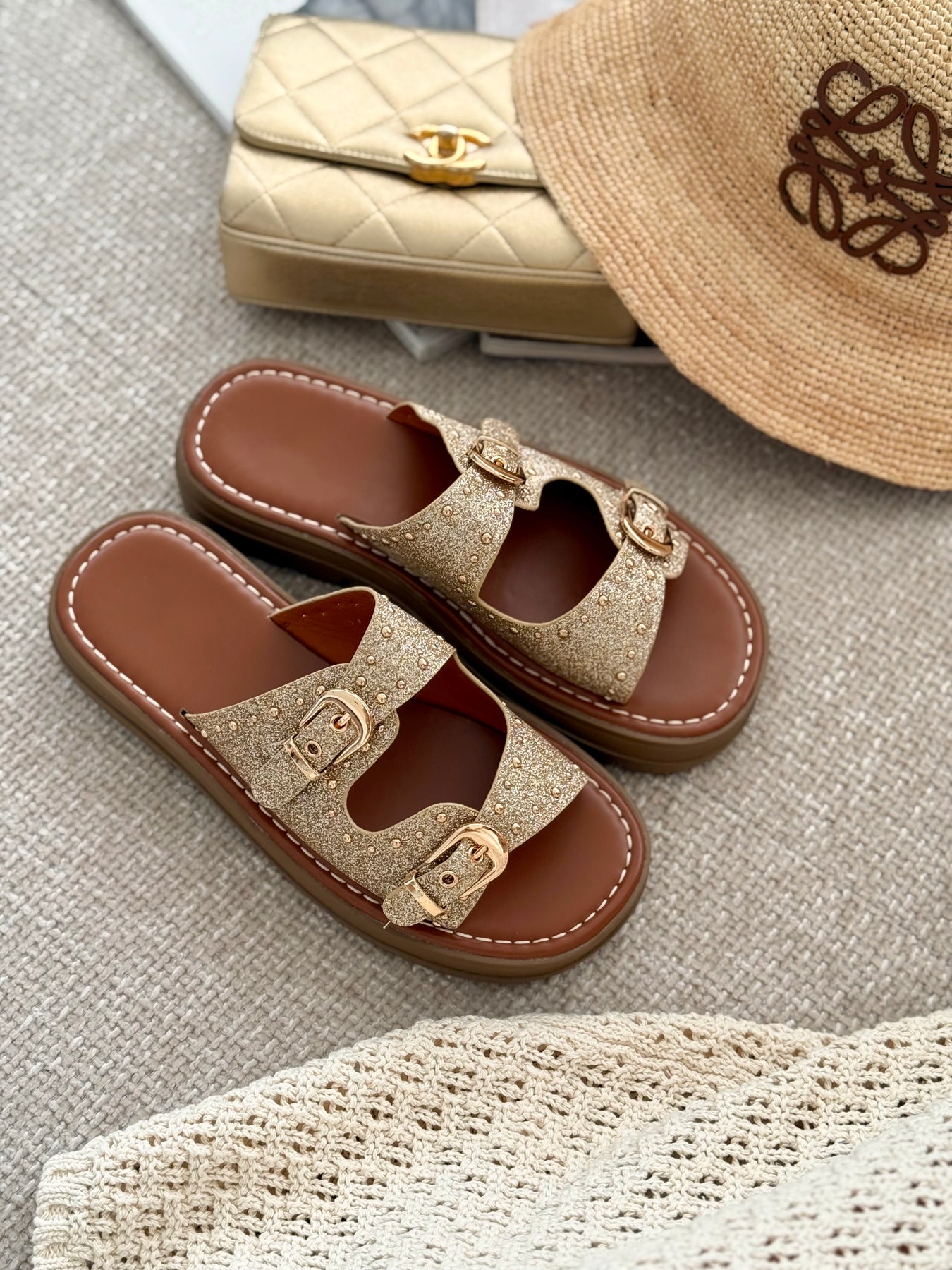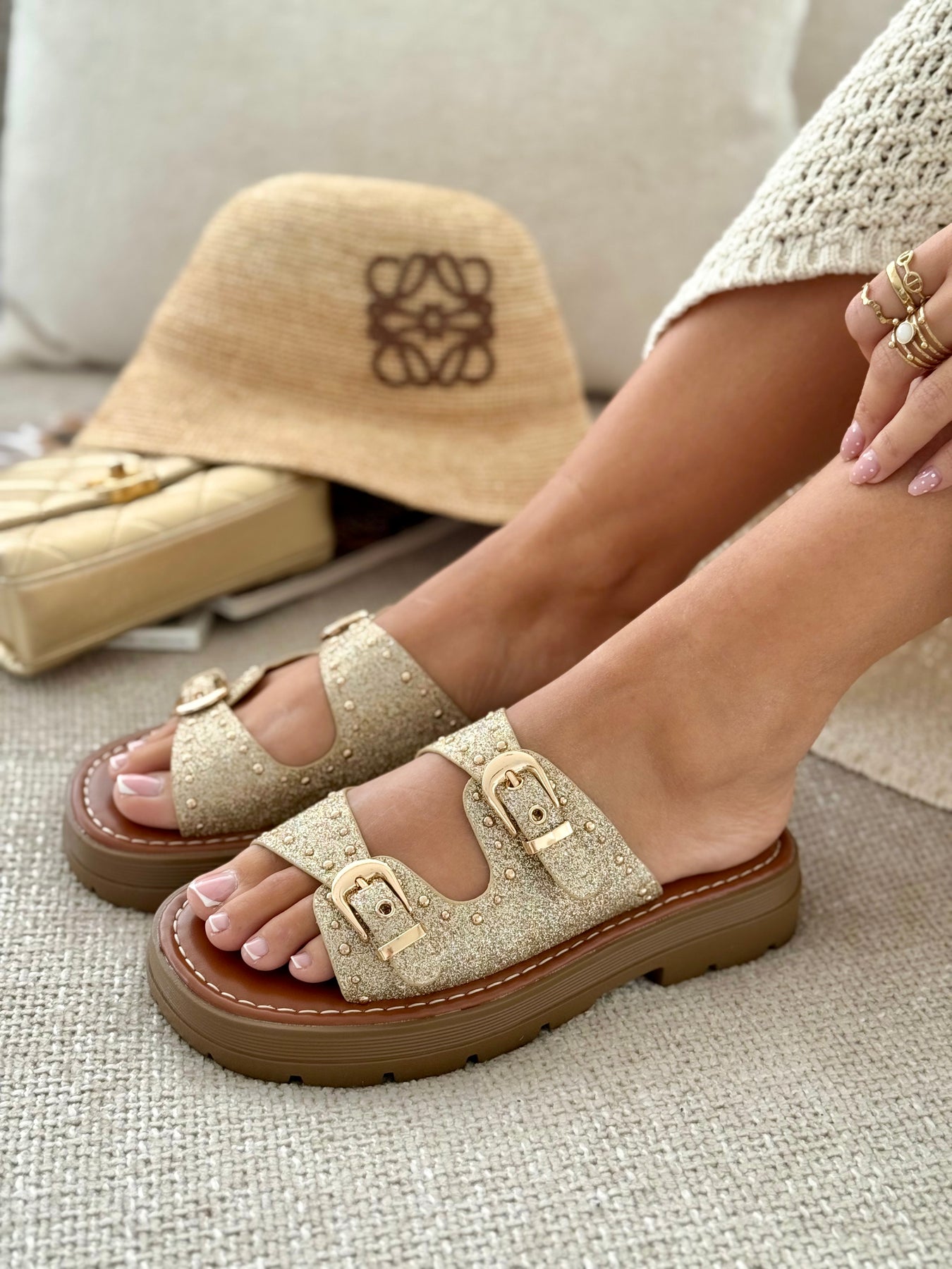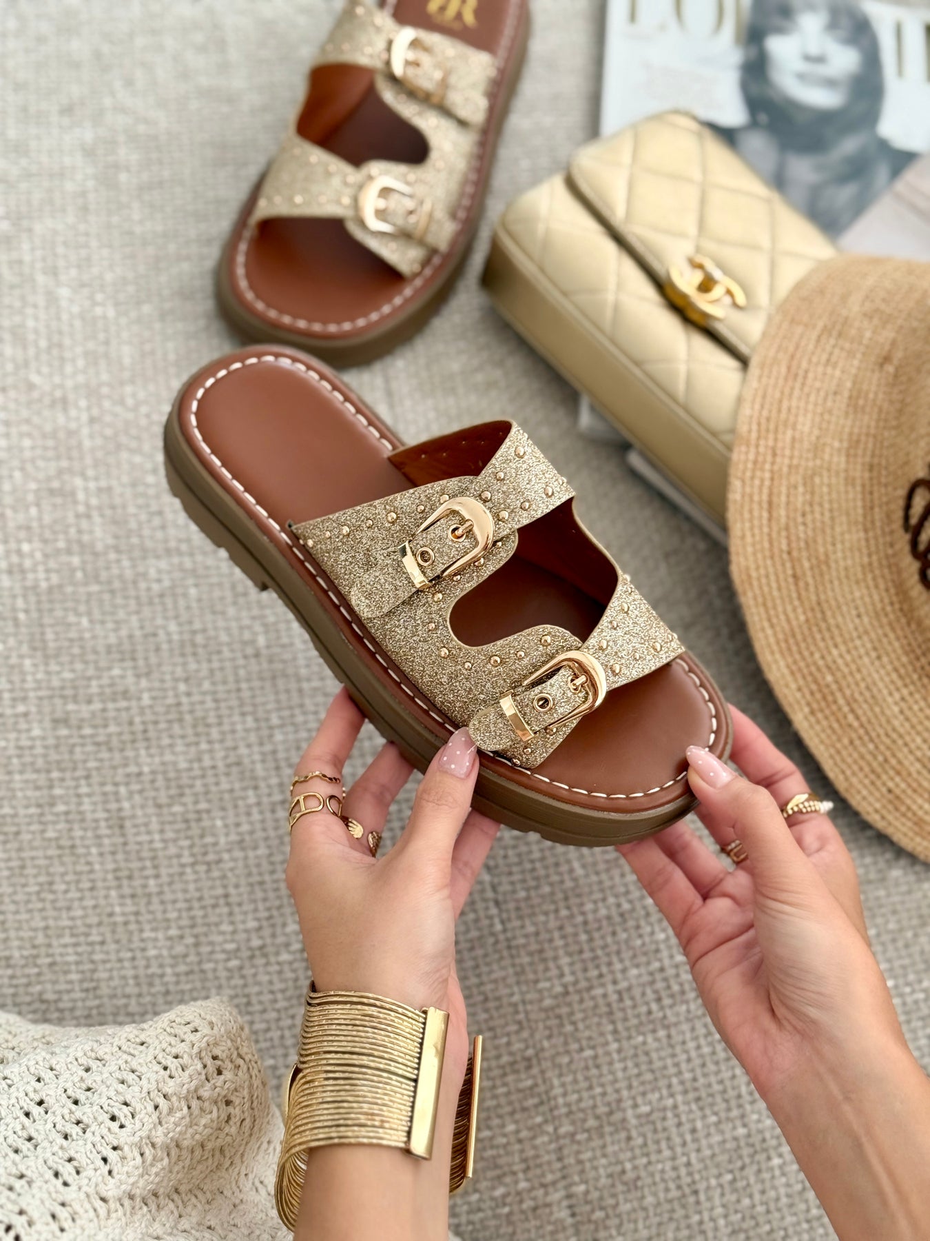 - Détails du modèle : sandales plates type mules avec double brides larges, boucles ajustables dorées, finition pailletée avec petits clous décoratifs, semelle épaisse et confortable, design moderne et tendance, silhouette casual chic