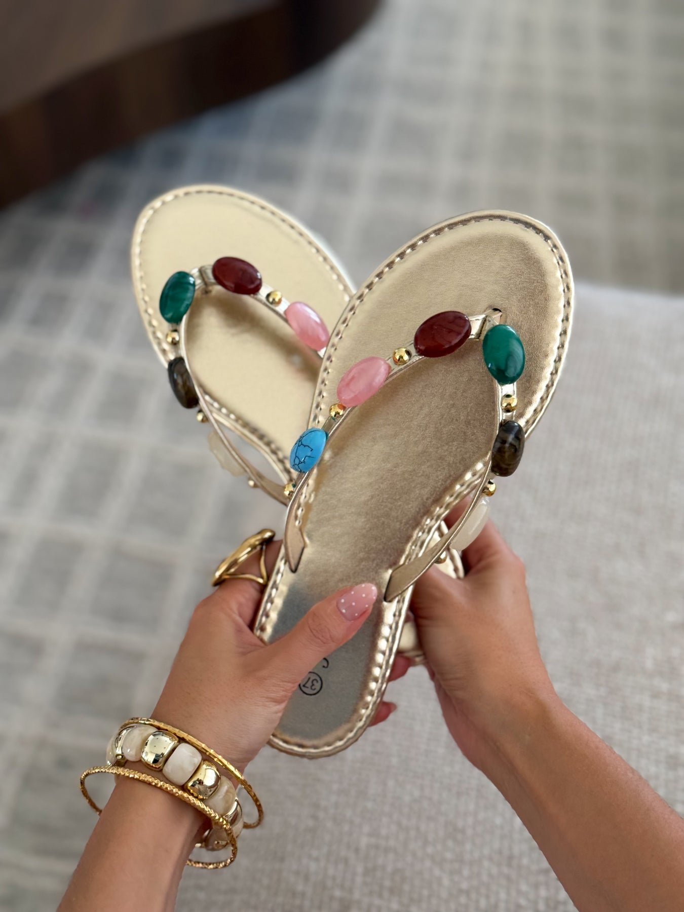 - Détails du modèle : sandales plates type entredoigt, finition dorée lumineuse, brides fines ornées de pierres colorées (turquoise, rose, vert, bordeaux…), design bijou élégant, semelle fine et confortable,modèle facile à enfiler