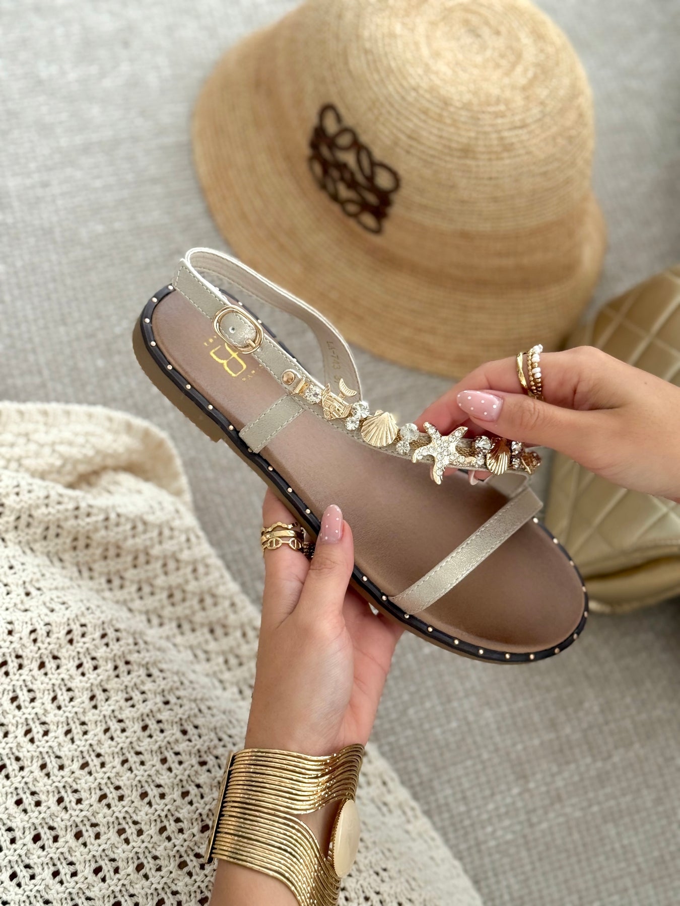 - Détails du modèle : sandales plates avec bride fine à l’avant et bride cheville ajustable, ornement central composé de coquillages, étoiles de mer et strass lumineux, semelle légèrement contrastée avec finition cloutée, design délicat et raffiné, silhouette estivale chic et féminine