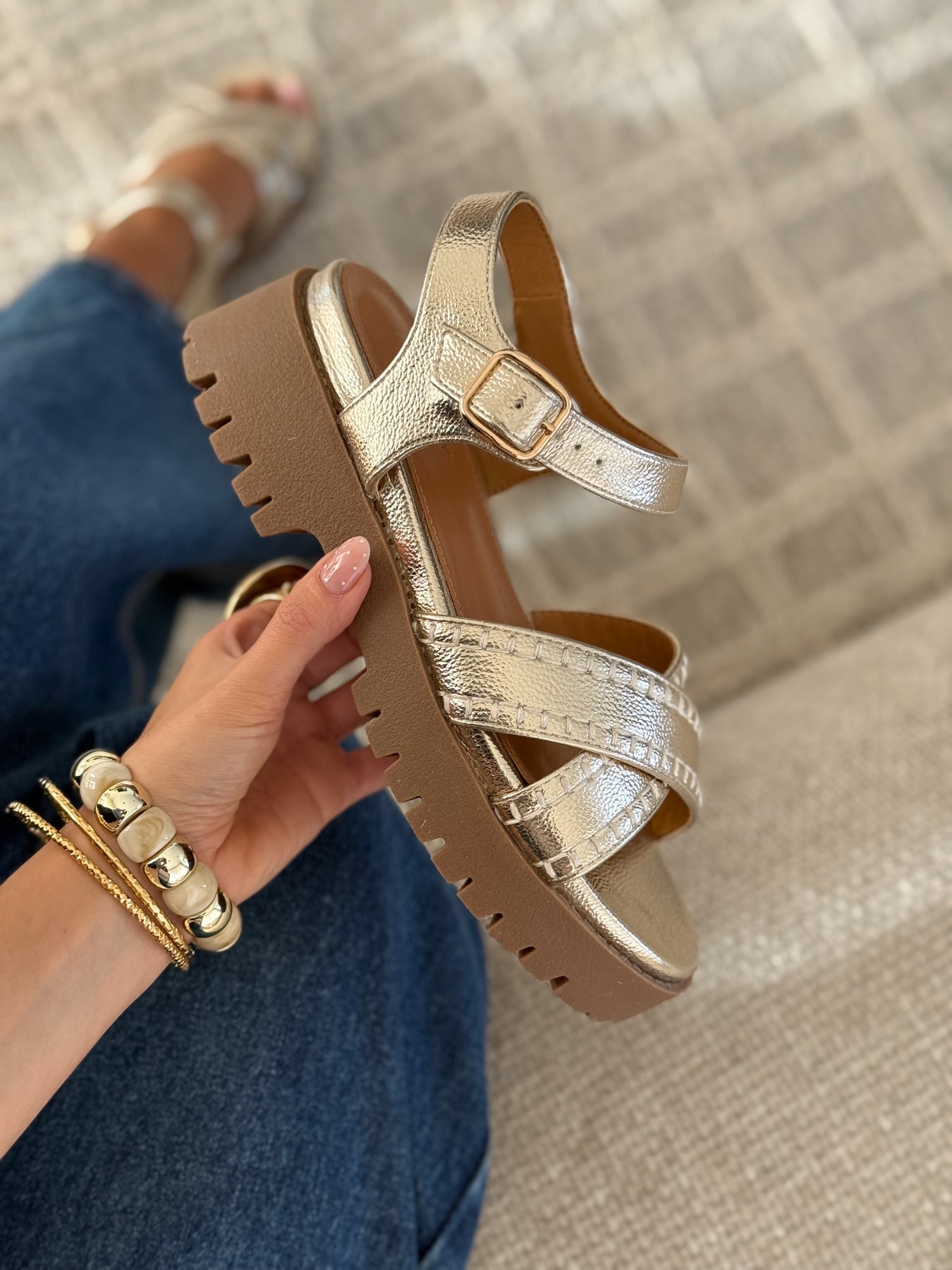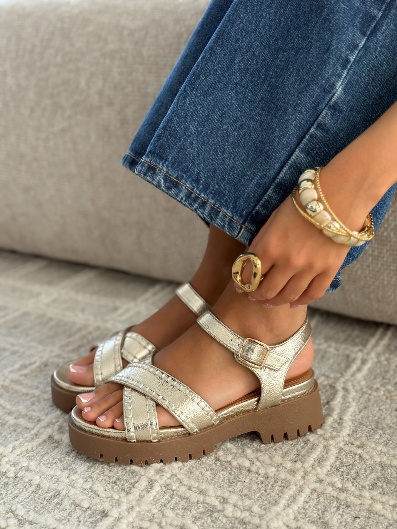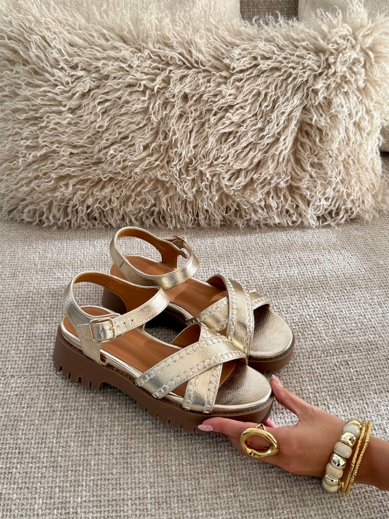- Détails du modèle : sandales à semelle épaisse crantée camel, brides croisées à l’avant avec finitions surpiquées, bride cheville réglable avec boucle dorée, effet cuir métallisé lumineux, silhouette moderne et confortable
