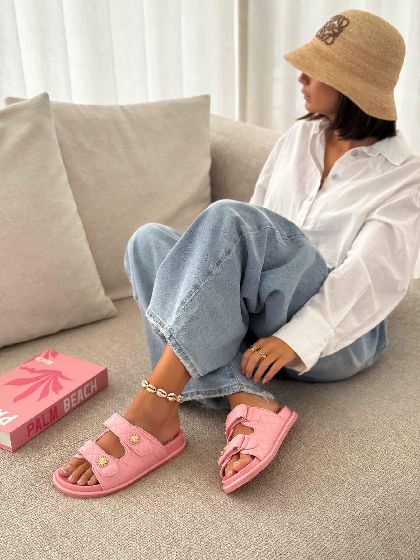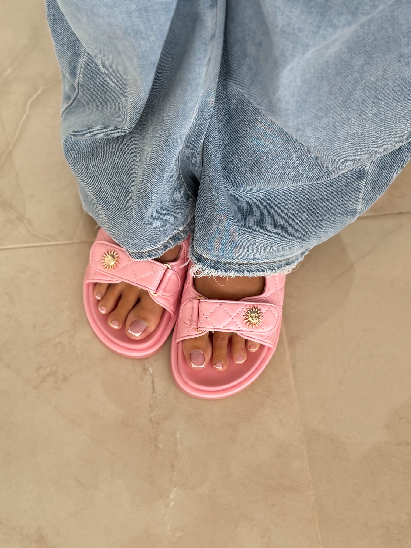 - Détails du modèle : sandales plates type mules avec double brides larges, fermeture scratch, effet matelassé sur les brides, détails soleil dorés décoratifs, semelle confortable et légère, design tendance et casual
