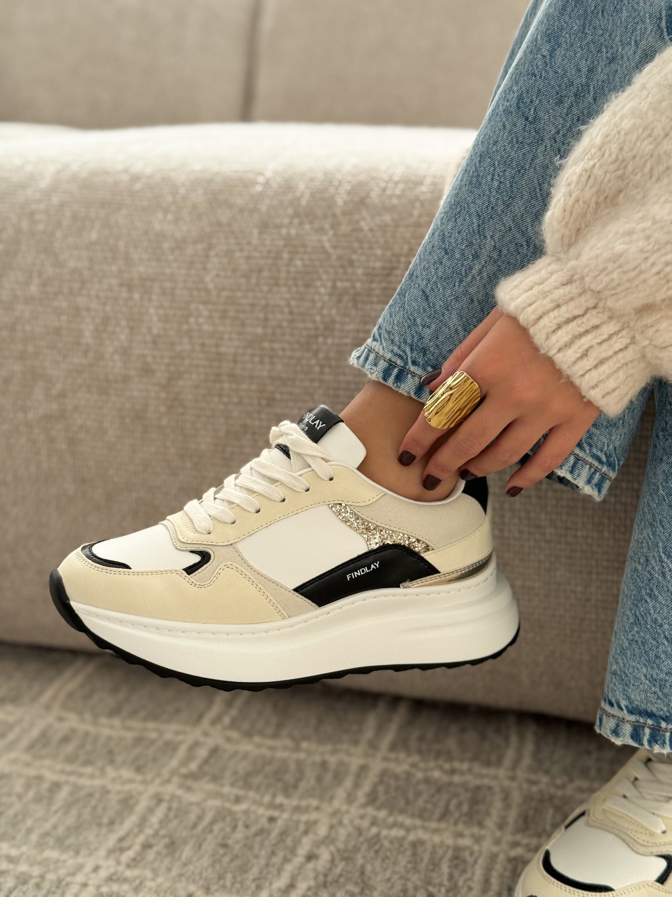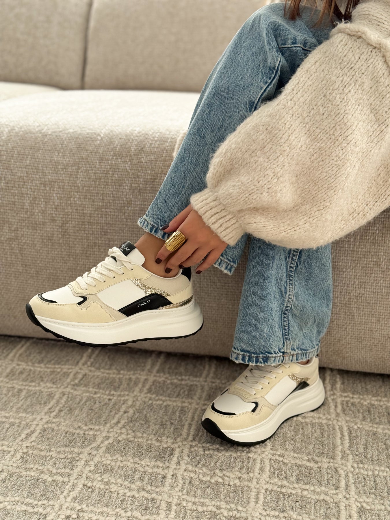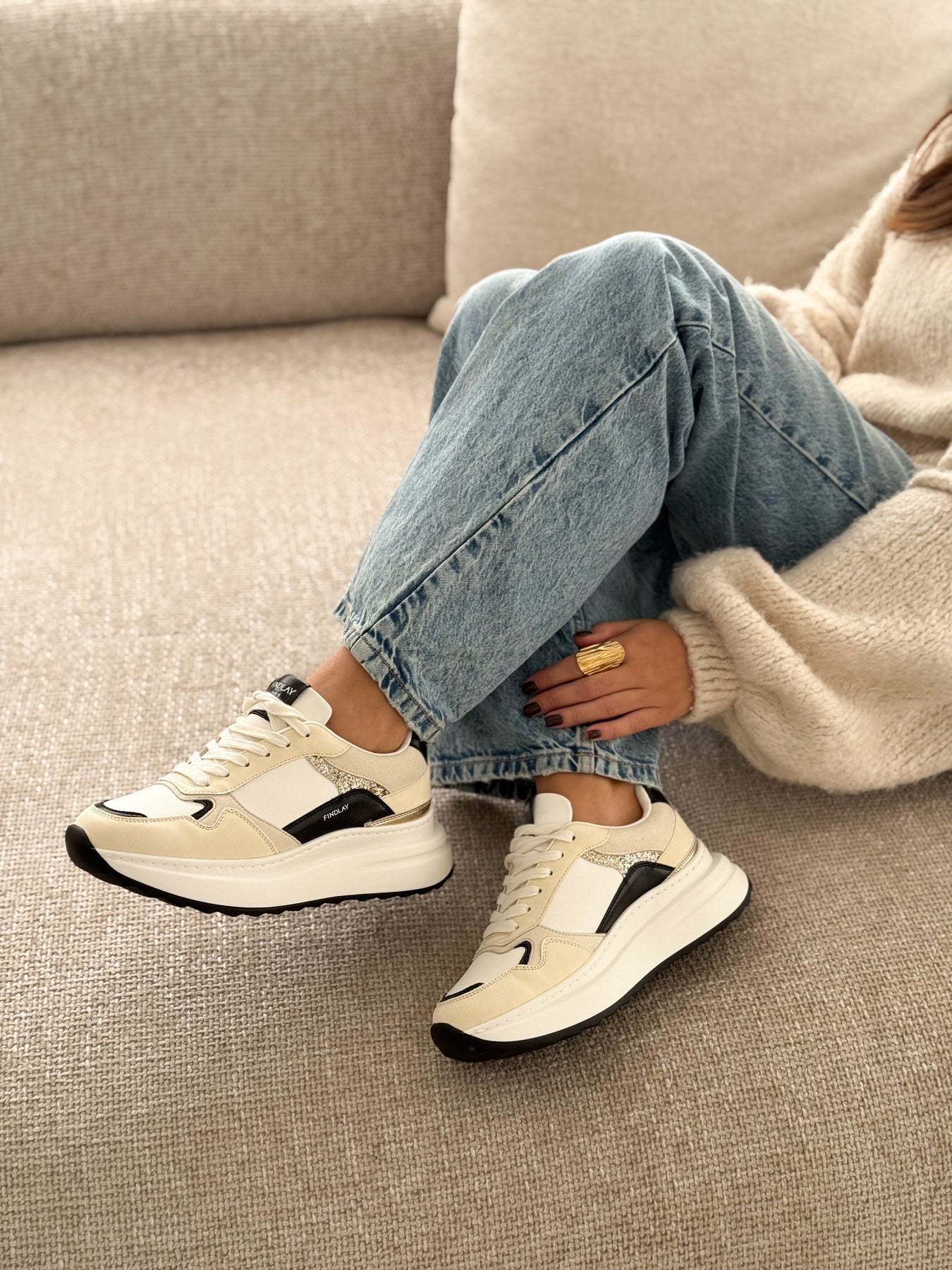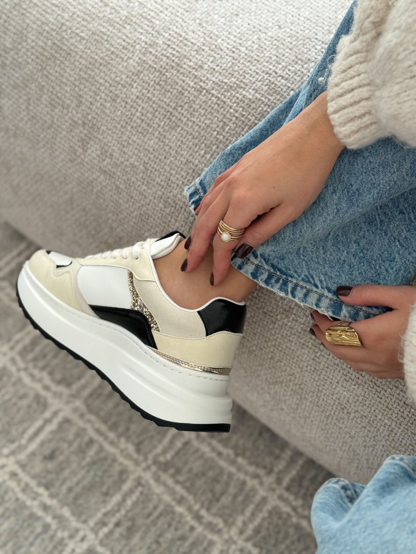 Les baskets AIKA Crème & Noir offrent un look à la fois moderne, minimaliste et tendance. Leur semelle épaisse apporte une belle hauteur tout en restant hyper confortable. Les touches glitter argentées ajoutent un éclat discret qui élève immédiatement la silhouette , parfaites avec un jean, un pantalon large ou une tenue décontractée chic.