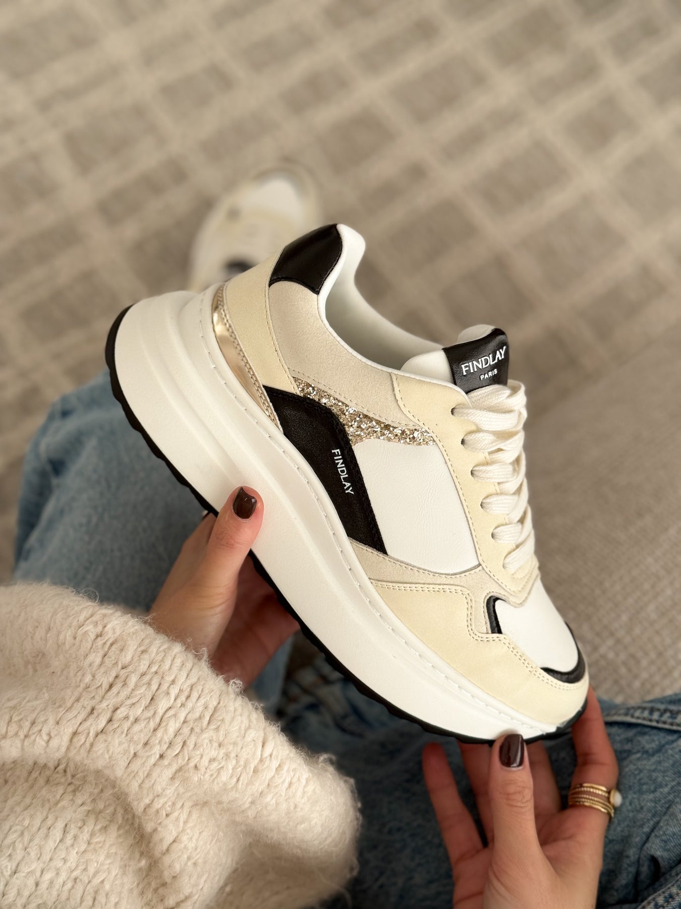 - Détails du modèle : semelle épaisse moderne, empiècements crème et noir, contour glitter argenté au talon, lacets crème, forme sporty-chic, renfort talon noir