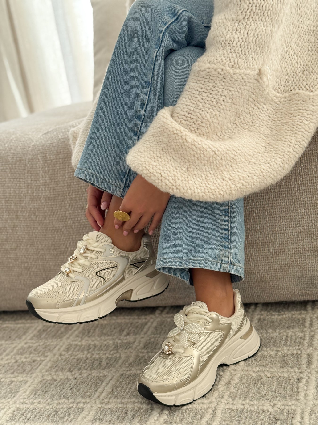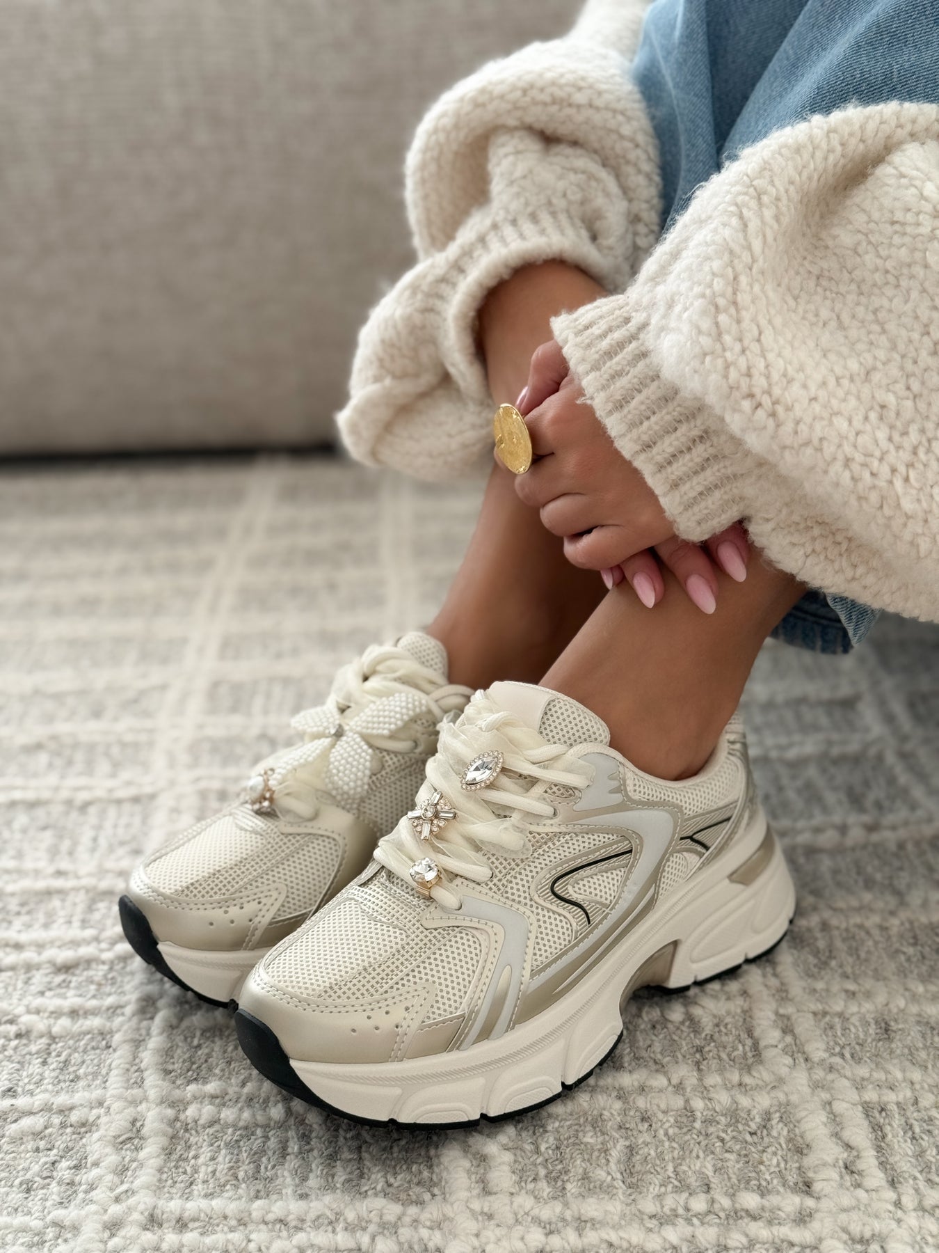 - Détails du modèle : Baskets basses à lacets, silhouette chunky élégante, empiècements écru et beige, détails métallisés subtils, lacets ornés de bijoux amovibles (nœud perlé, strass et pierre décorative), semelle épaisse sculptée, finitions soignées.
