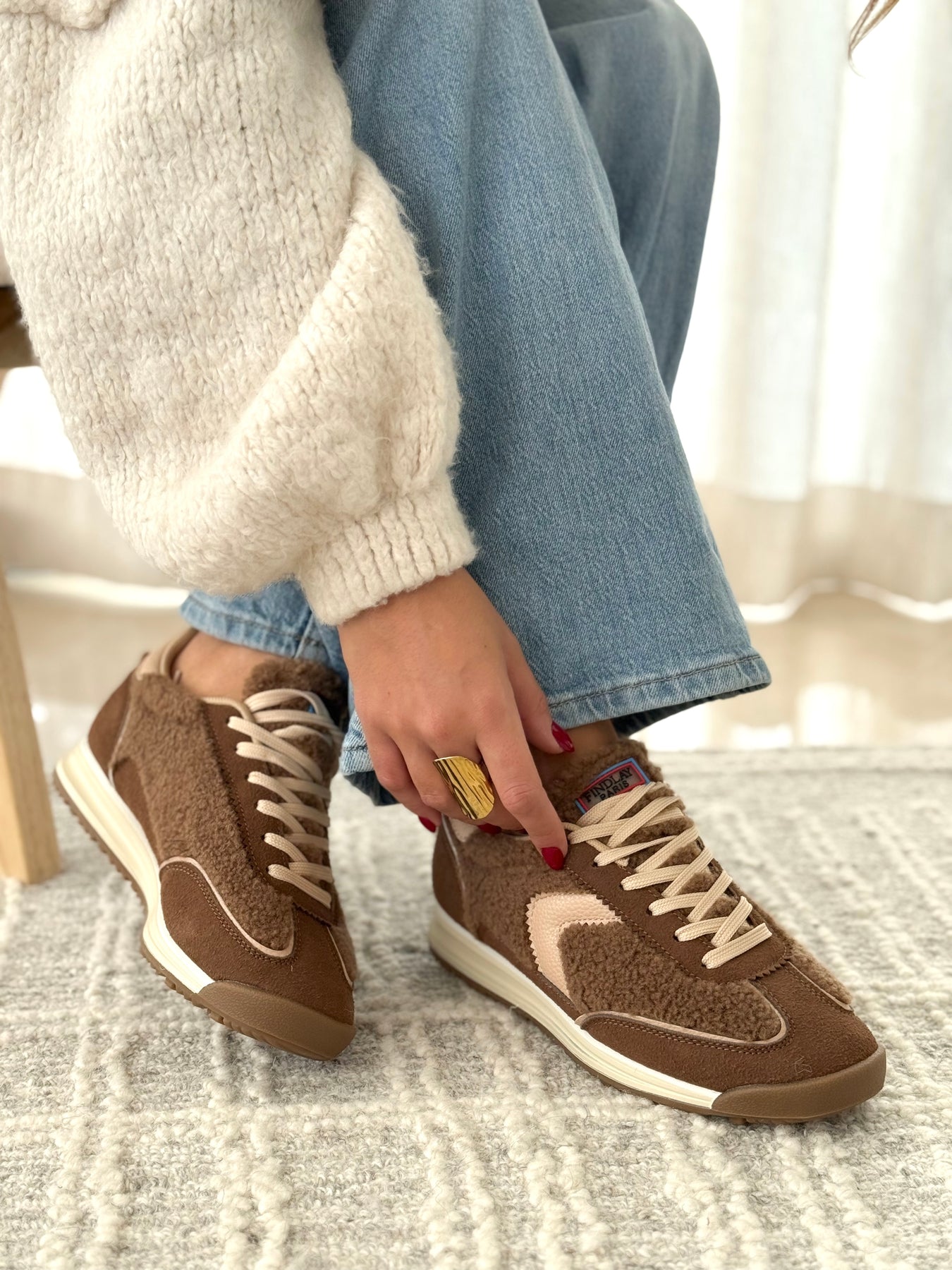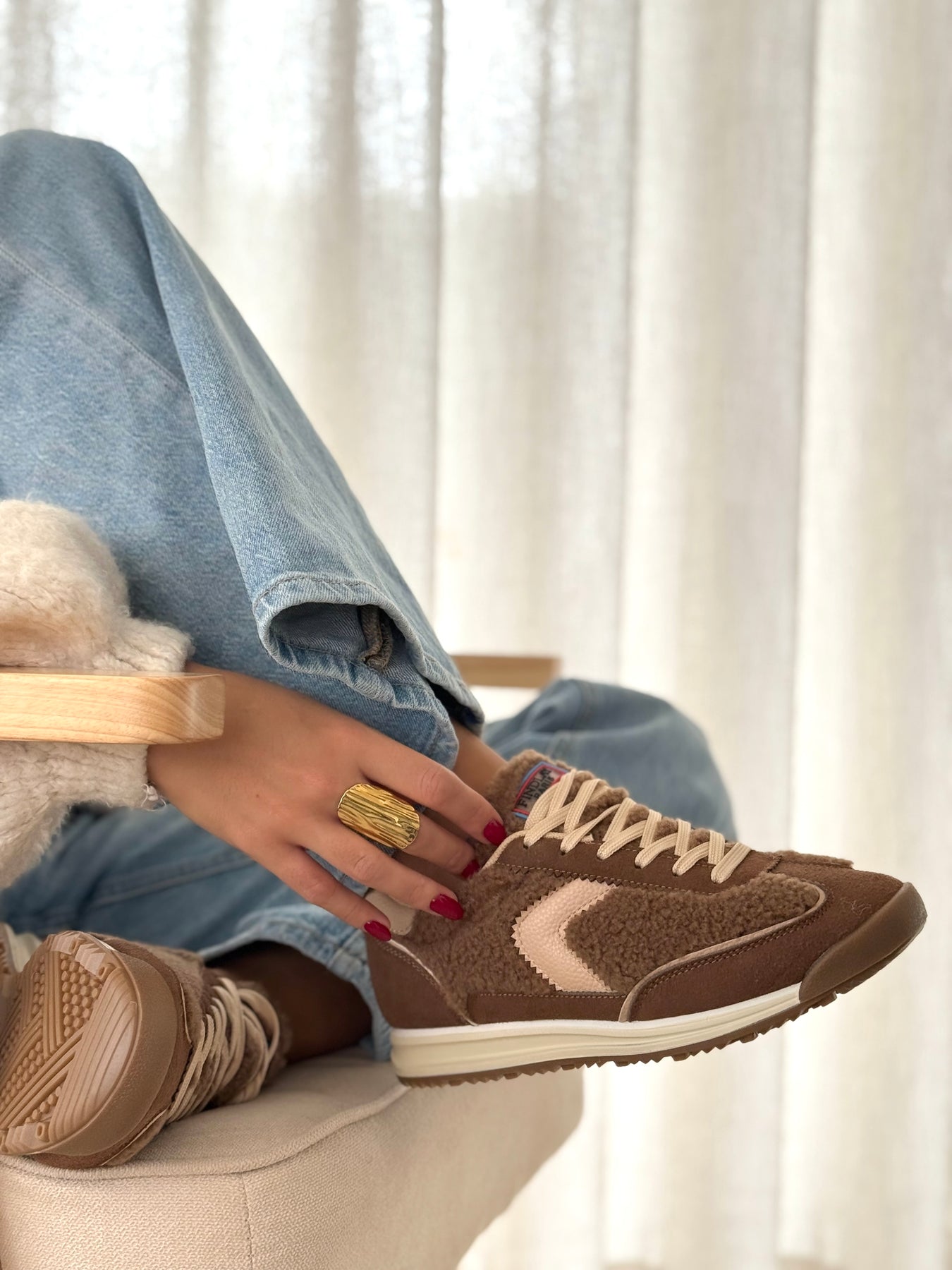 Ces sneakers marron revisitent l’esprit rétro running avec une touche cosy et moderne. Leur jeu de matières texturées apporte du relief, tandis que la semelle légère assure confort et souplesse au quotidien. Un modèle facile à porter, qui twiste un jean casual ou complète une robe pour un look sporty chic.