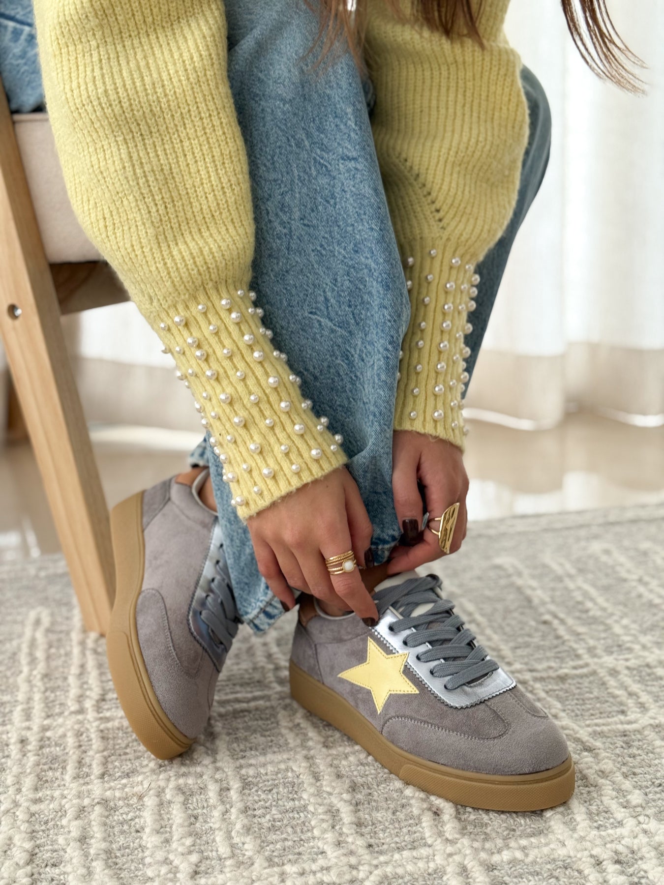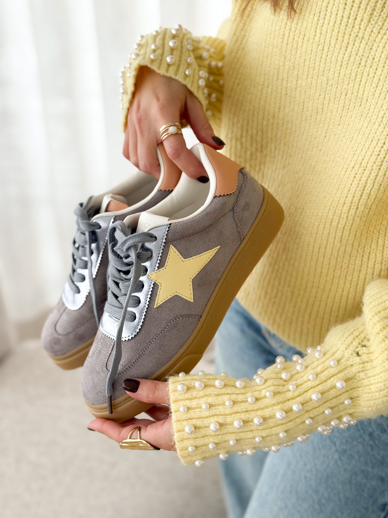 - Détails du modèle : Etoile contrastante jaune pastel, empiècement talon nude, lacets gris, avant suédine, finition argentée autour du laçage, semelle miel tendance
