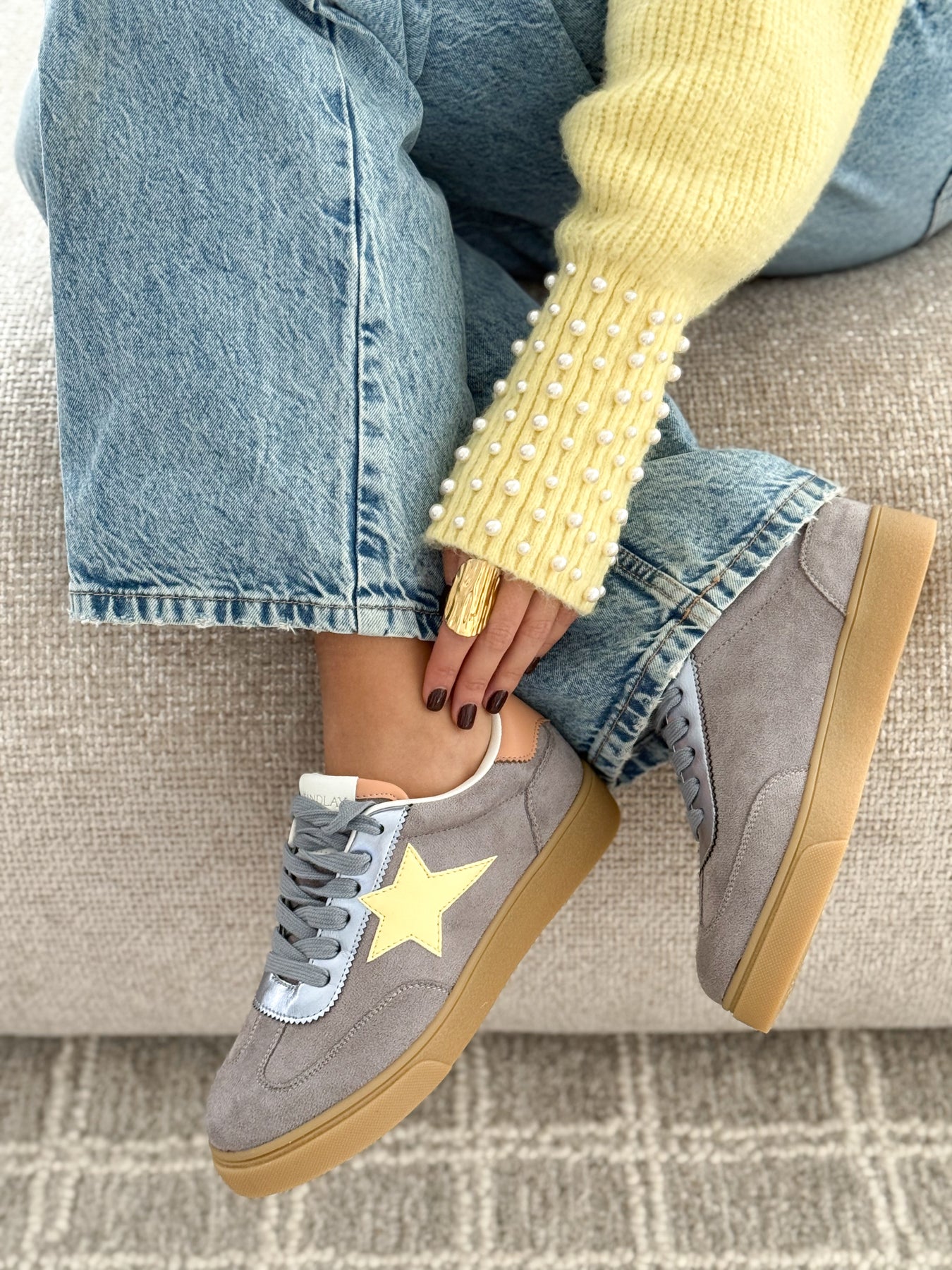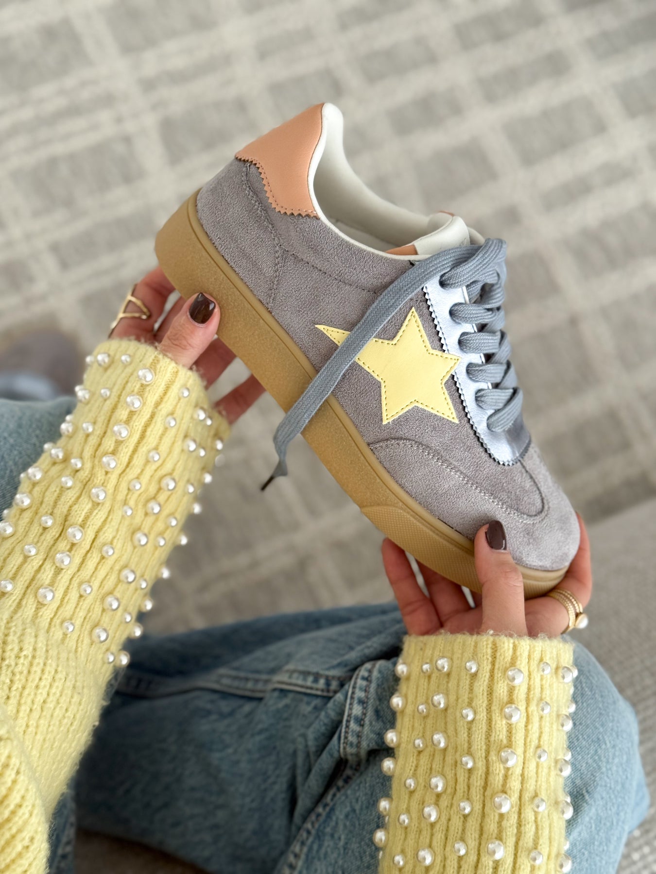Les baskets Clara combinent douceur des tons pastel et style sport-chic. Leur suédine grise apporte de la texture, tandis que l’étoile jaune donne une touche lumineuse et féminine. Ultra confortables et faciles à assortir, elles se portent aussi bien avec un jean qu’avec une jupe détente pour un look casual chic. Le modèle parfait pour illuminer vos tenues du quotidien.