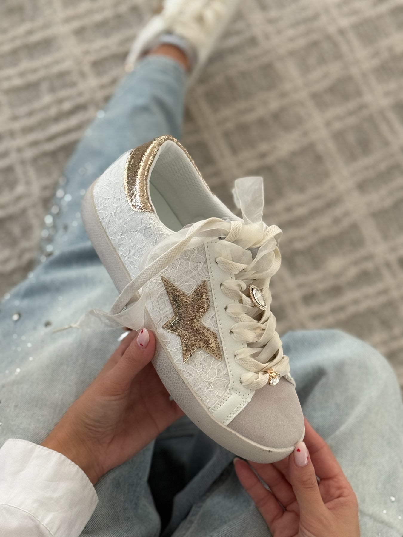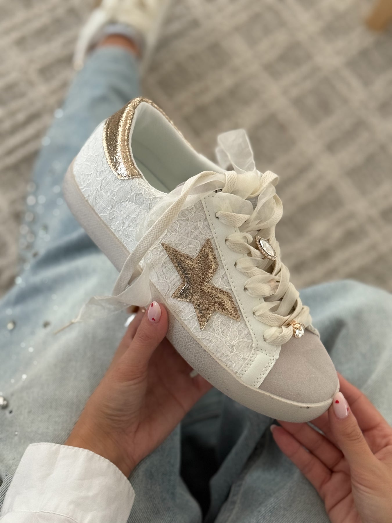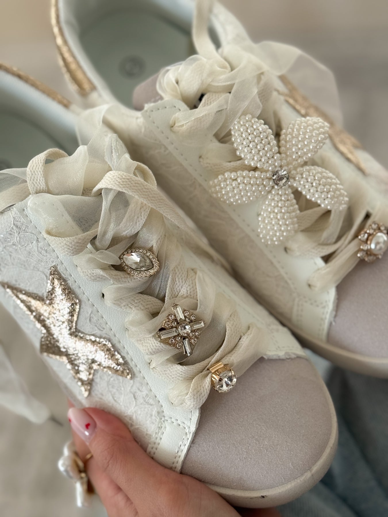 - Détails du modèle : Baskets basses, étoile latérale dorée pailletée, empiècements effet dentelle, lacets ornés de bijoux amovibles (fleur perlée et strass), bout arrondi, semelle gomme beige, talon doré pailleté, style chic, romantique et féminin
