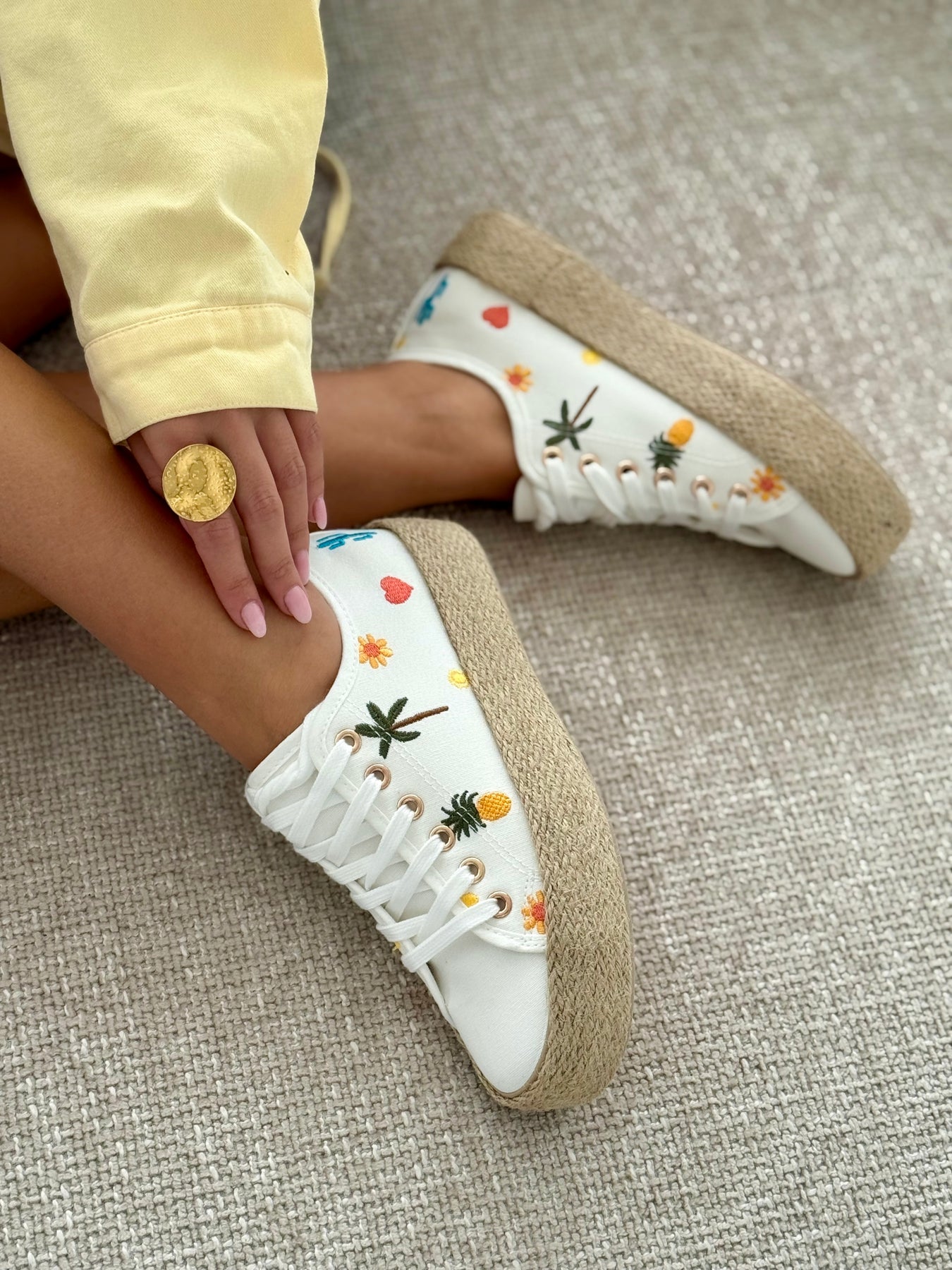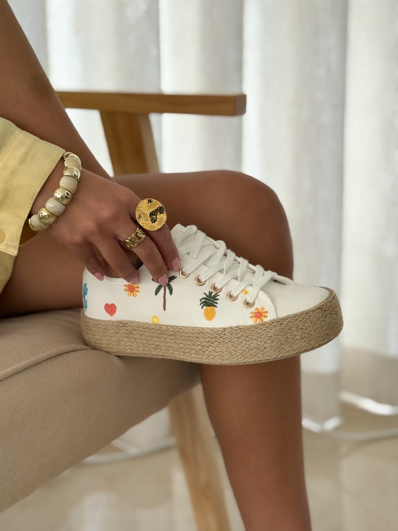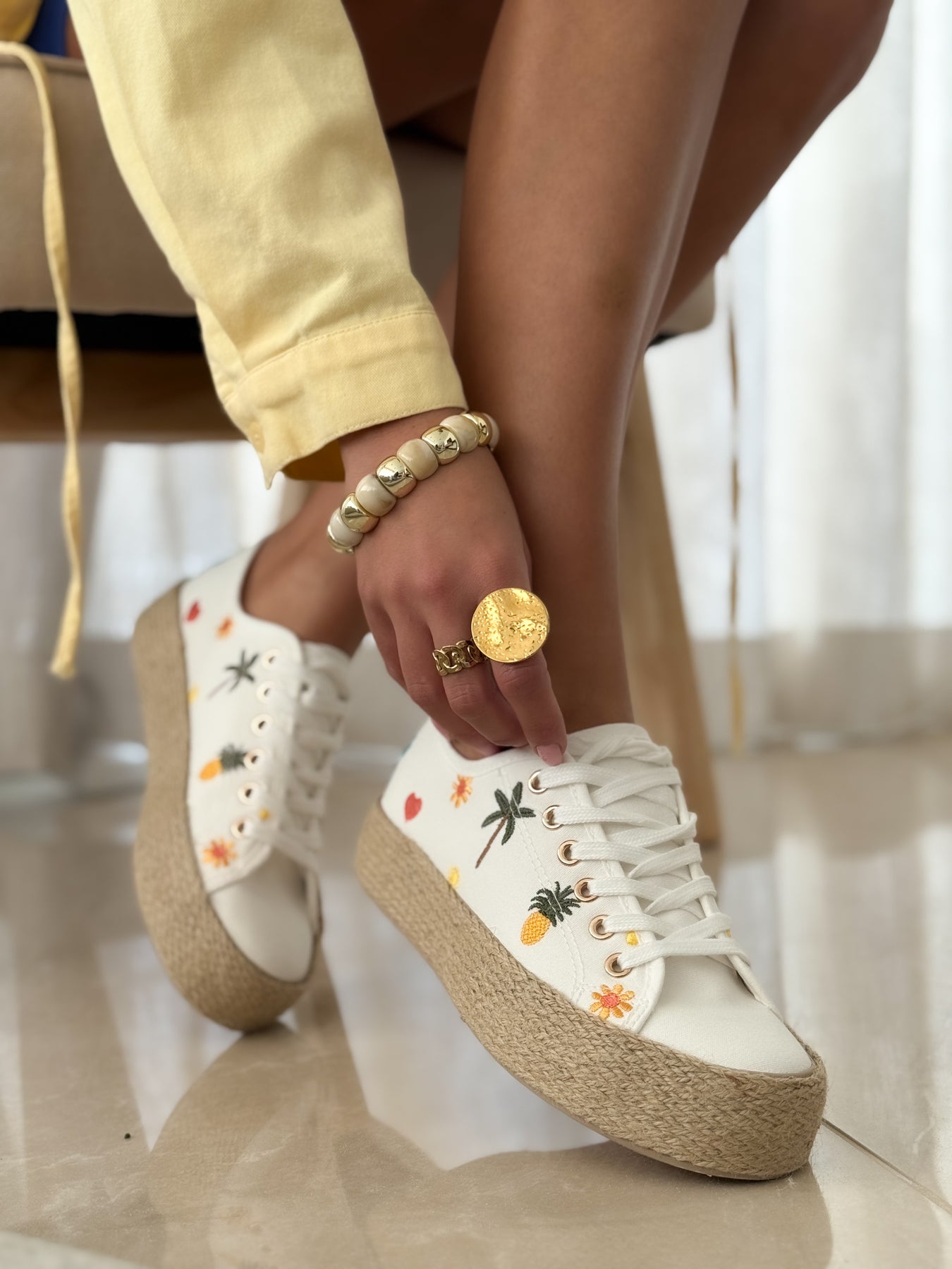 - Détails du modèle :Baskets à lacets, semelle plateforme effet corde tressée, broderies colorées esprit tropical (palmiers, ananas, fleurs), œillets métallisés dorés, finitions soignées, silhouette fraîche et féminine. central décoratif, finitions soignées, silhouette féminine et élégante