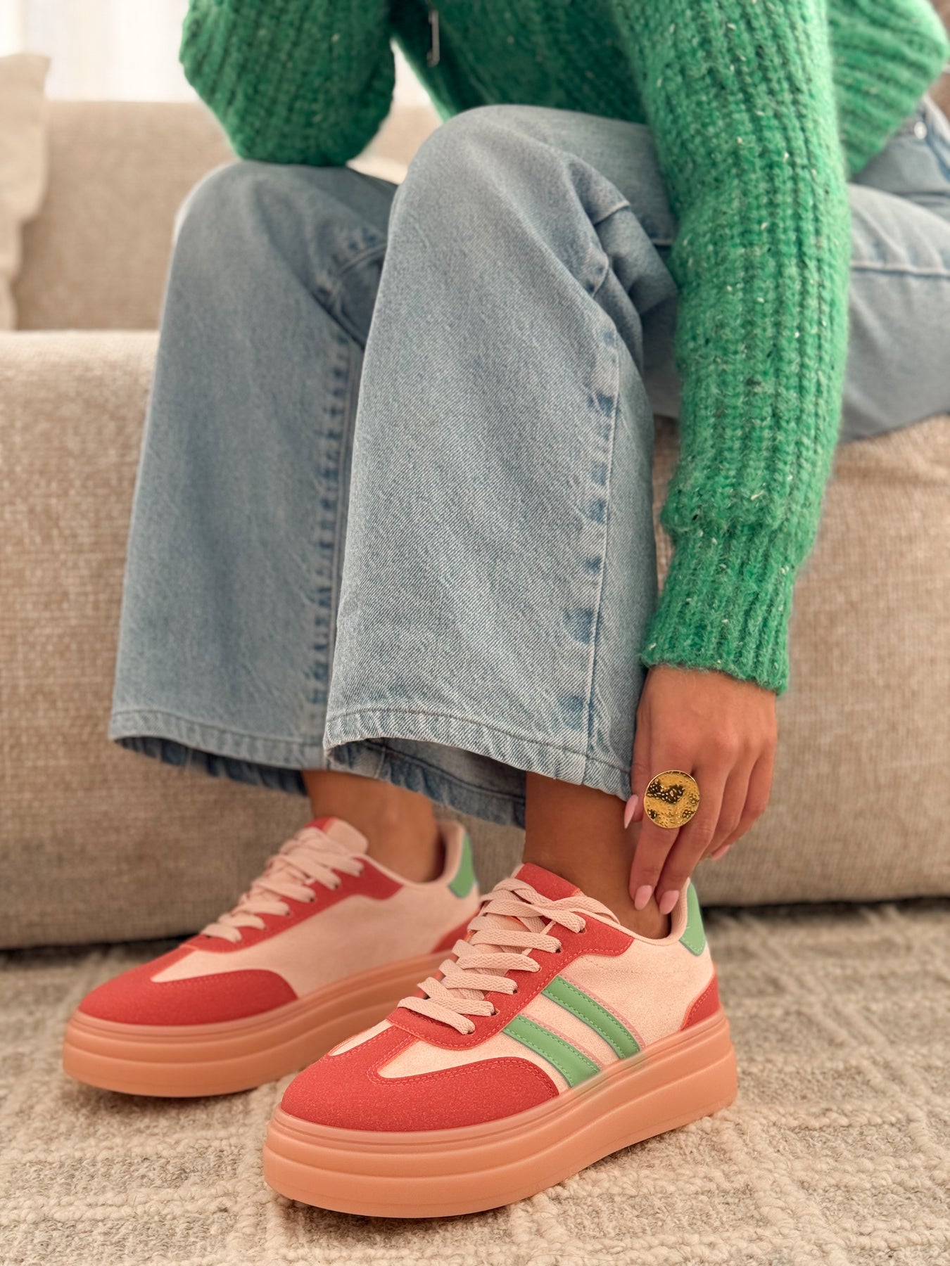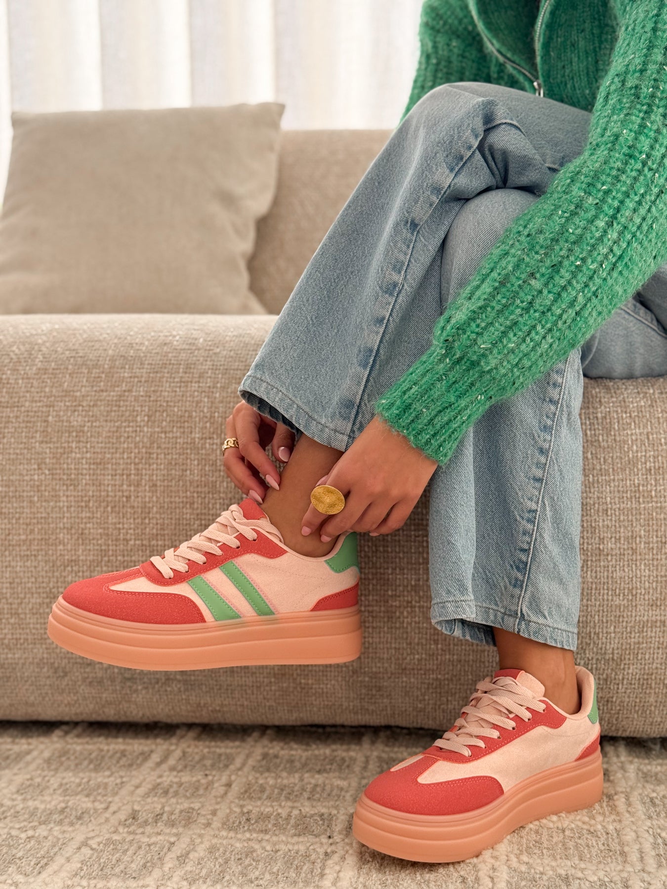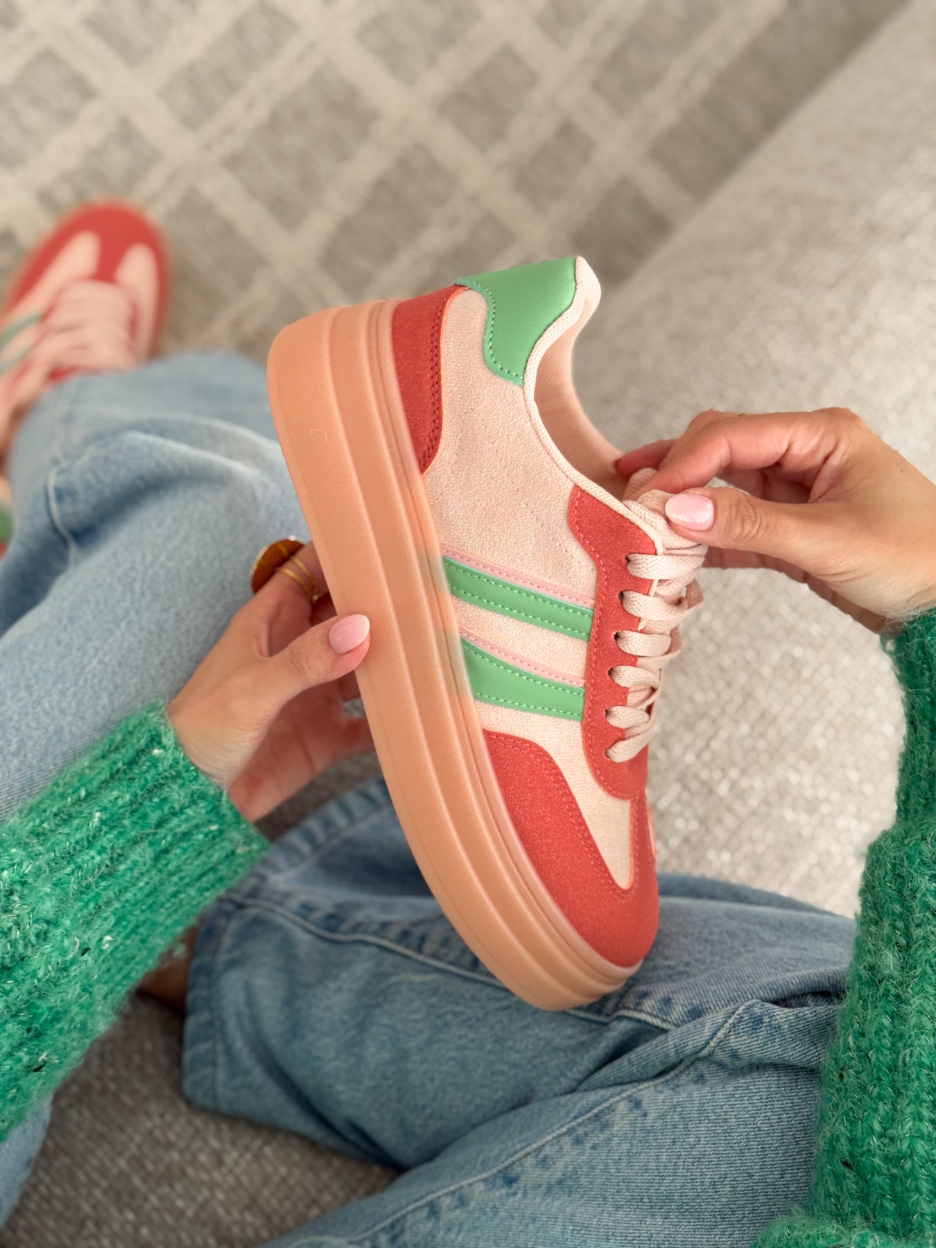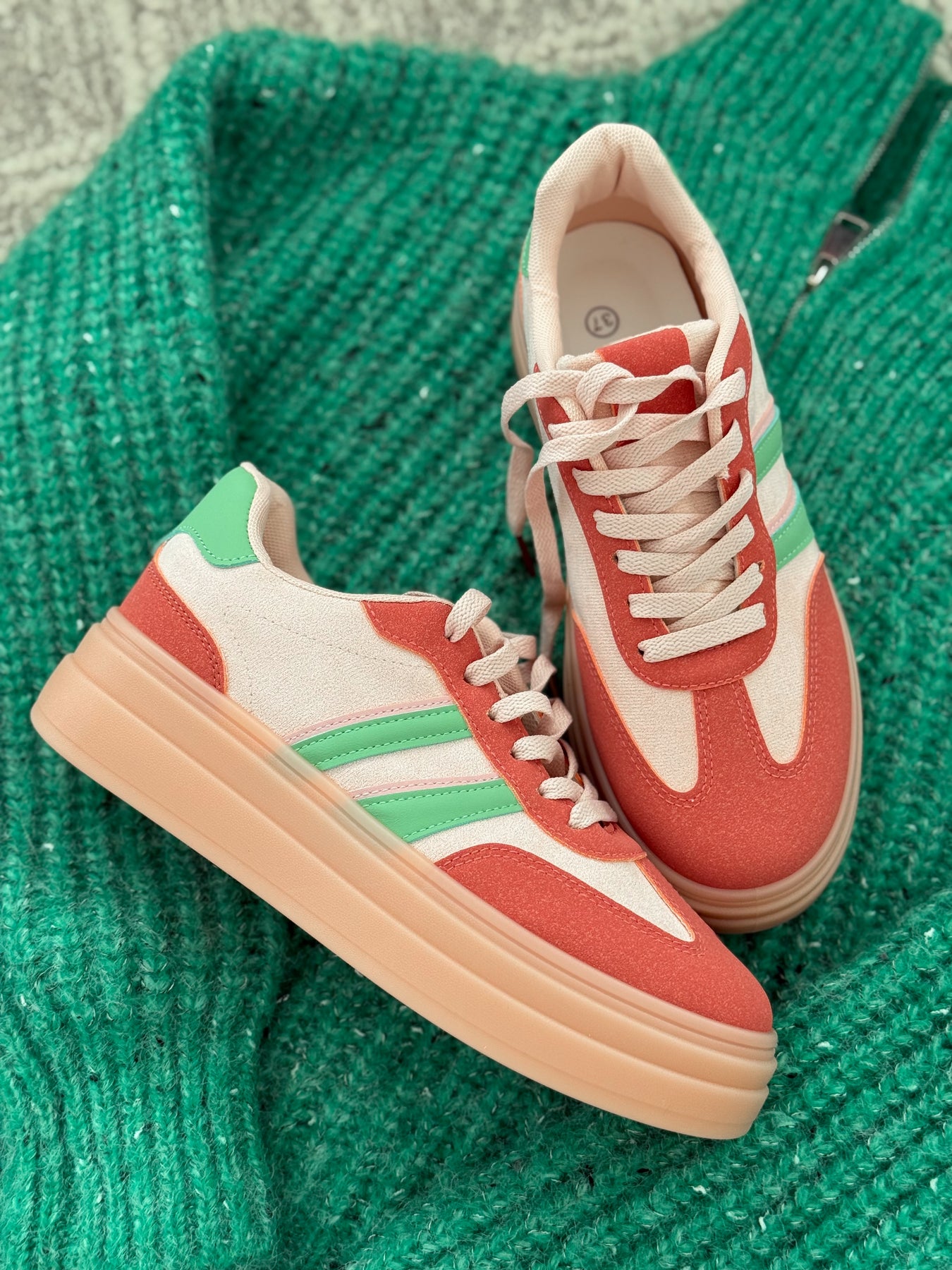 - Détails du modèle : semelle plateforme épaisse ton pêche, bandes latérales vert pastel, lacets ton sur ton, style casual coloré et lumineux