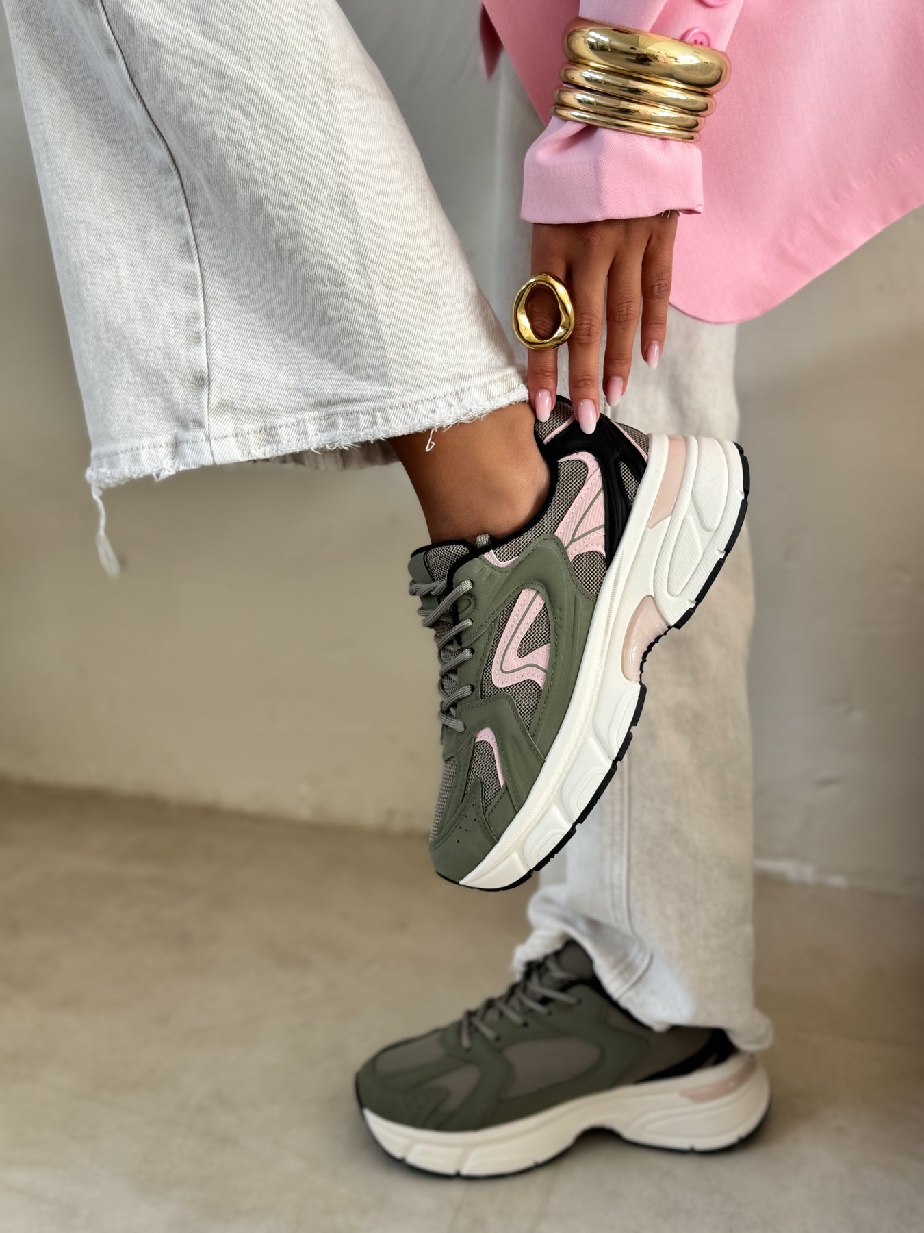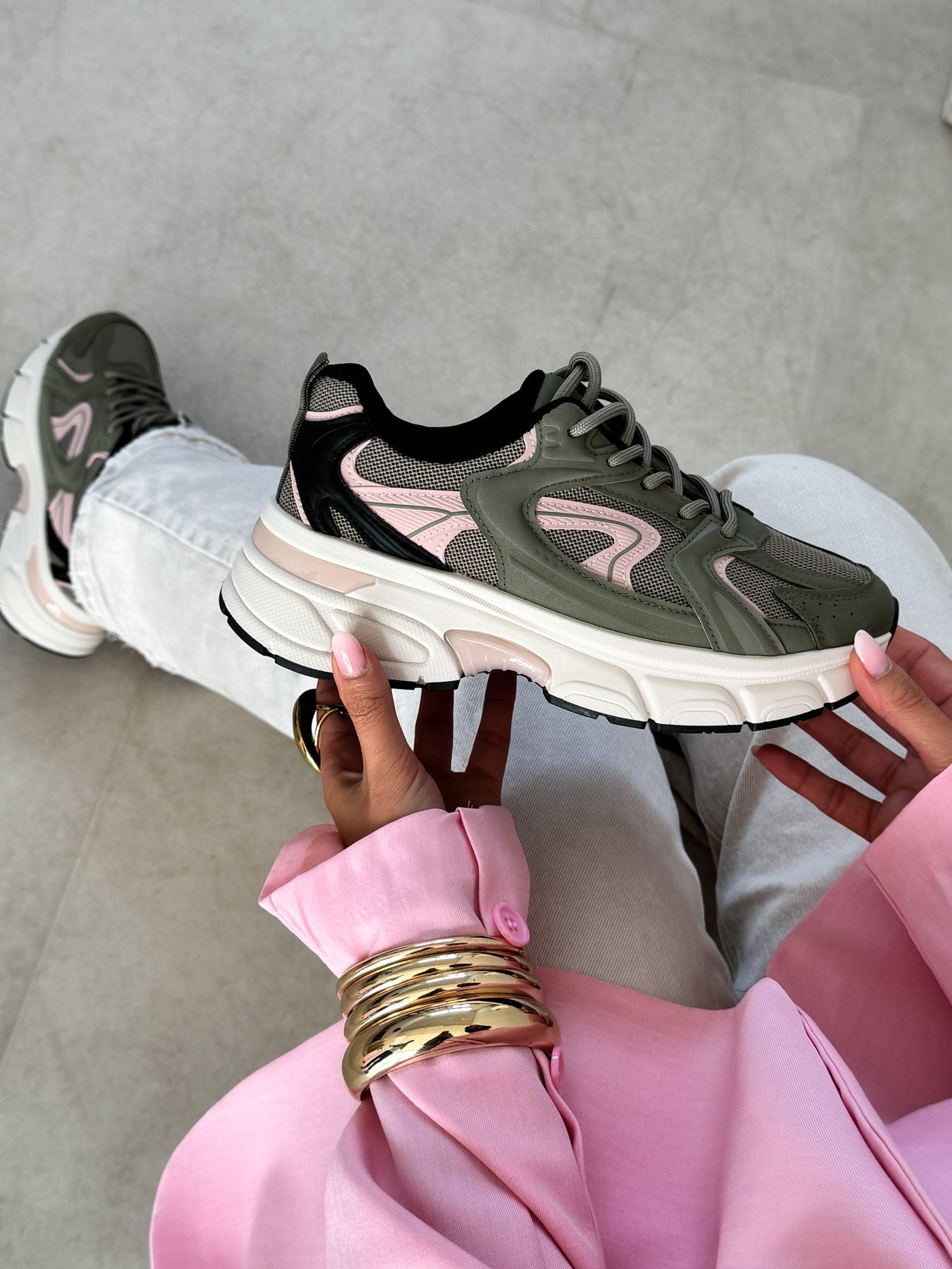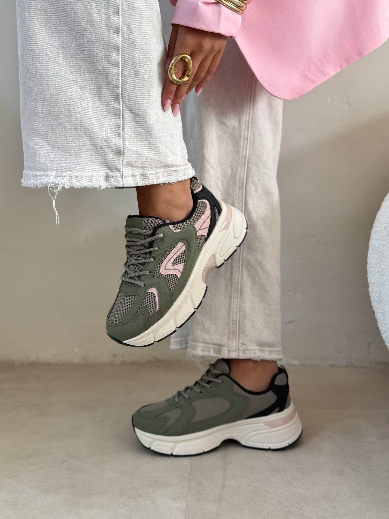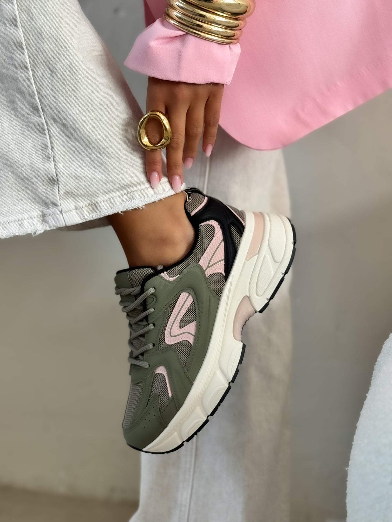 - Détails du modèle : Baskets style running avec semelle épaisse sculptée écrue, empiècements kaki structurés, détails rose poudré féminins, parties en mesh respirant beige, lacets ton sur ton, insert translucide dans la semelle, silhouette sportive et moderne