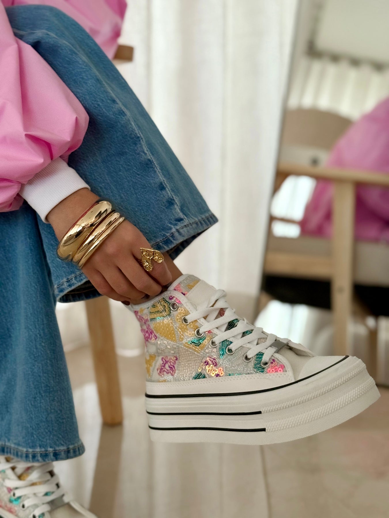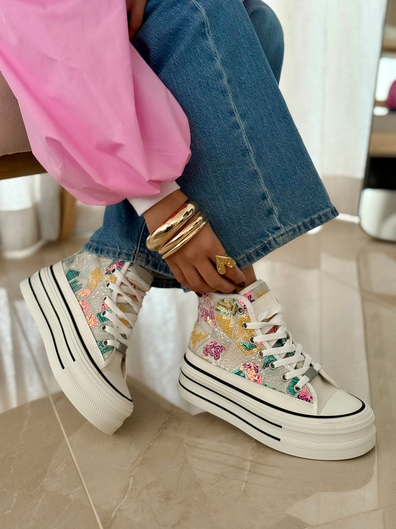 - Détails du modèle :baskets montantes à plateforme épaisse, broderies florales colorées avec sequins lumineux, semelle blanche à liserés noirs, lacets blancs, style audacieux et féminin