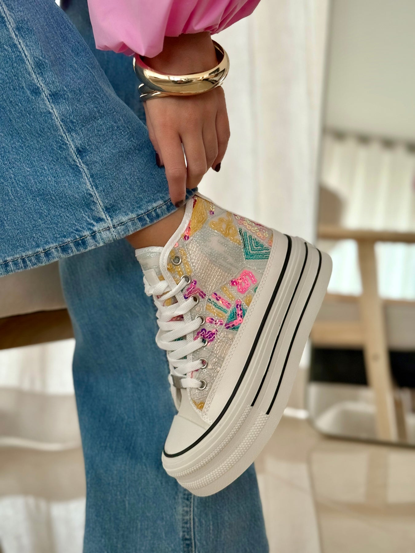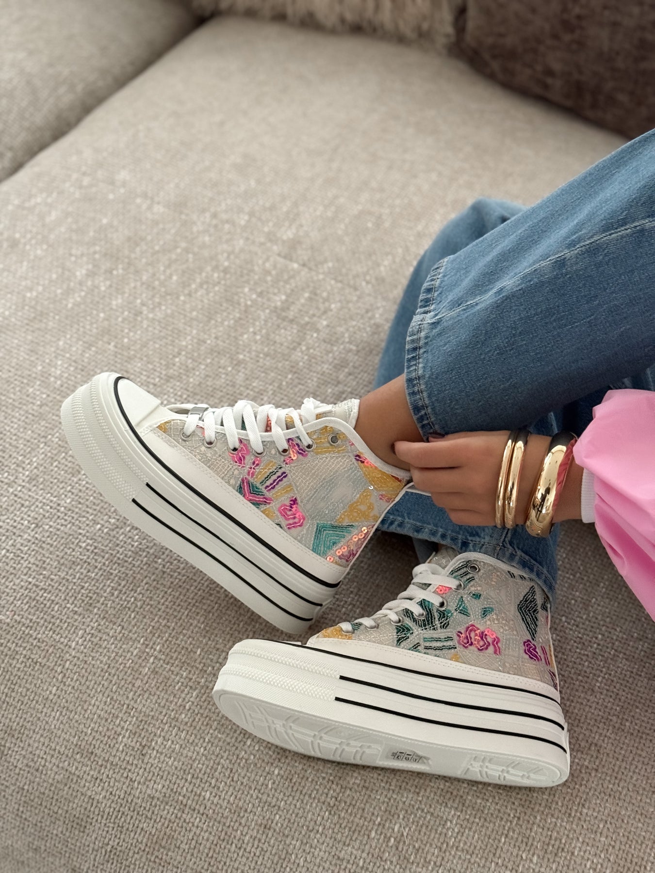 Les baskets Flora sont un véritable coup de cœur pour celles qui aiment allier confort et originalité. Leur toile brodée multicolore sublimée par des sequins irisés apporte une touche lumineuse et joyeuse à vos tenues. Montantes et dotées d’une semelle plateforme épaisse, elles offrent une allure affirmée tout en restant ultra confortables. Un modèle parfait pour dynamiser un look simple et affirmer votre style avec caractère.