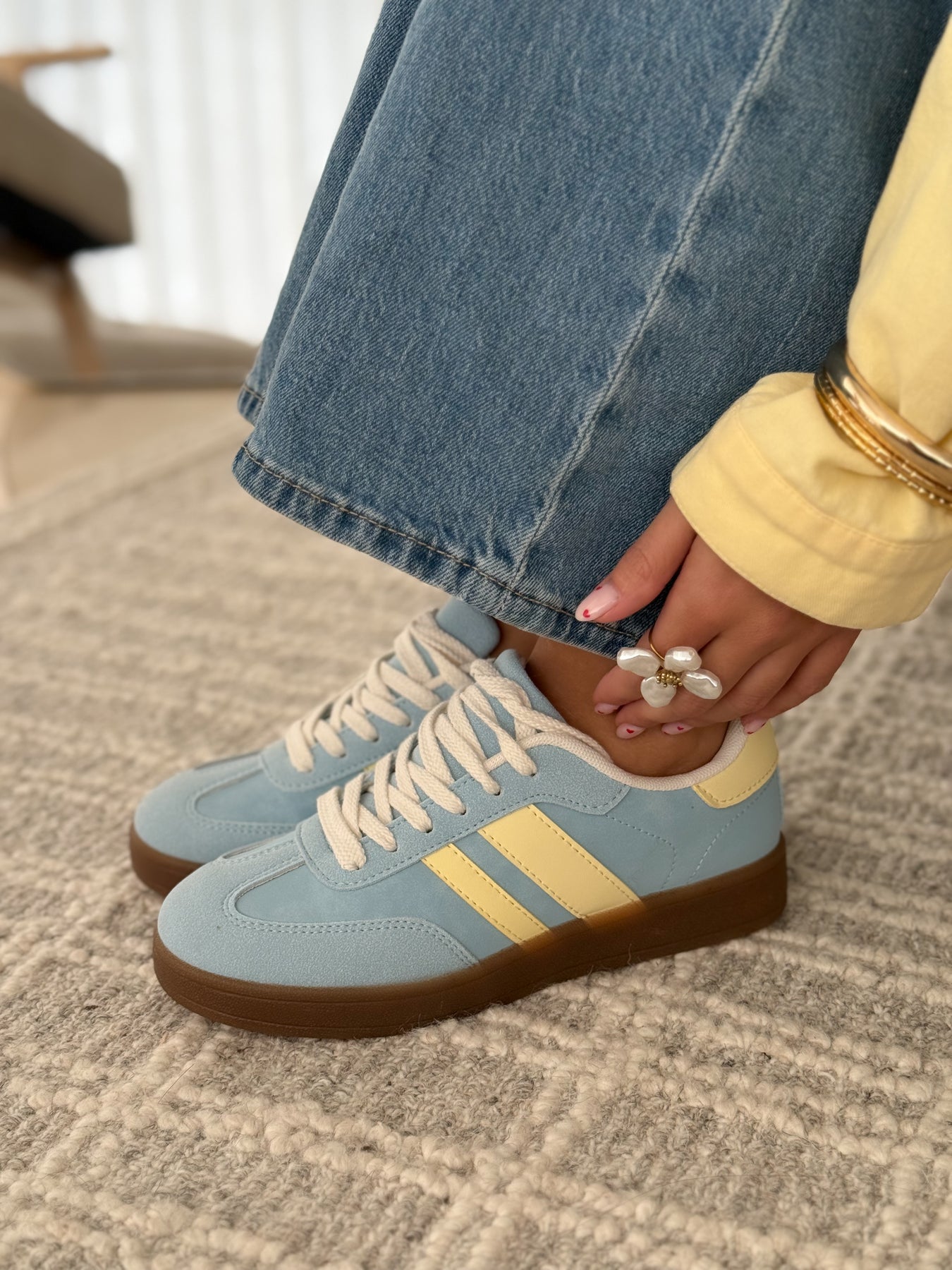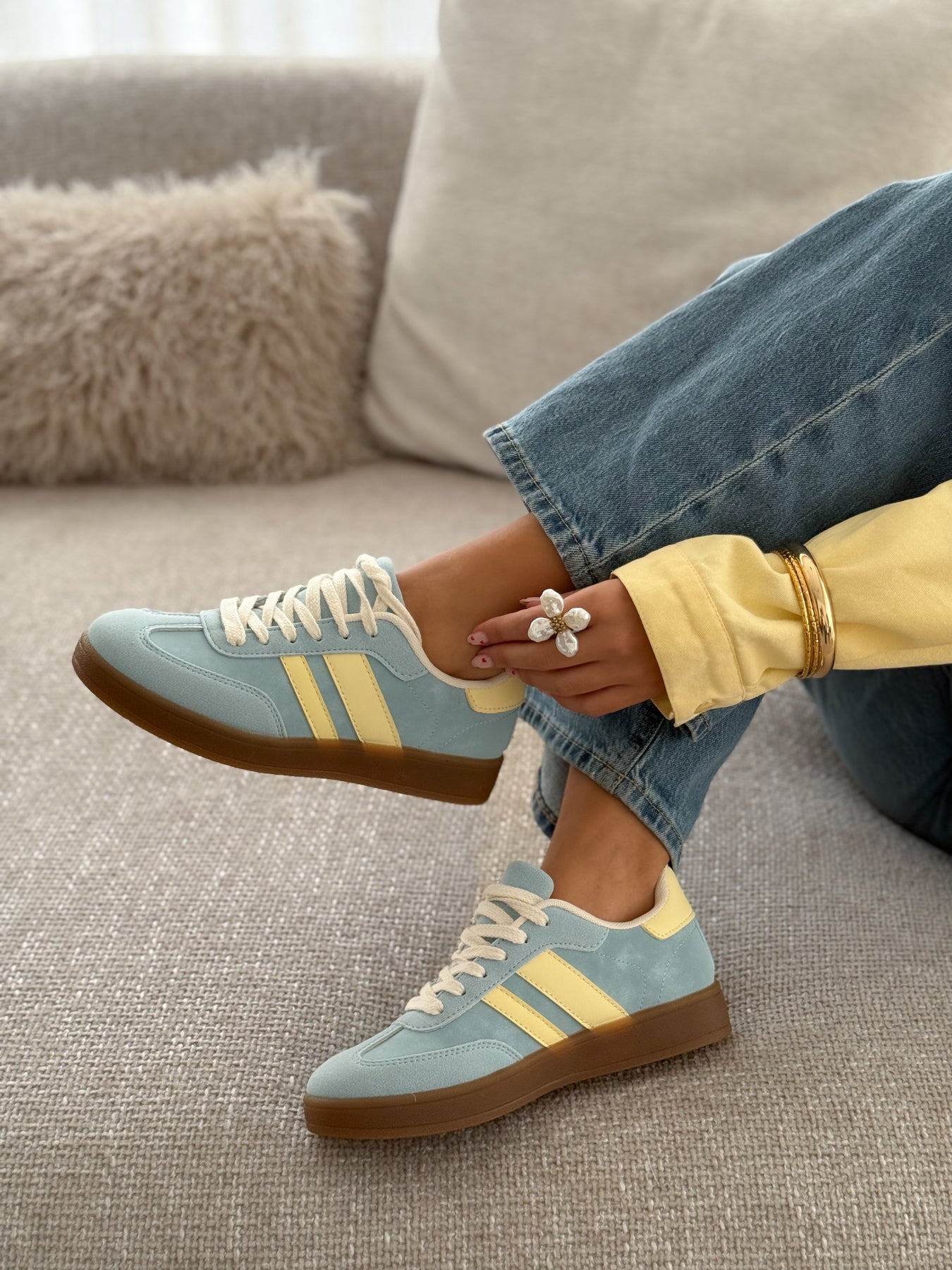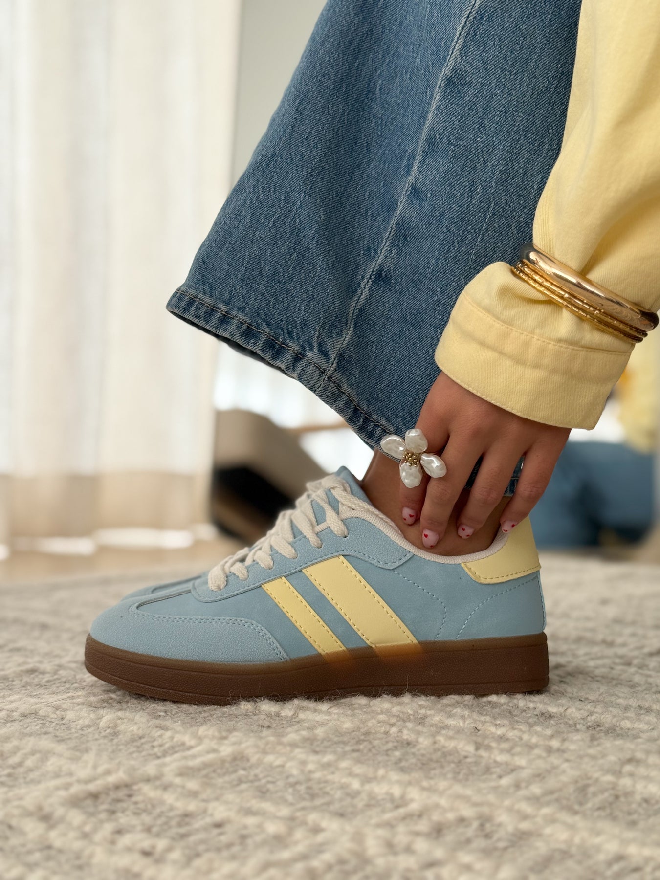 - Détails du modèle : Baskets basses à semelle gomme plate, design rétro revisité, bandes latérales contrastantes jaune pastel, lacets écrus, bout arrondi, style casual chic et lumineux