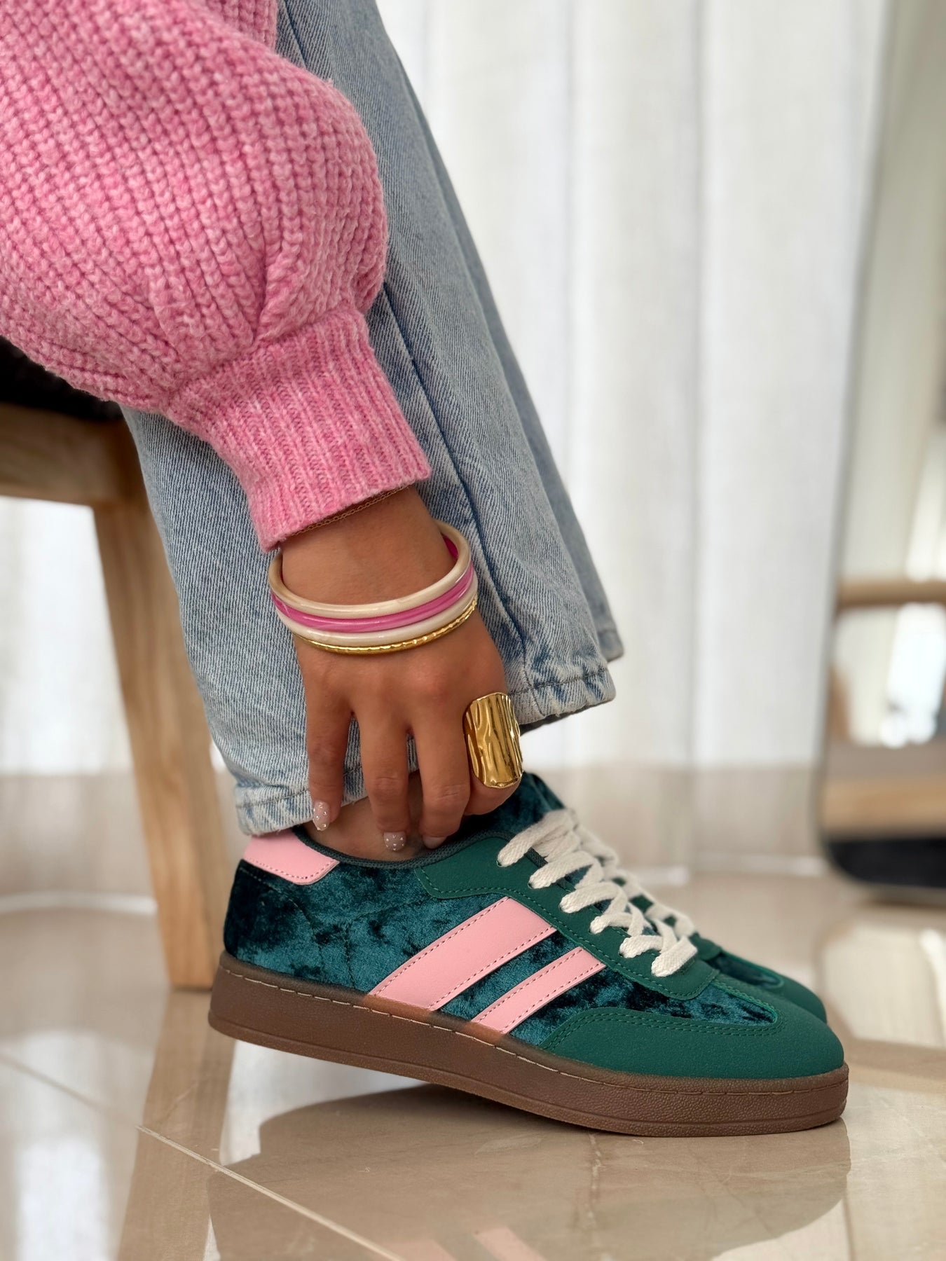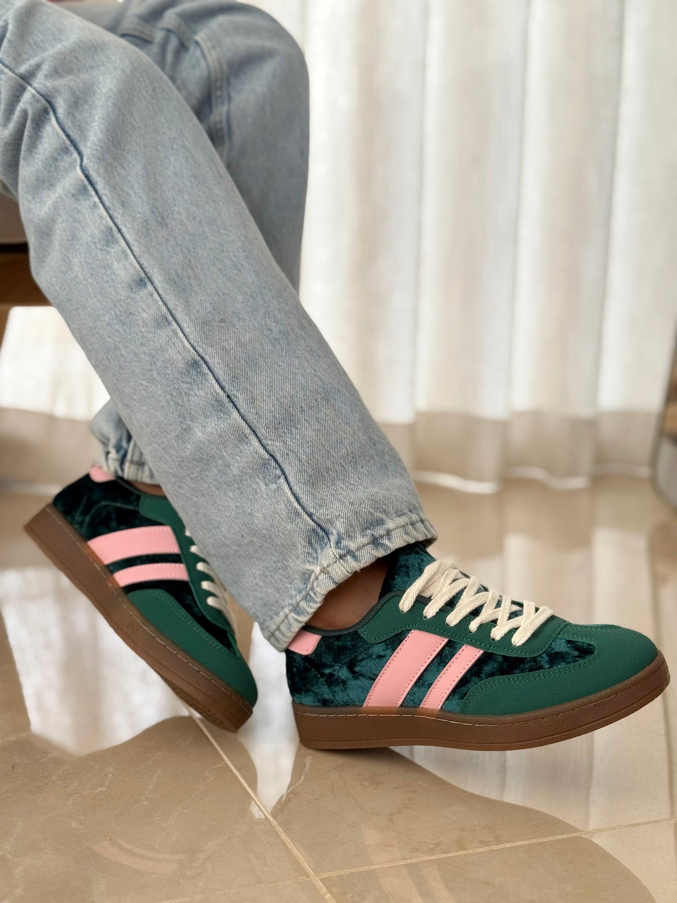 Craquez pour ces sneakers au style vintage affirmé ! Confectionnées en suédine douce, elles affichent une base vert contrastée par trois bandes rose pâle sur les côtés. Leur allure rétro est modernisée par un détail vert au talon, pour une touche originale et tendance.