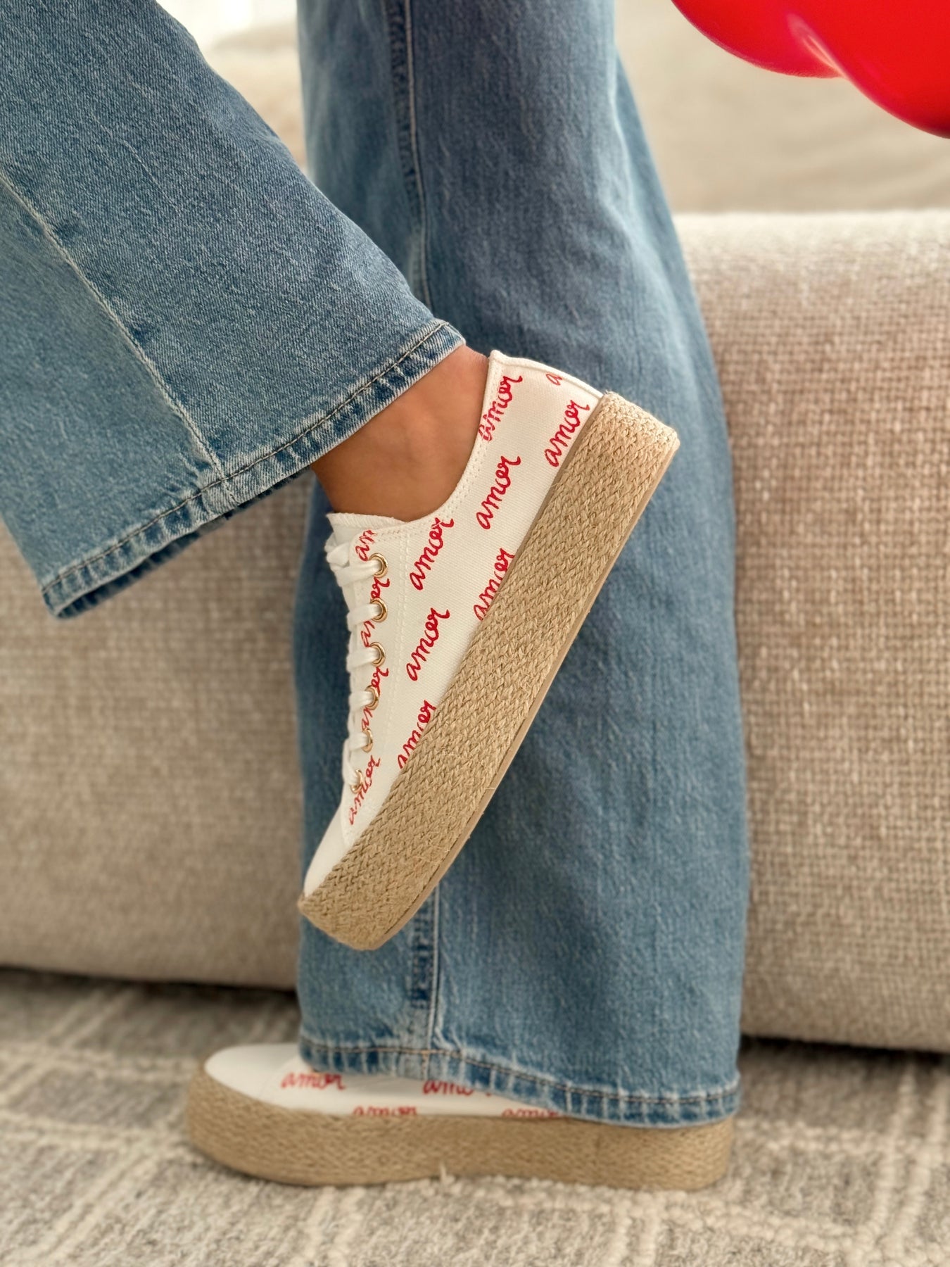 - Détails du modèle : Baskets basses à semelle effet espadrille, imprimé “amour” rouge répété, lacets blancs, œillets métalliques, silhouette légère et estivale, style casual romantique.