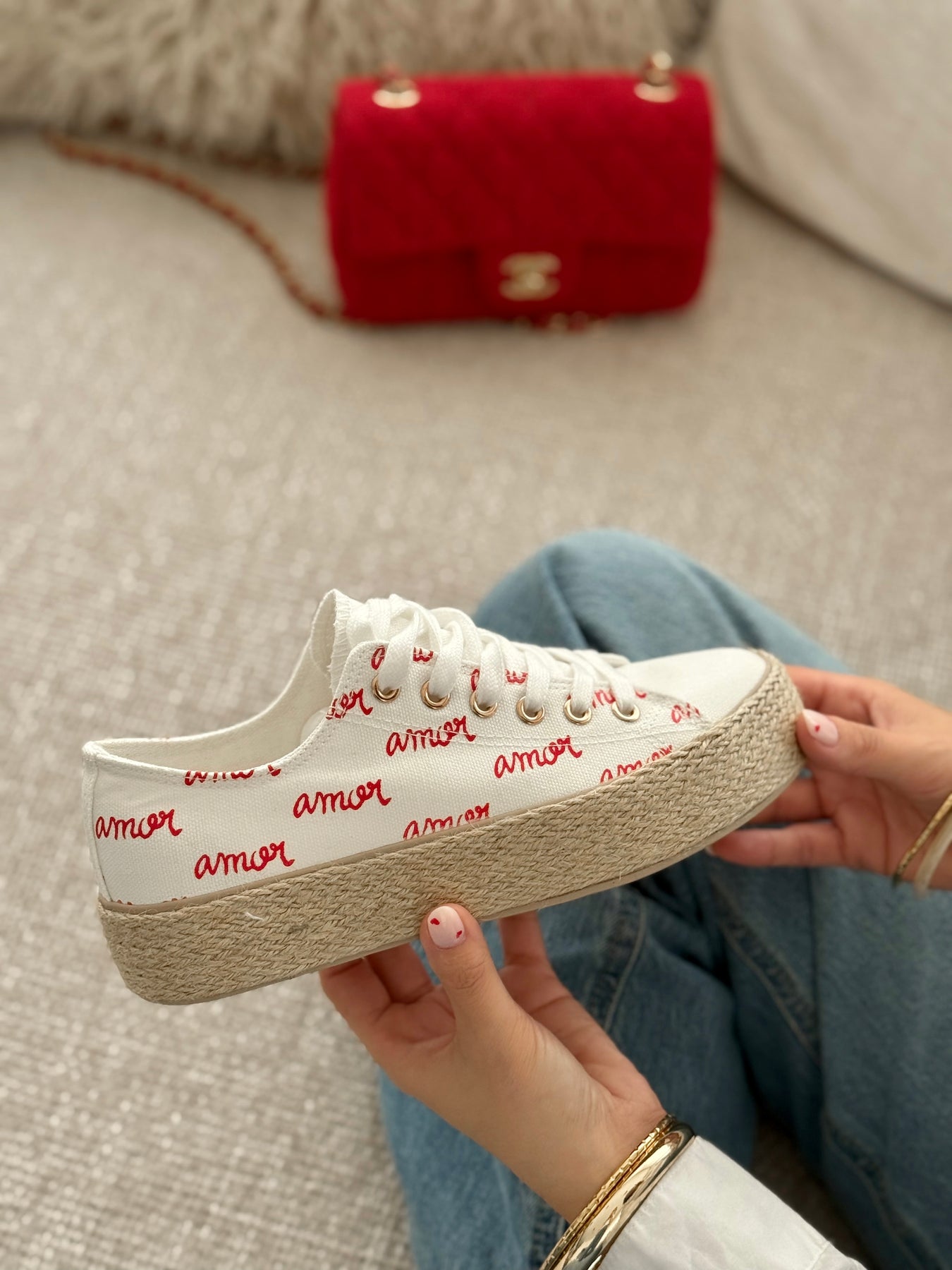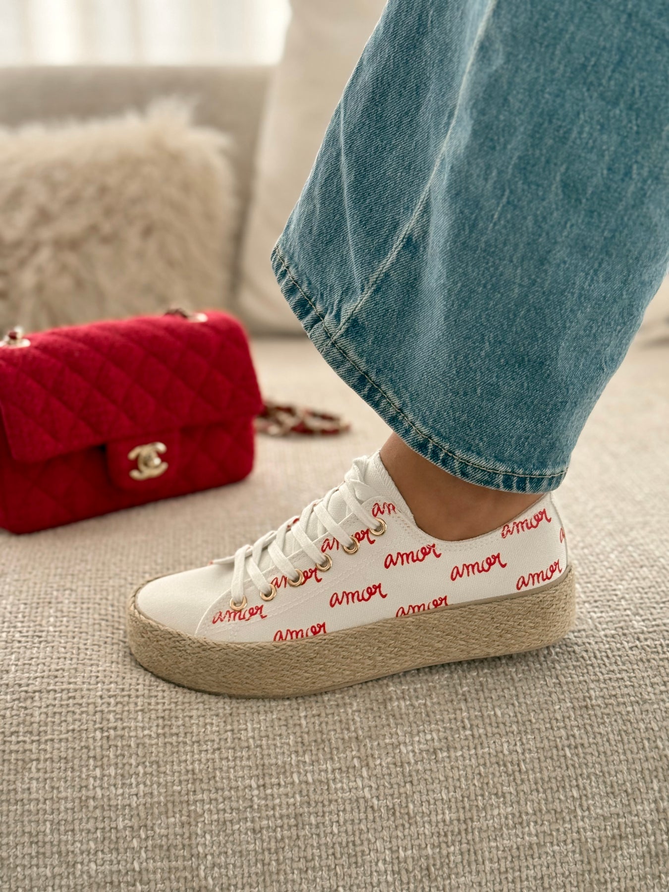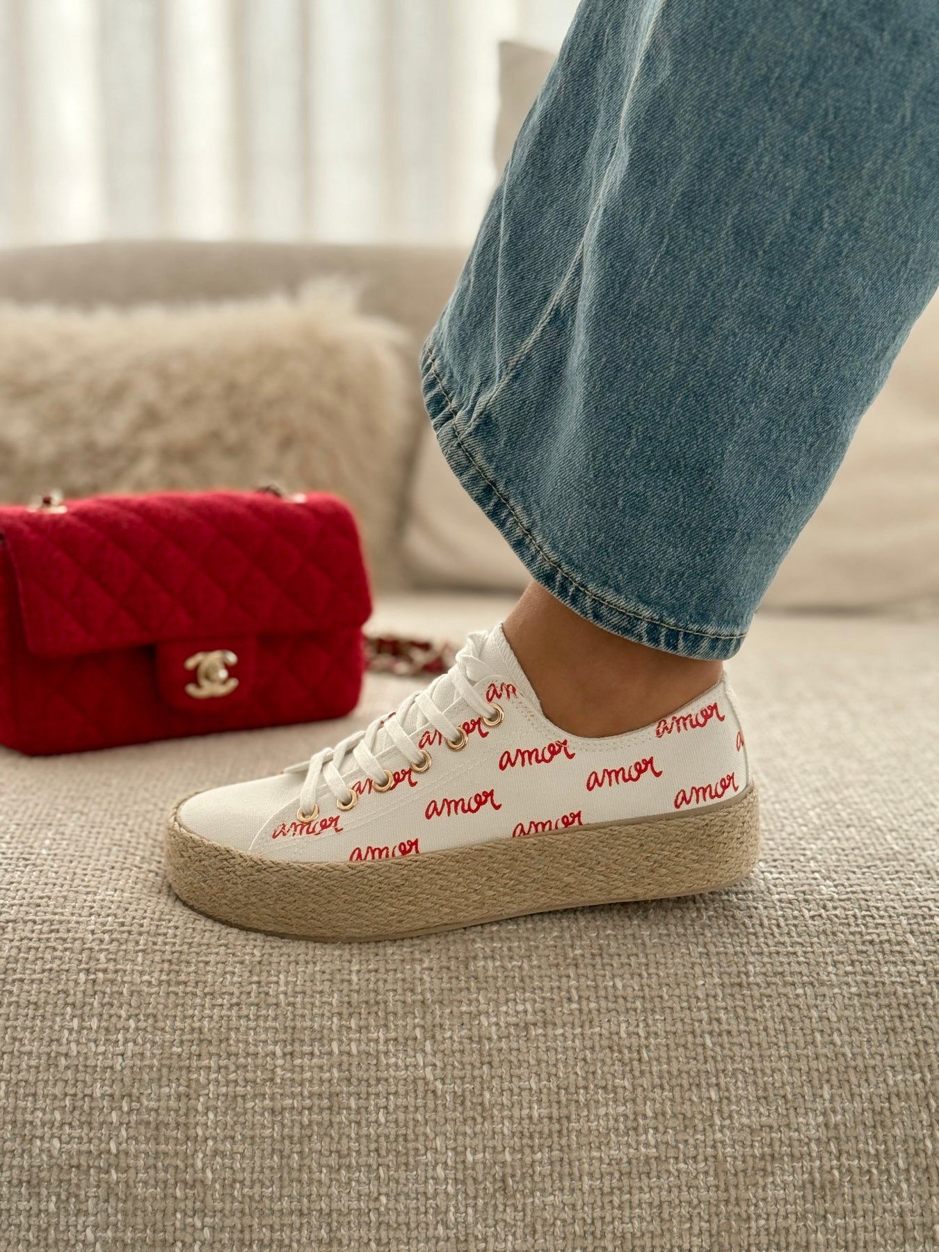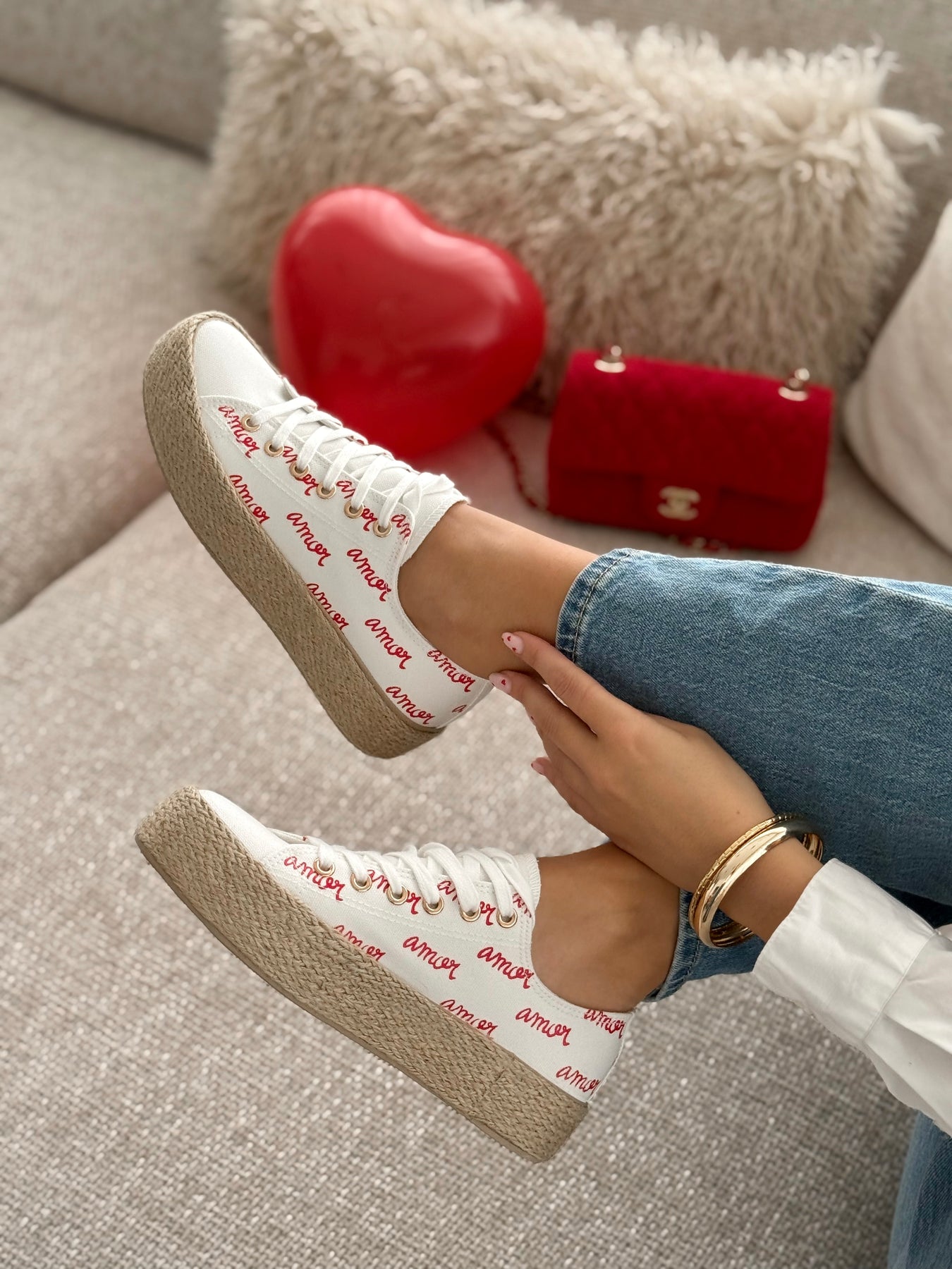 Les baskets Lova respirent la douceur et la bonne humeur. Leur base blanche lumineuse est délicatement réveillée par l’inscription “amour” en rouge, pour un look à la fois tendre, féminin et plein de charme. La semelle en corde apporte une touche estivale irrésistible et un confort parfait pour accompagner vos journées ensoleillées. Faciles à porter, elles s’associent aussi bien à un jean qu’à une robe légère pour un style casual chic à l’esprit vacances.