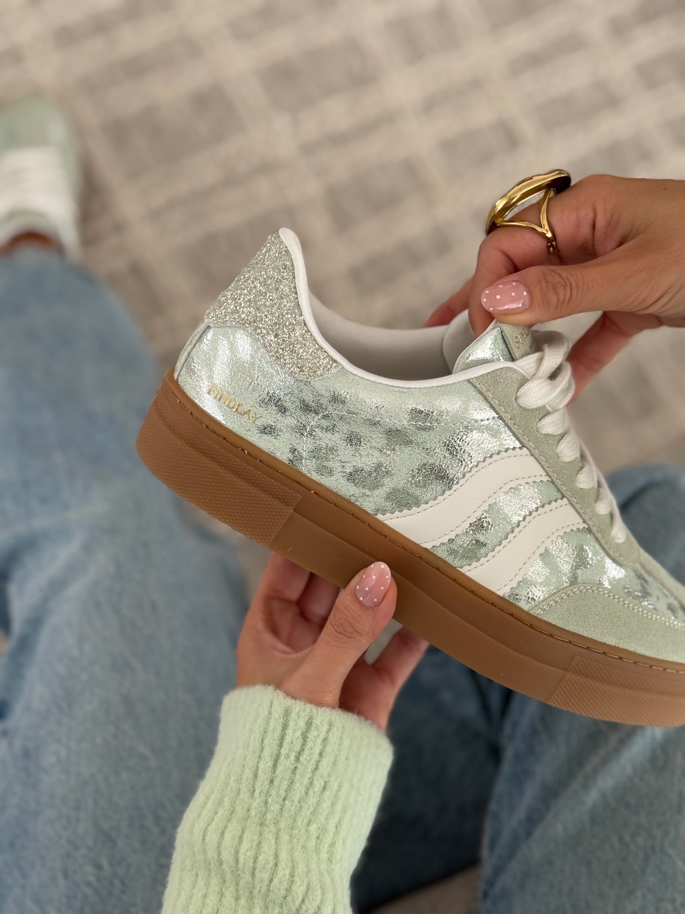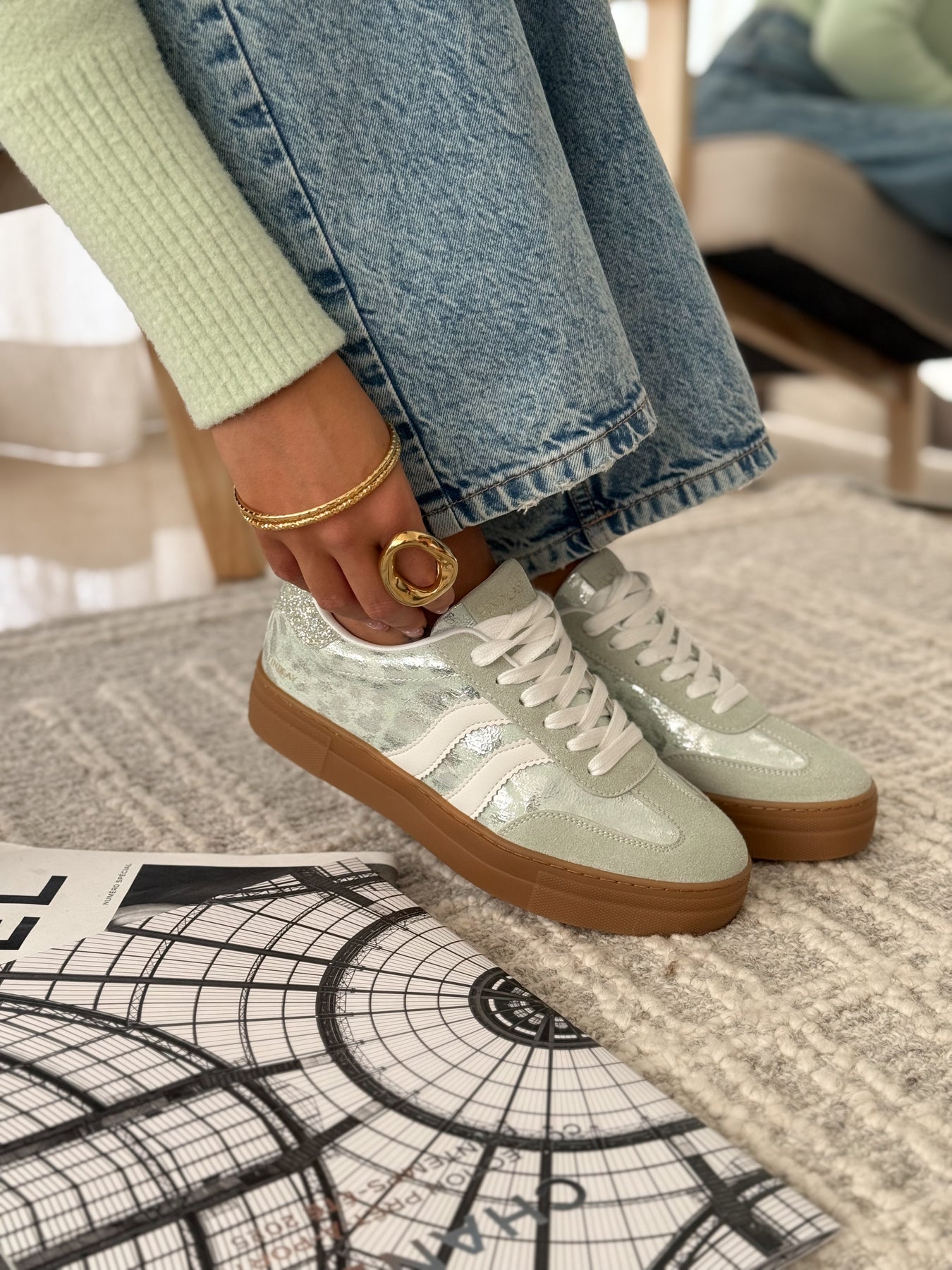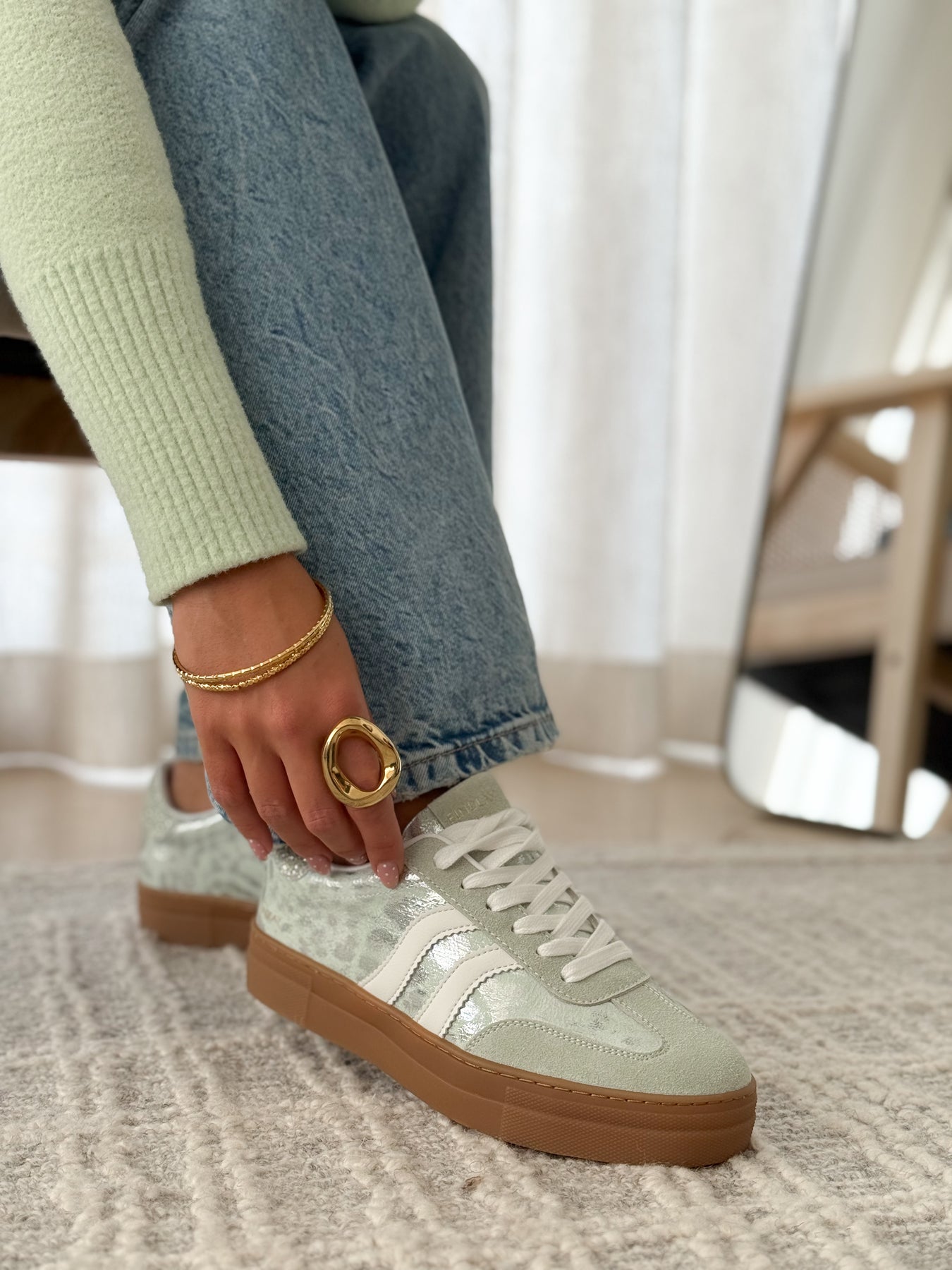 Les baskets Manuella apportent une touche de fraîcheur et de lumière à vos looks. Leur teinte vert d’eau associée à des finitions légèrement brillantes crée un style à la fois doux et moderne. Une paire parfaite pour illuminer une tenue tout en restant facile à porter au quotidien.