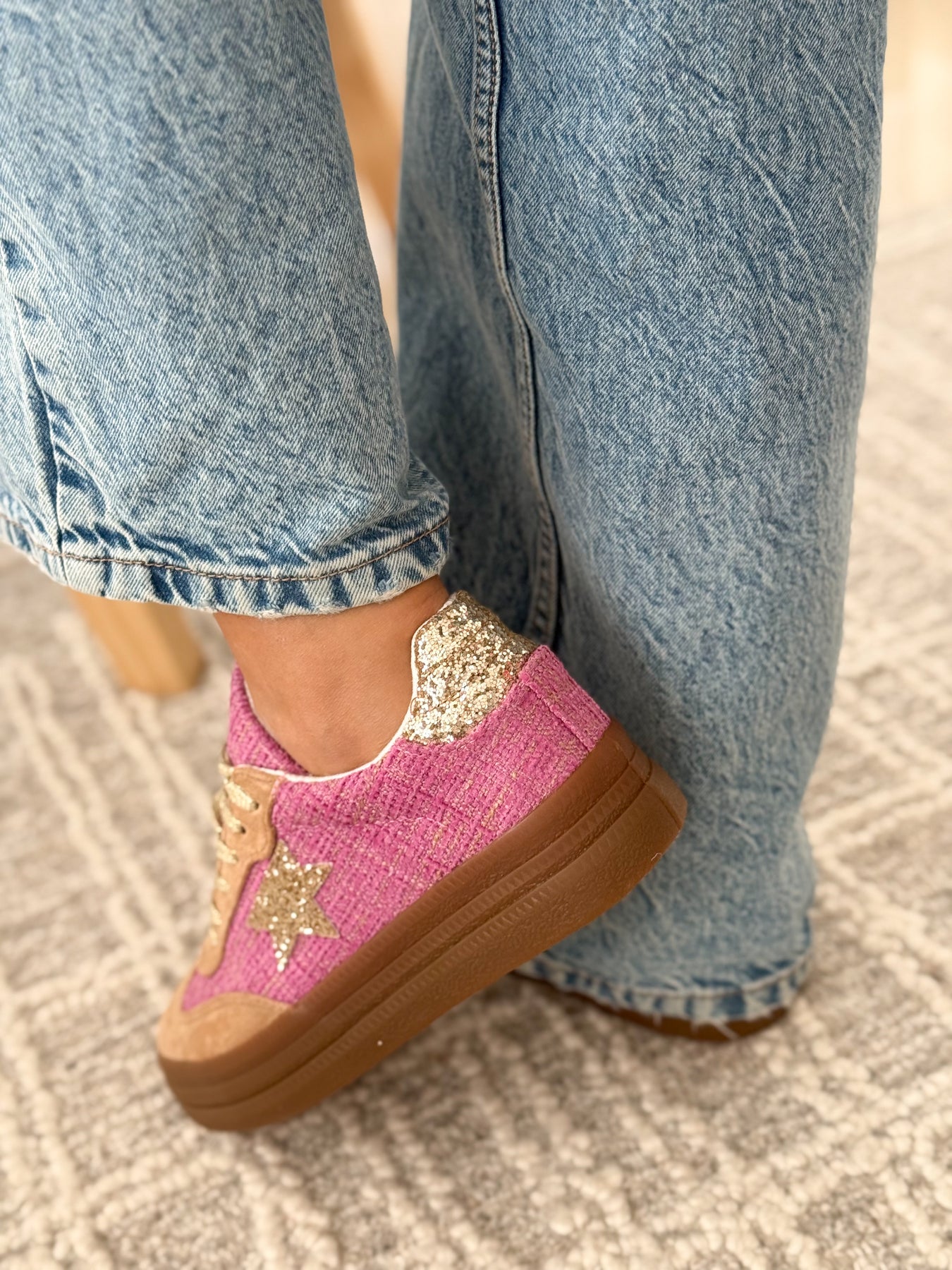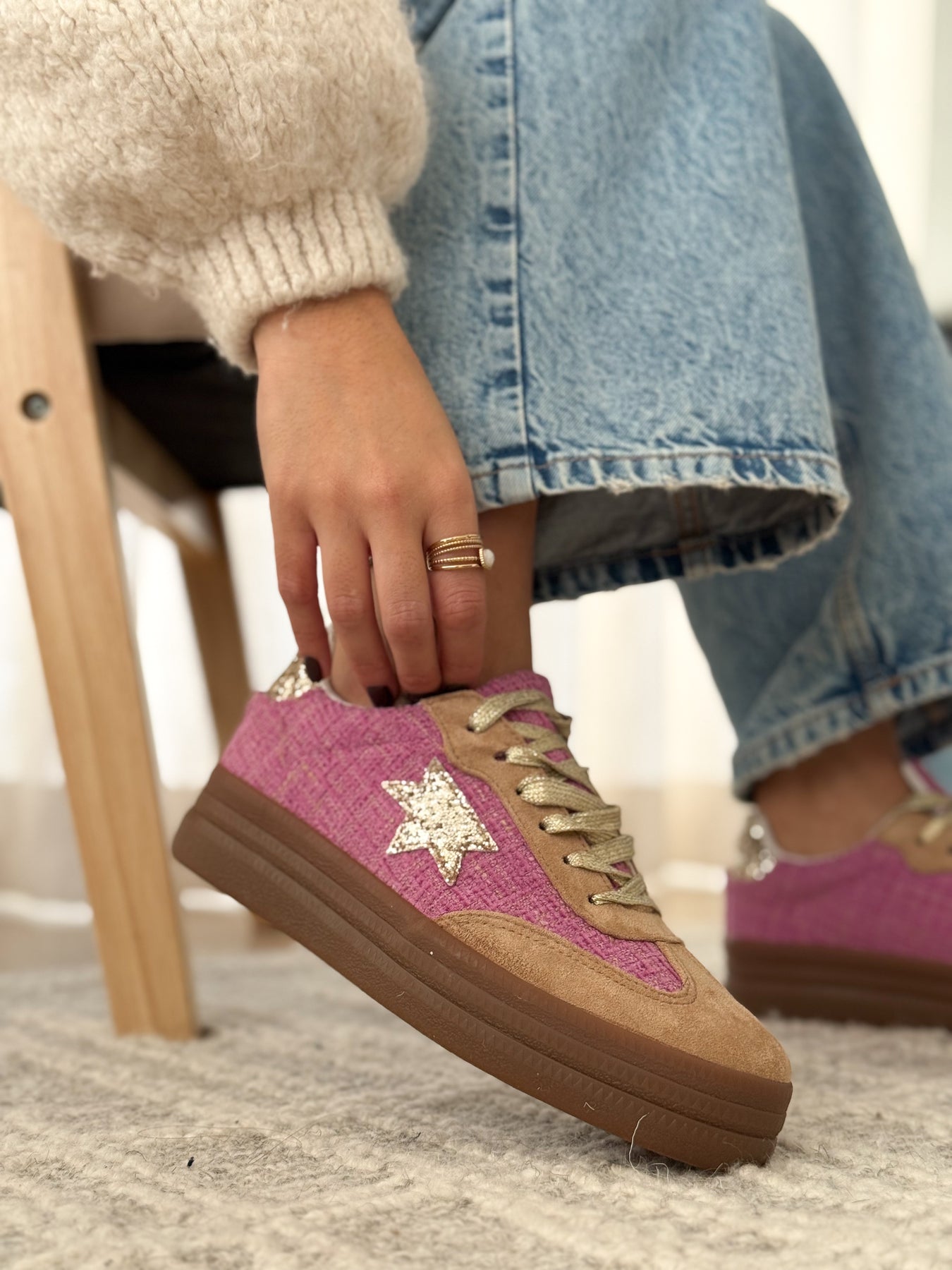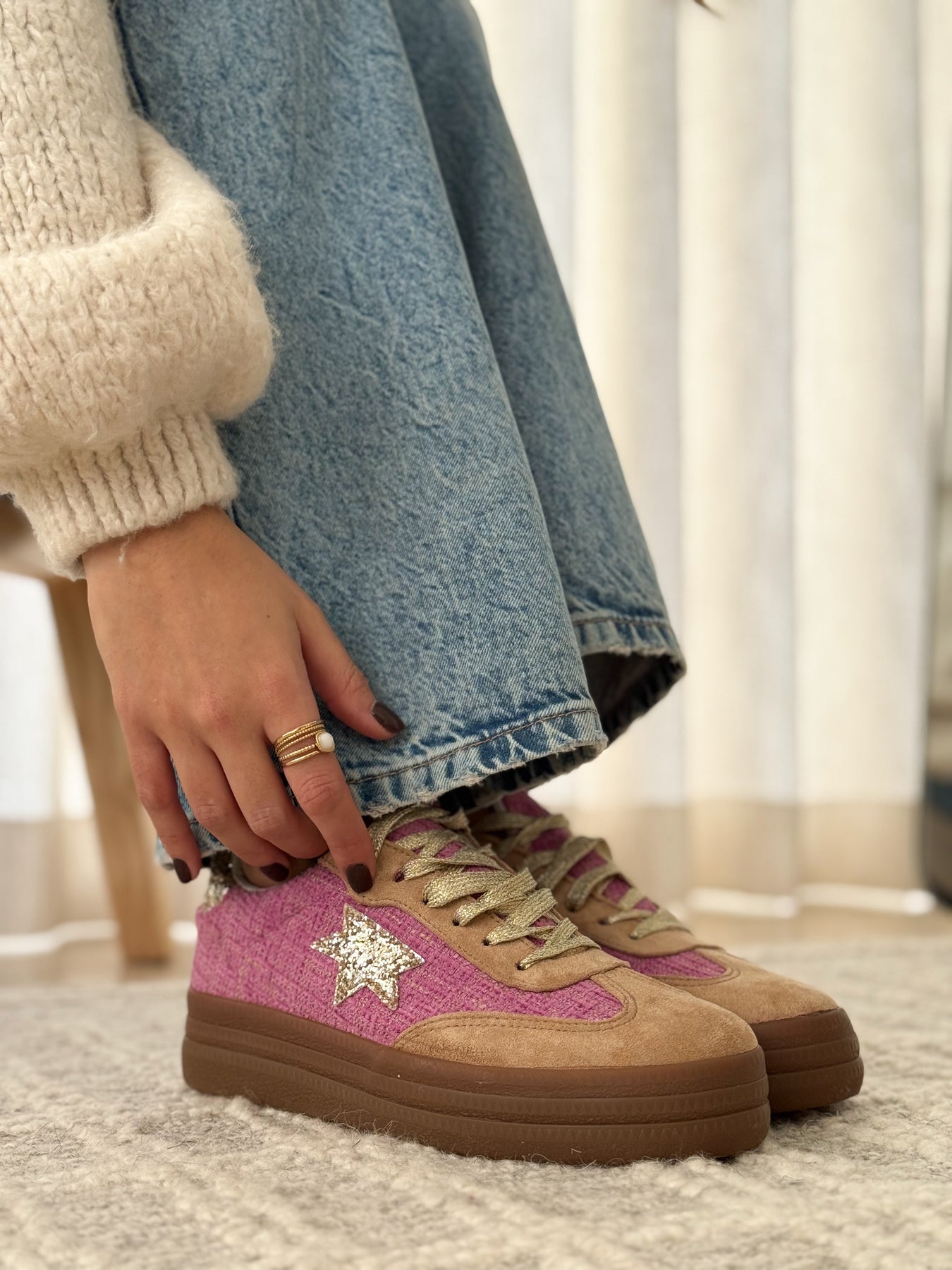 - Détails du modèle : étoile glitter champagne, arrière pailleté, lacets dorés, renfort suédine beige, tweed rose texturé, semelle camel tendance