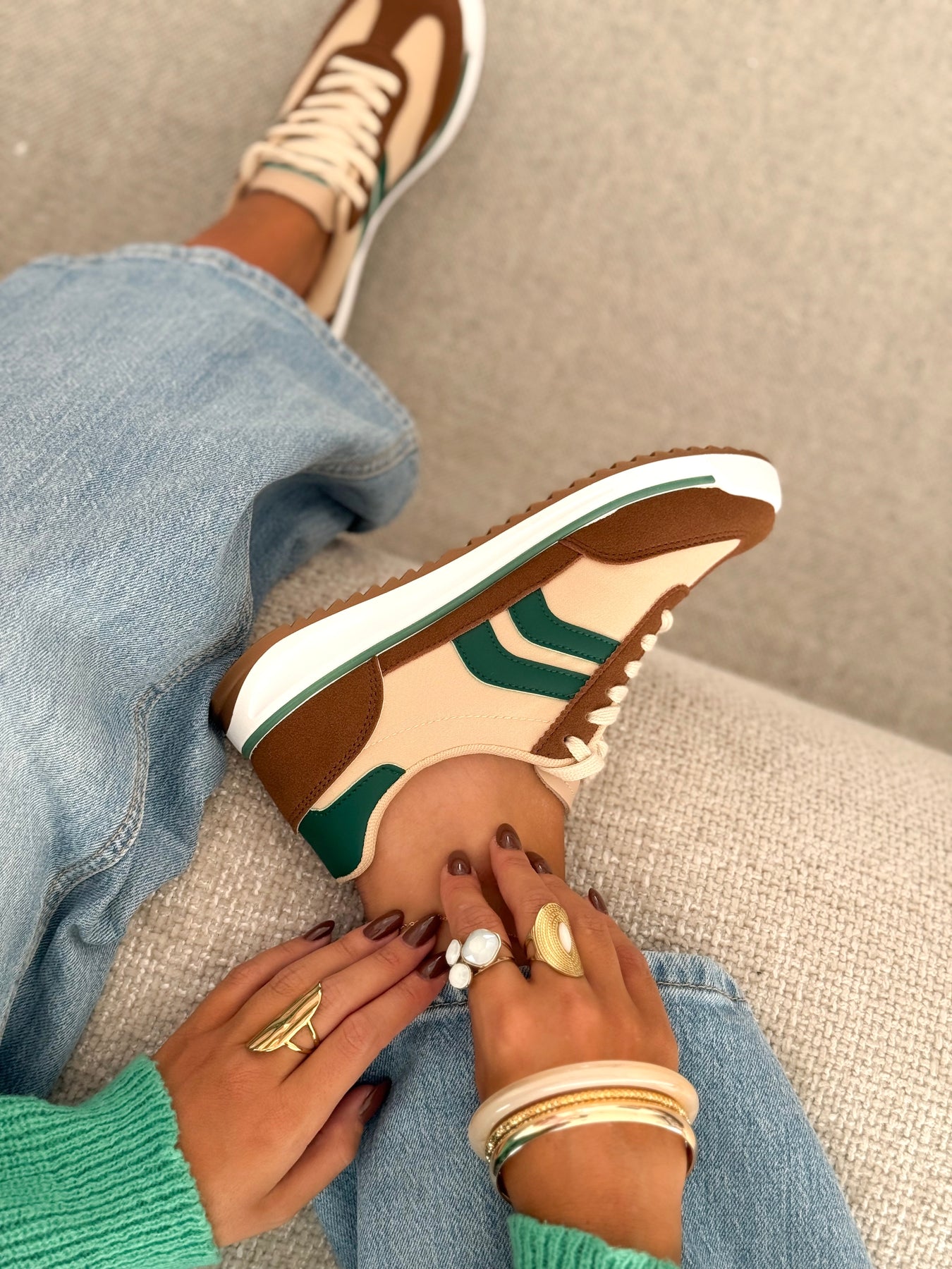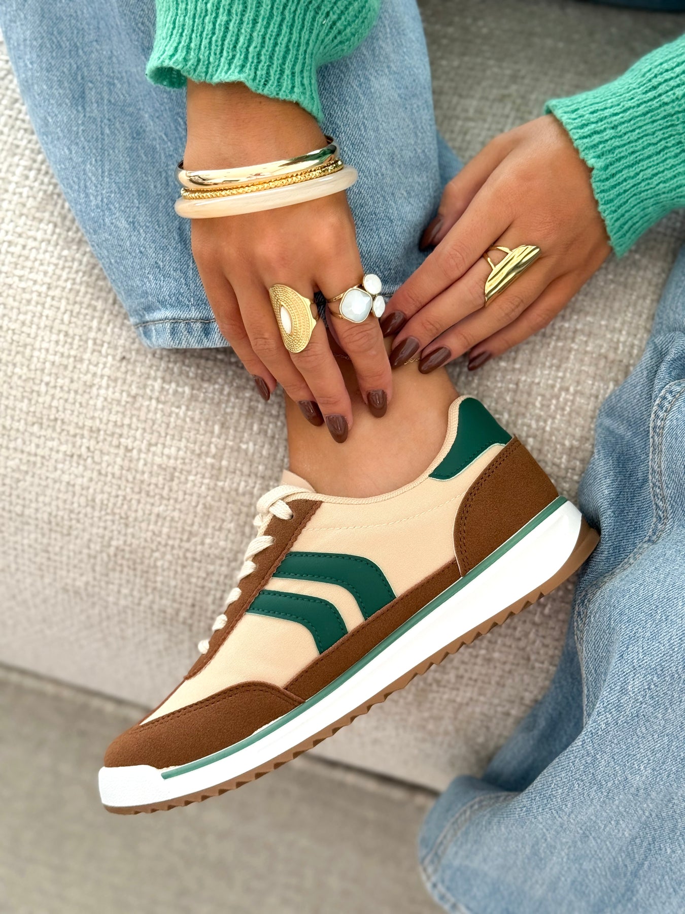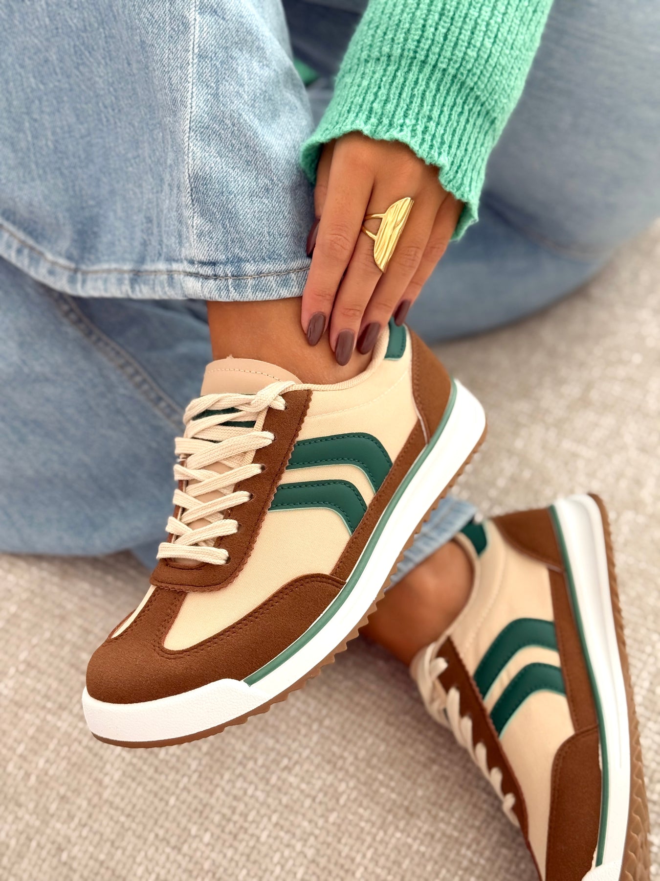 Ces sneakers au style rétro combinent des teintes naturelles et tendance : beige sable lumineux, marron chaleureux et vert profond. Leur silhouette sportive vintage est remise au goût du jour grâce à une semelle contrastée qui assure confort et stabilité. Faciles à porter, elles se marient aussi bien avec un jean décontracté qu’avec une jupe midi ou un pantalon cargo pour un look casual chic.