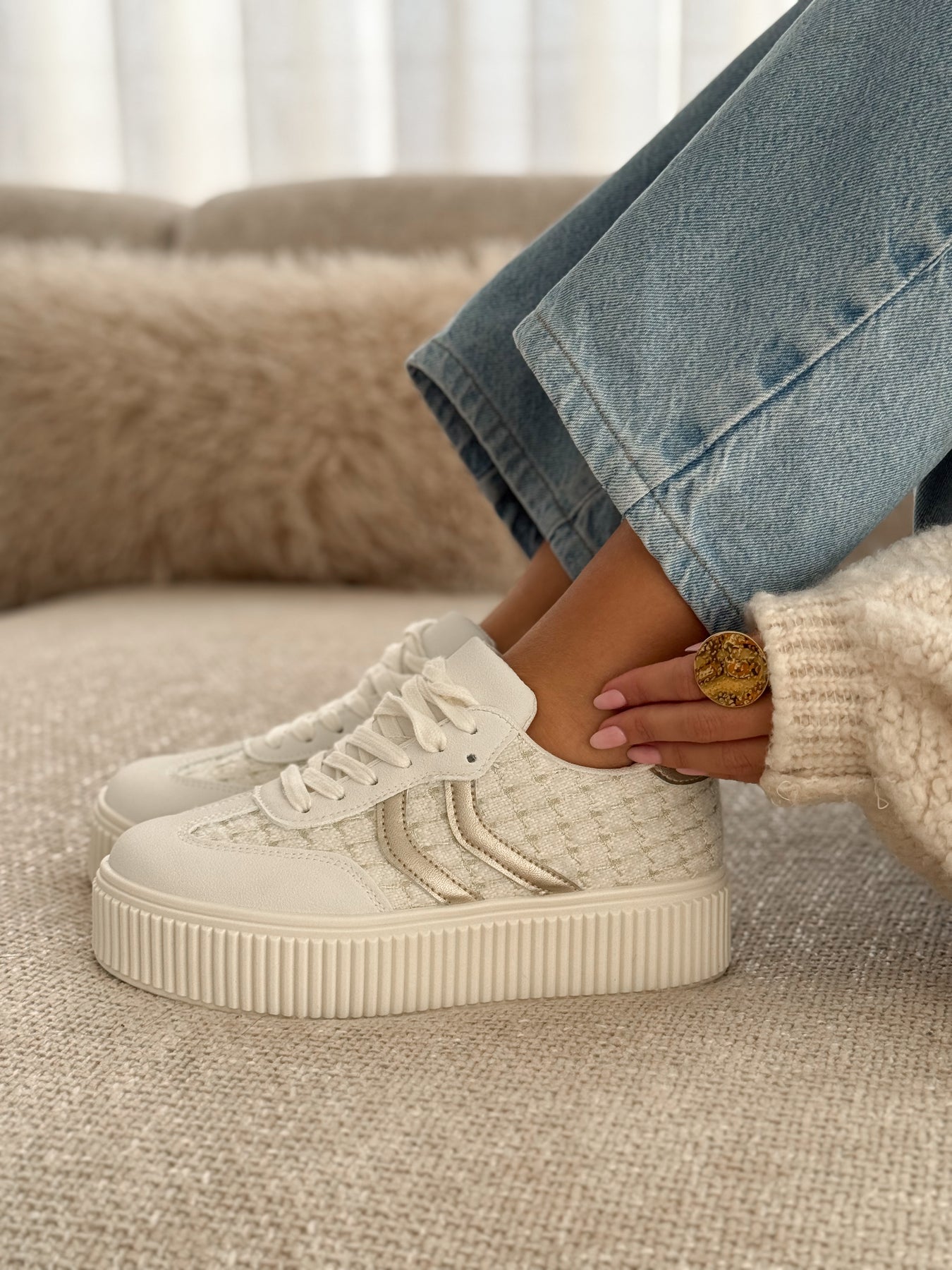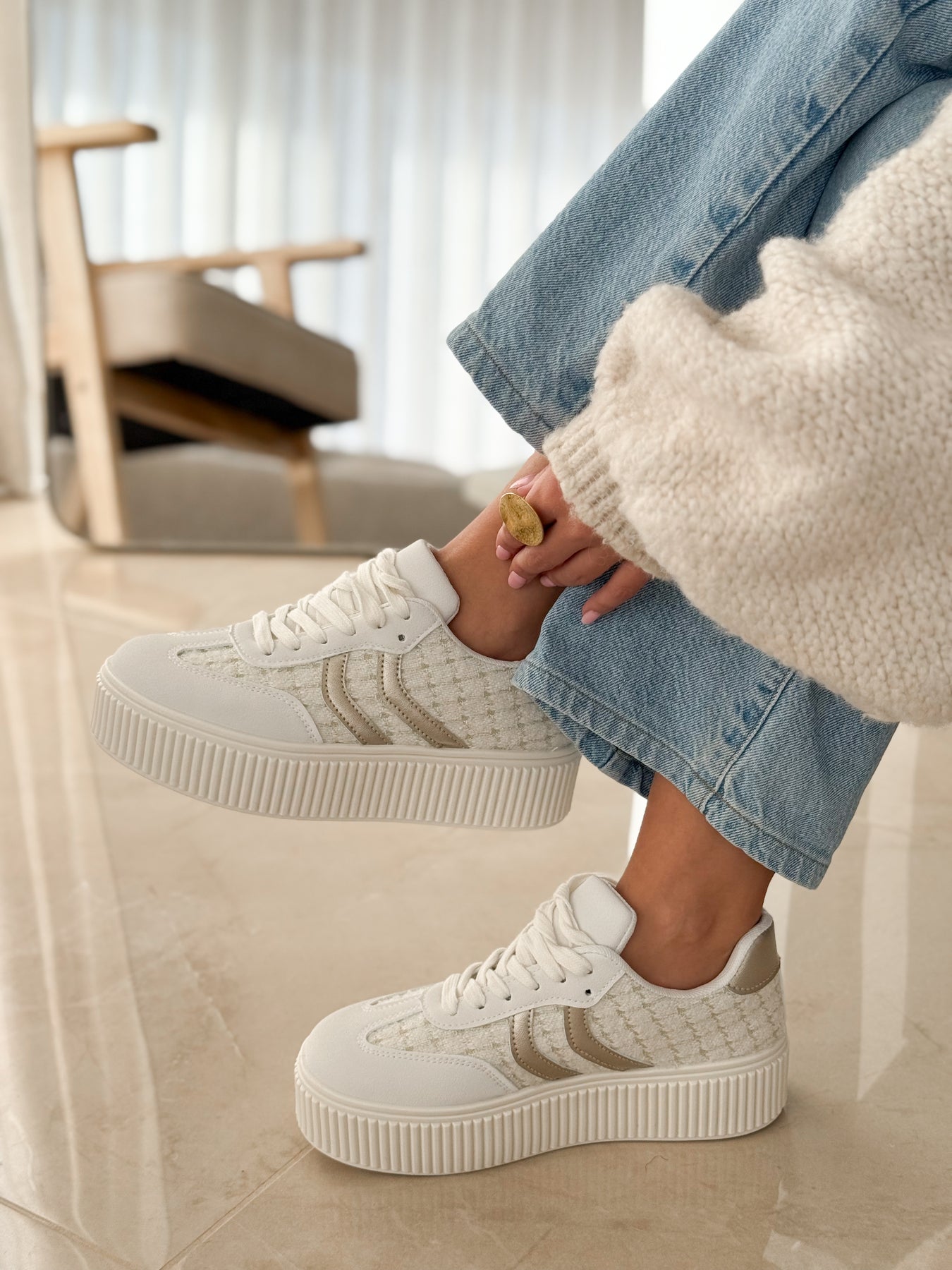 - Détails du modèle :  empiècements texturés effet tweed, bandes latérales ton sur ton, semelle plateforme striée, lacets écrus, style chic et lumineux