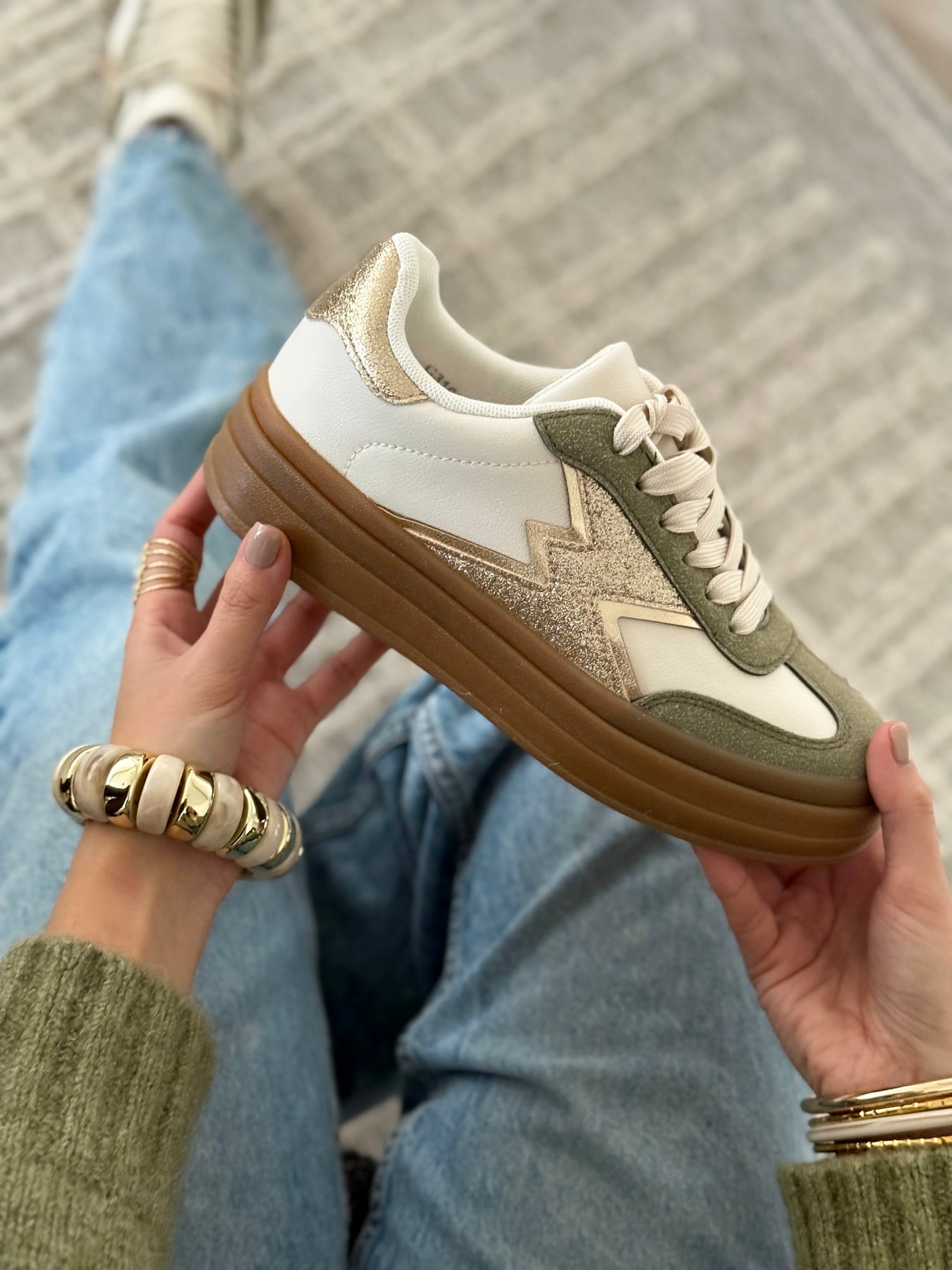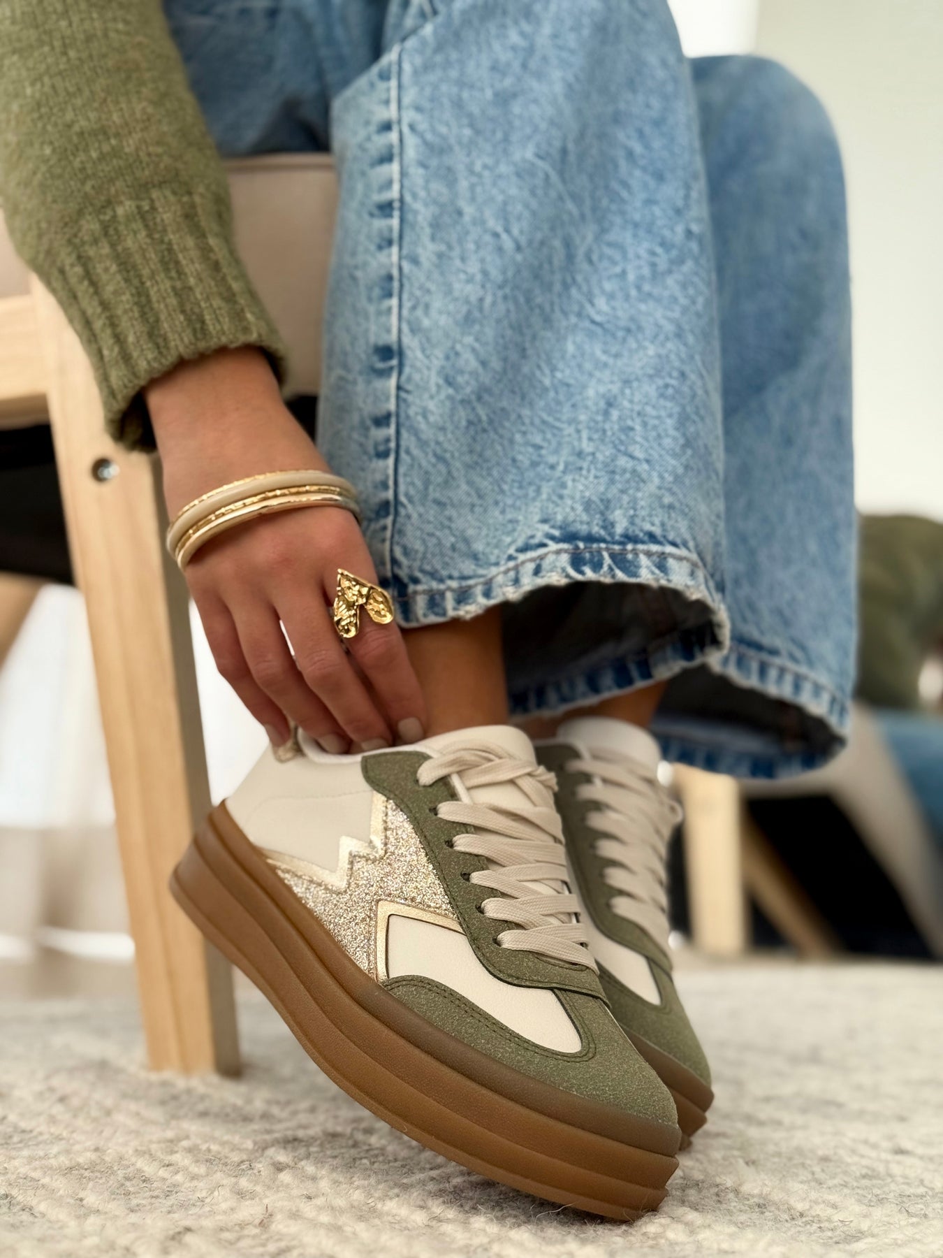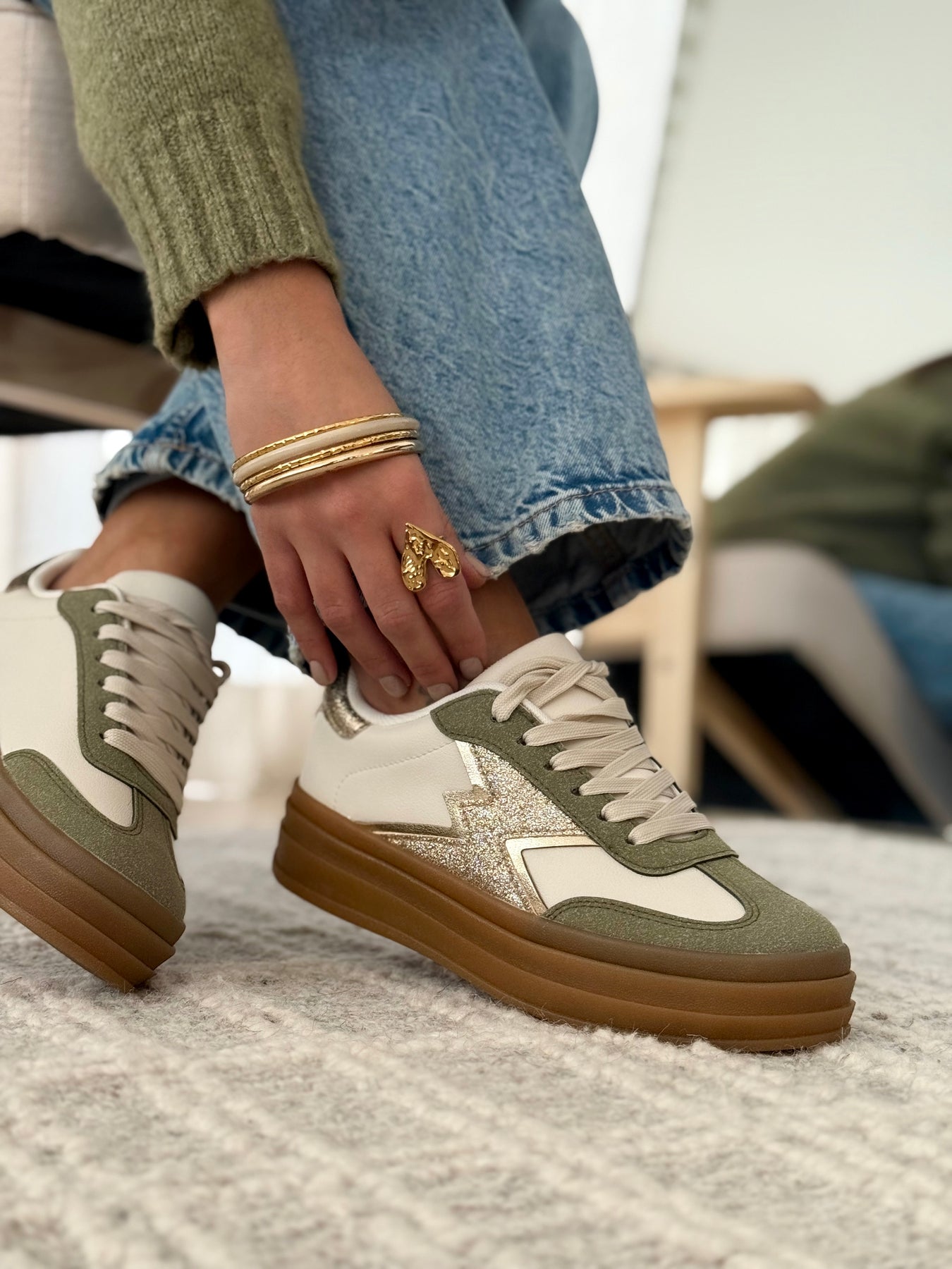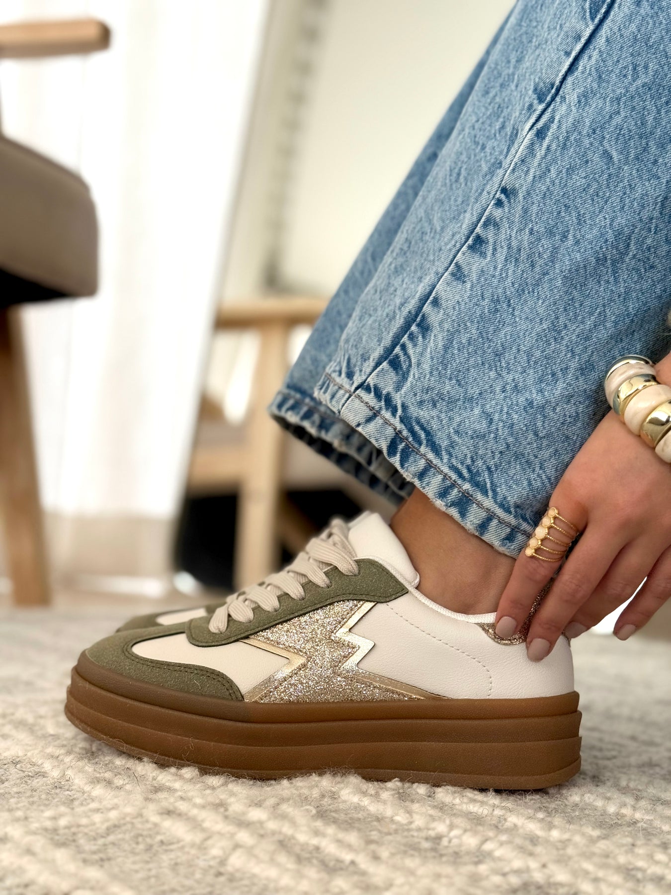 - Détails du modèle : Éclair latéral doré pailleté, bouts et empiècements kaki, base crème, lacets beiges, semelle plateforme caramel, renfort talon doré brillant, finition sporty-chic élégante
