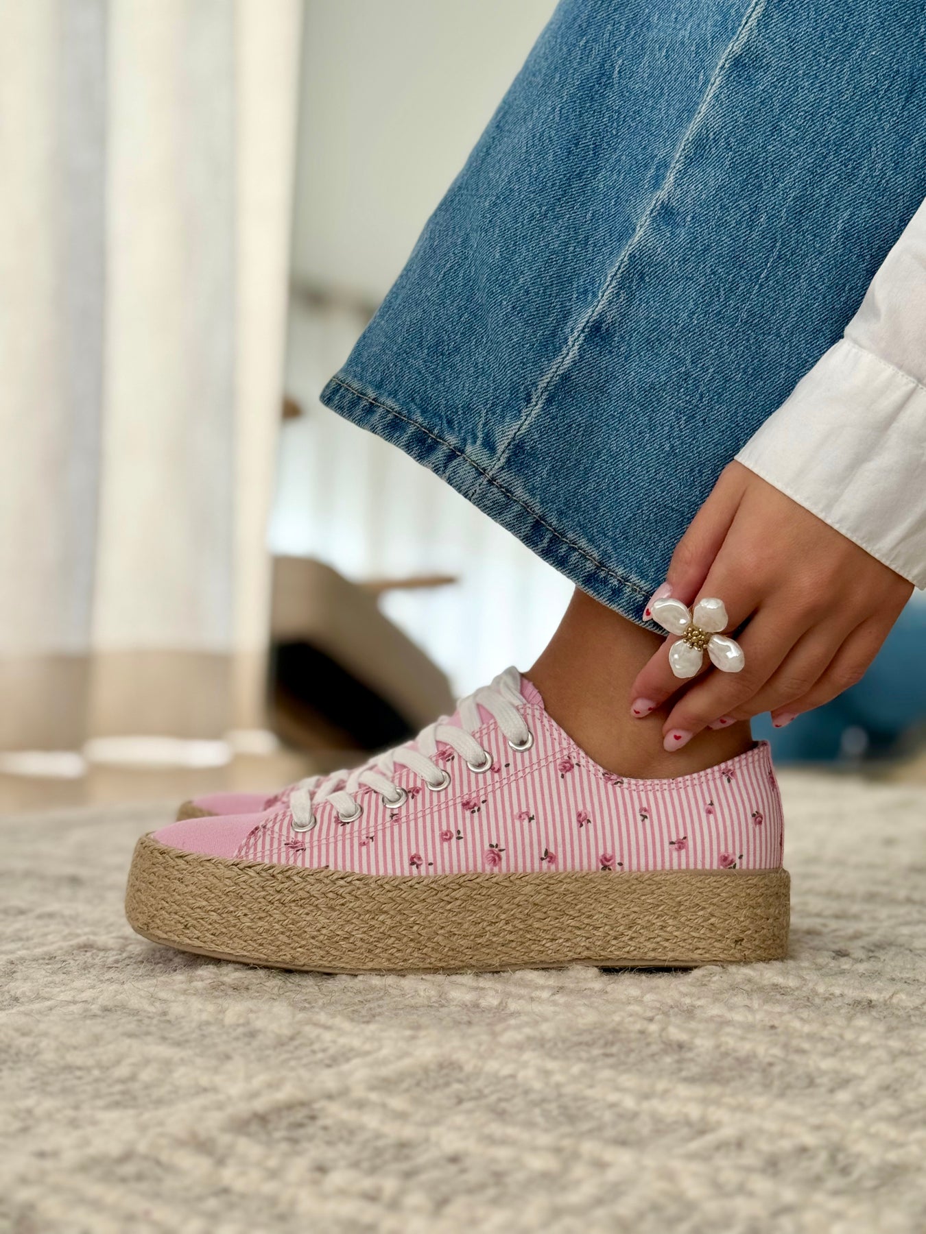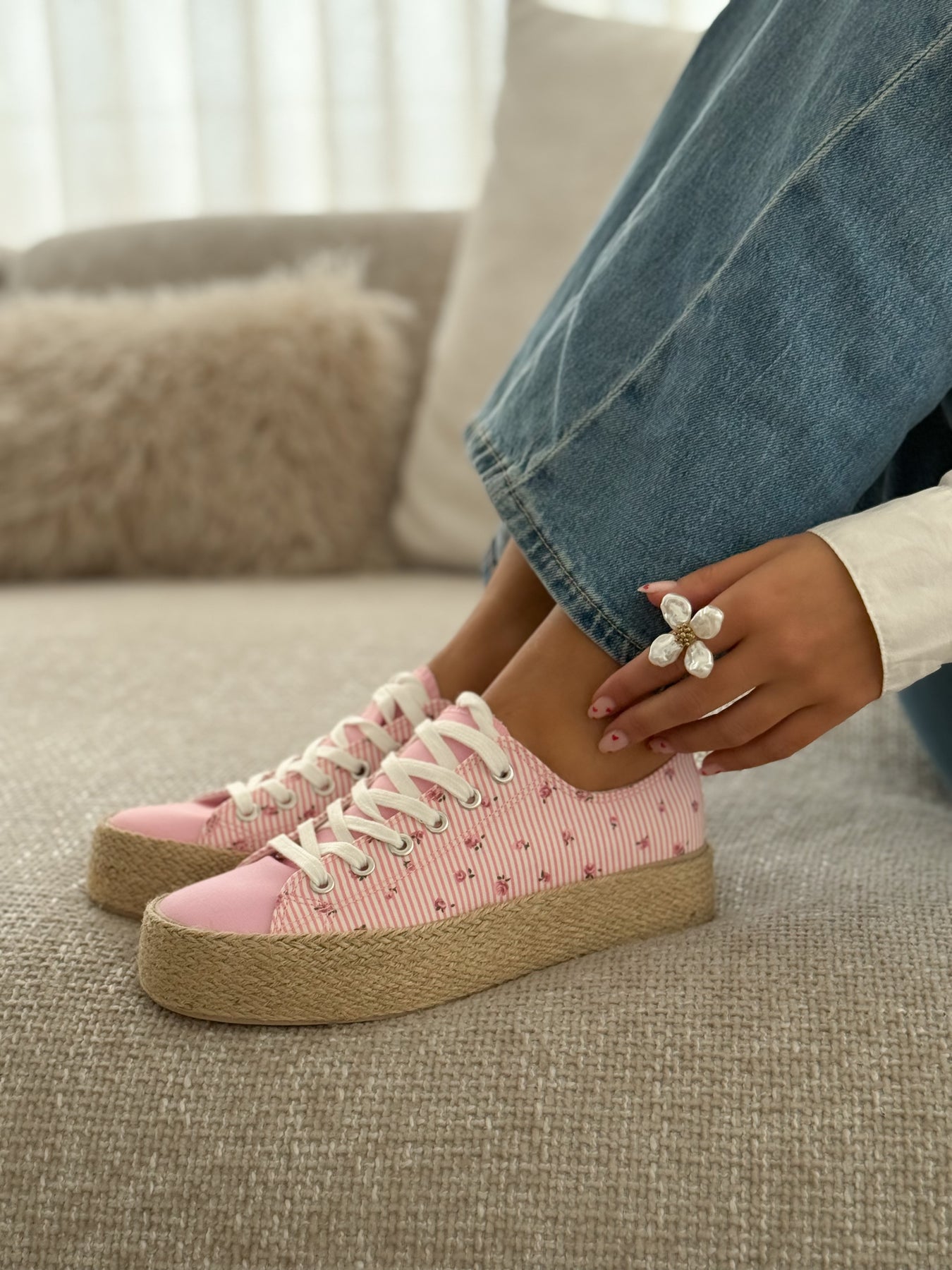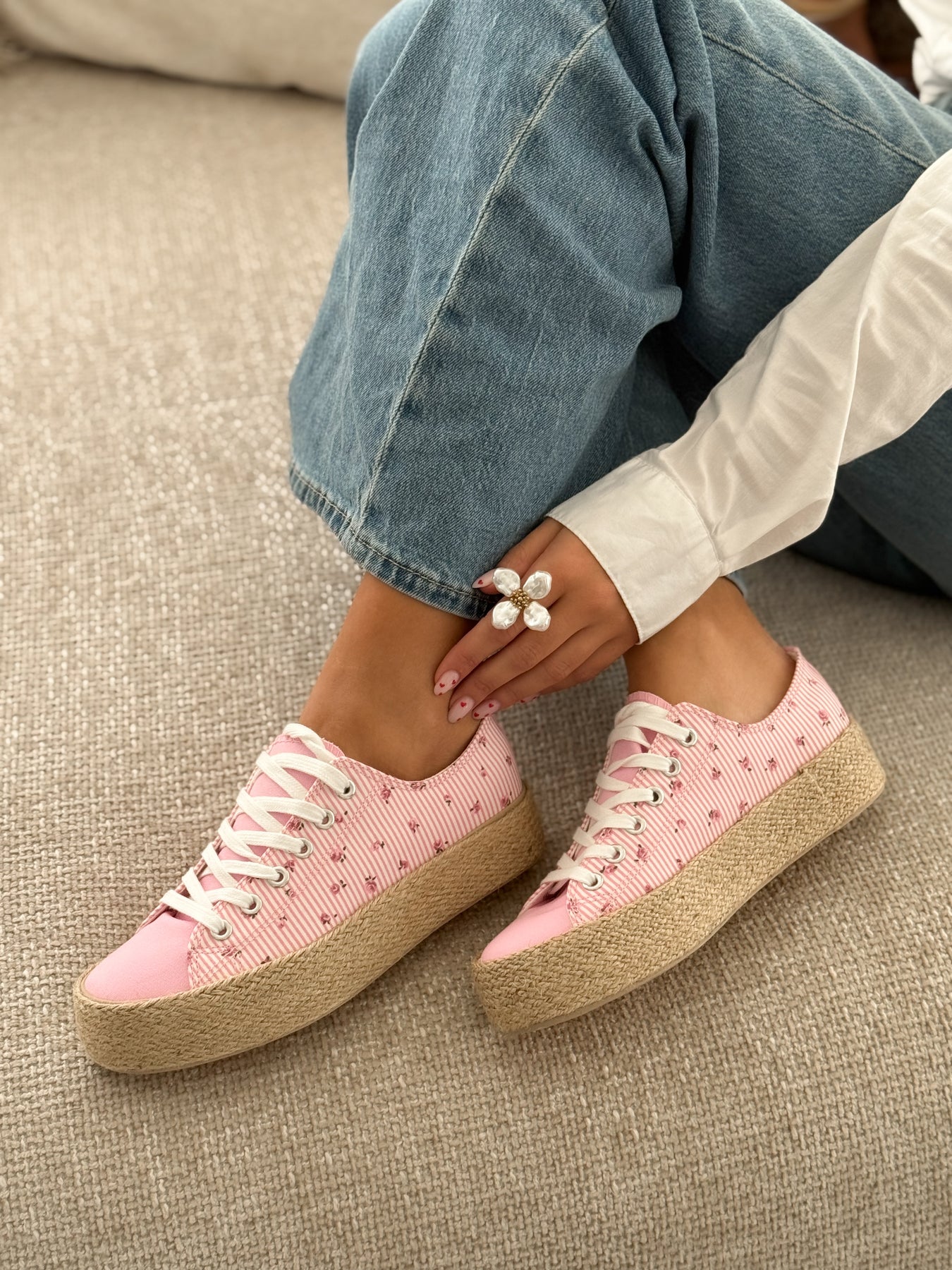 - Détails du modèle : Baskets basses esprit espadrille, toile rayée rose et blanche rehaussée de petits motifs fleuris, bout avant lisse contrastant, lacets blancs, semelle plateforme en corde tressée, allure douce et estivale