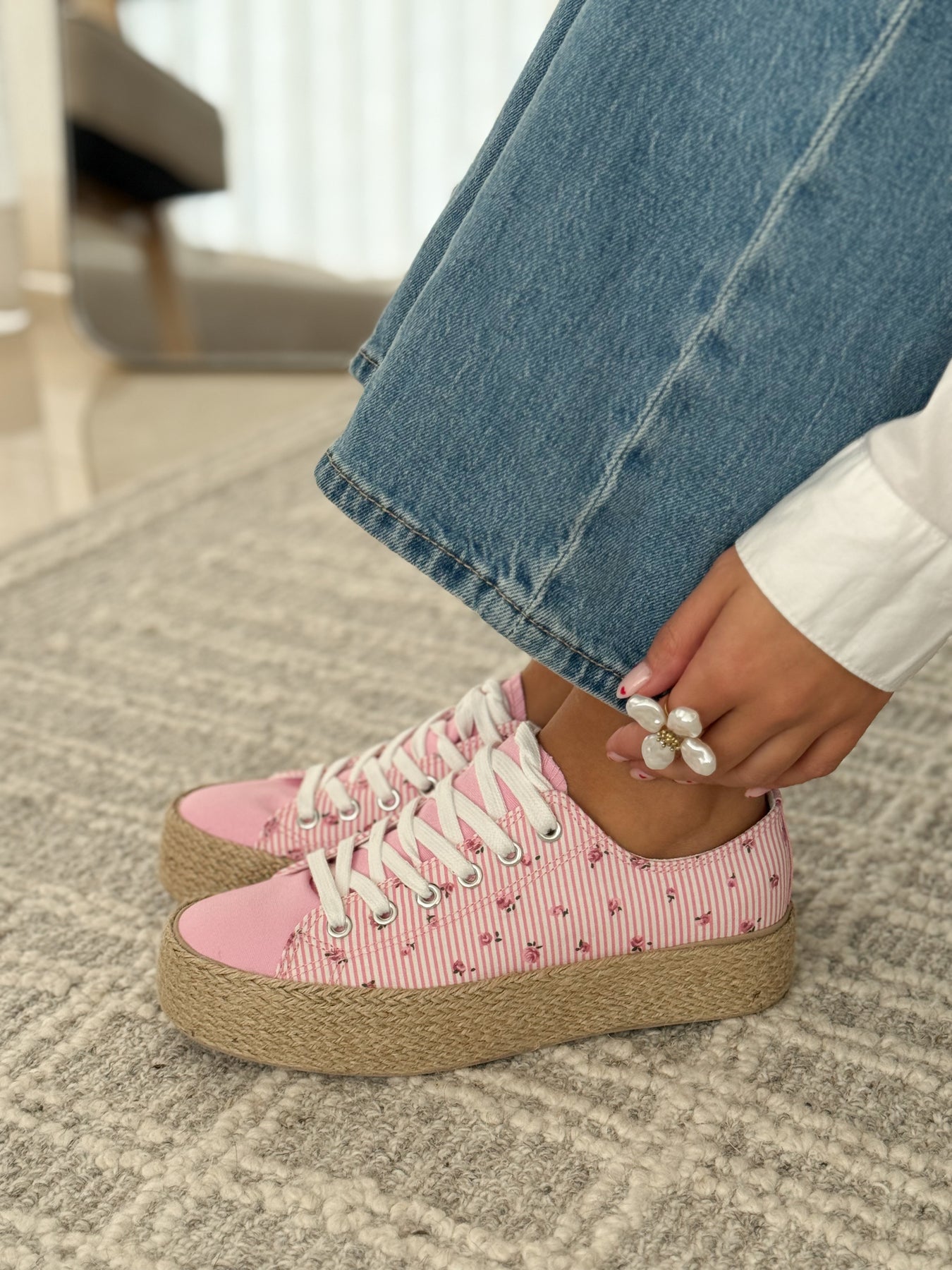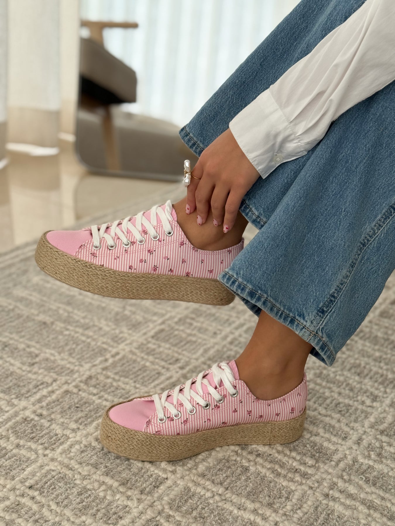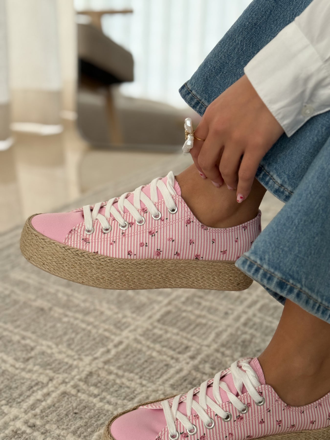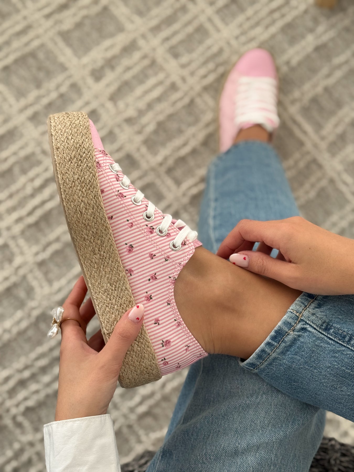 - Détails du modèle : Baskets basses esprit espadrille, toile rayée rose et blanche rehaussée de petits motifs fleuris, bout avant lisse contrastant, lacets blancs, semelle plateforme en corde tressée, allure douce et estivale